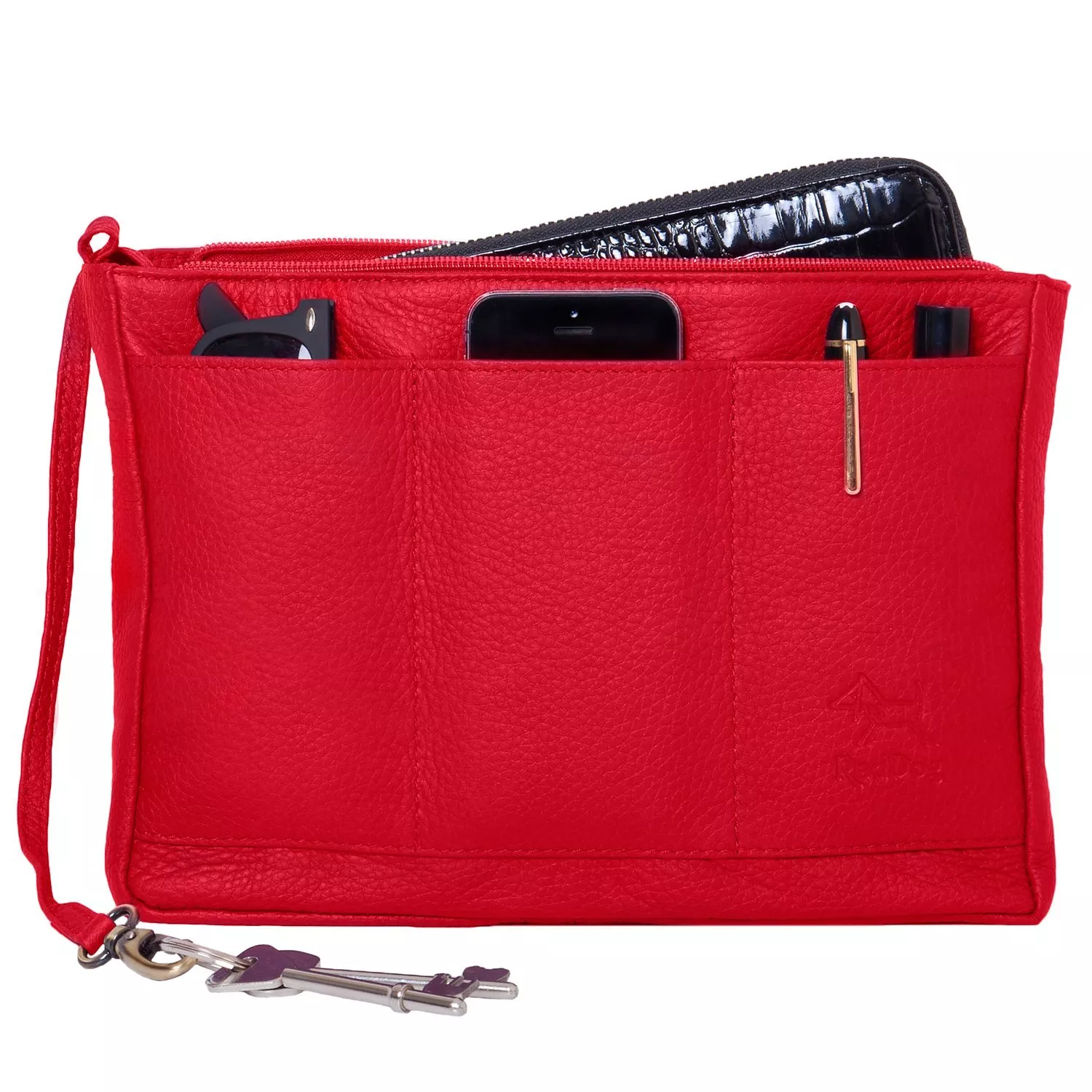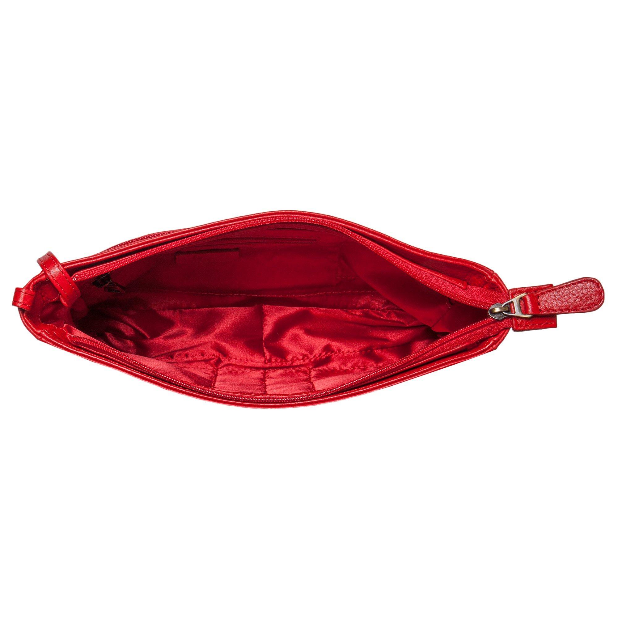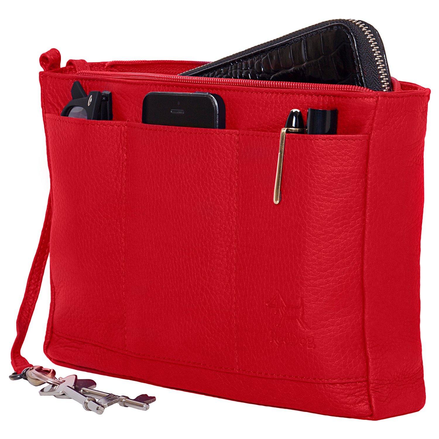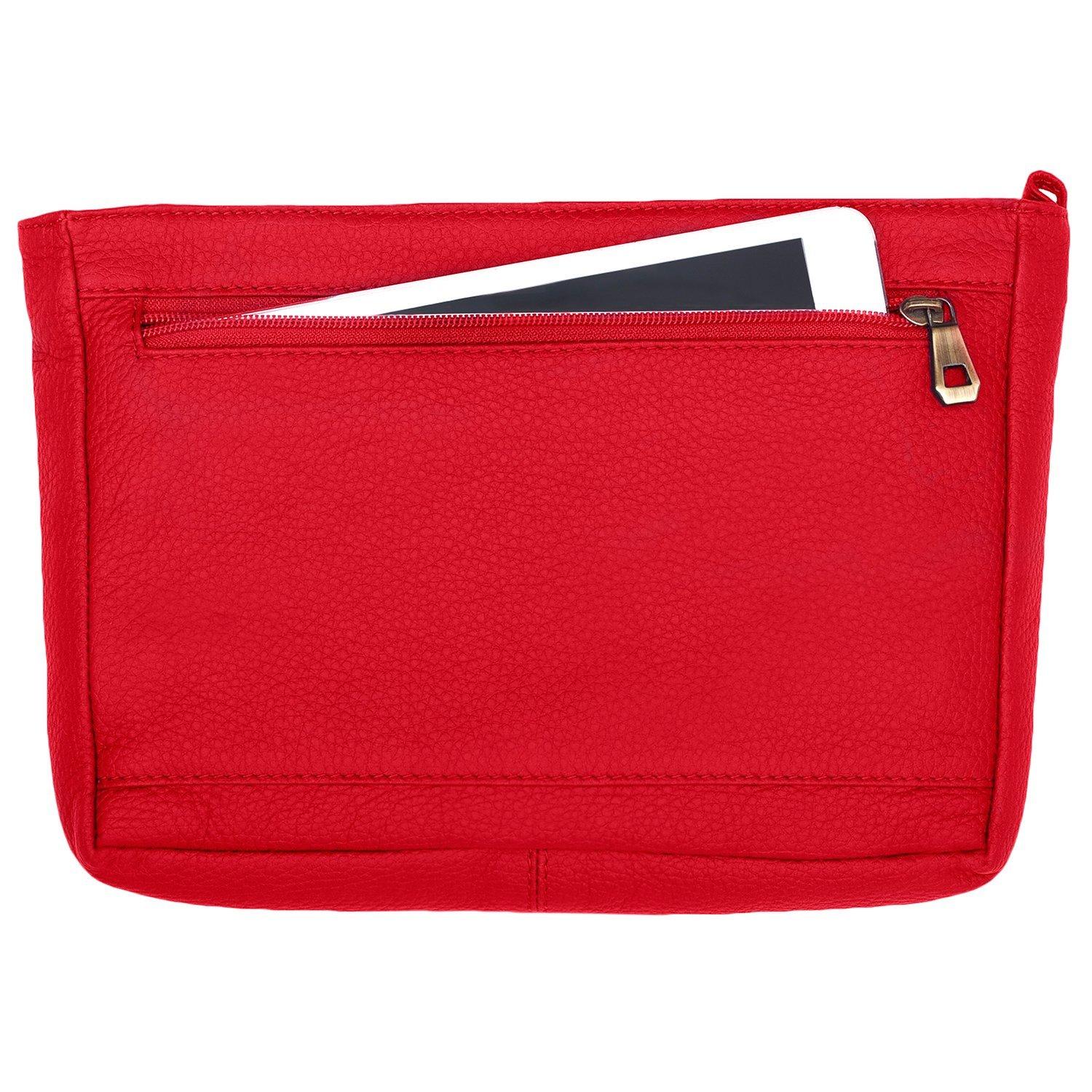 Beautifully crafted from soft leather, this multi-functional bag is an accessory must-have. It secures with a zipped top, has four internal slip pockets and one zipped. The exterior has 3 slip sections, one large zipped pocket on the back and an attached key fob that doubles up as a wrist strap.