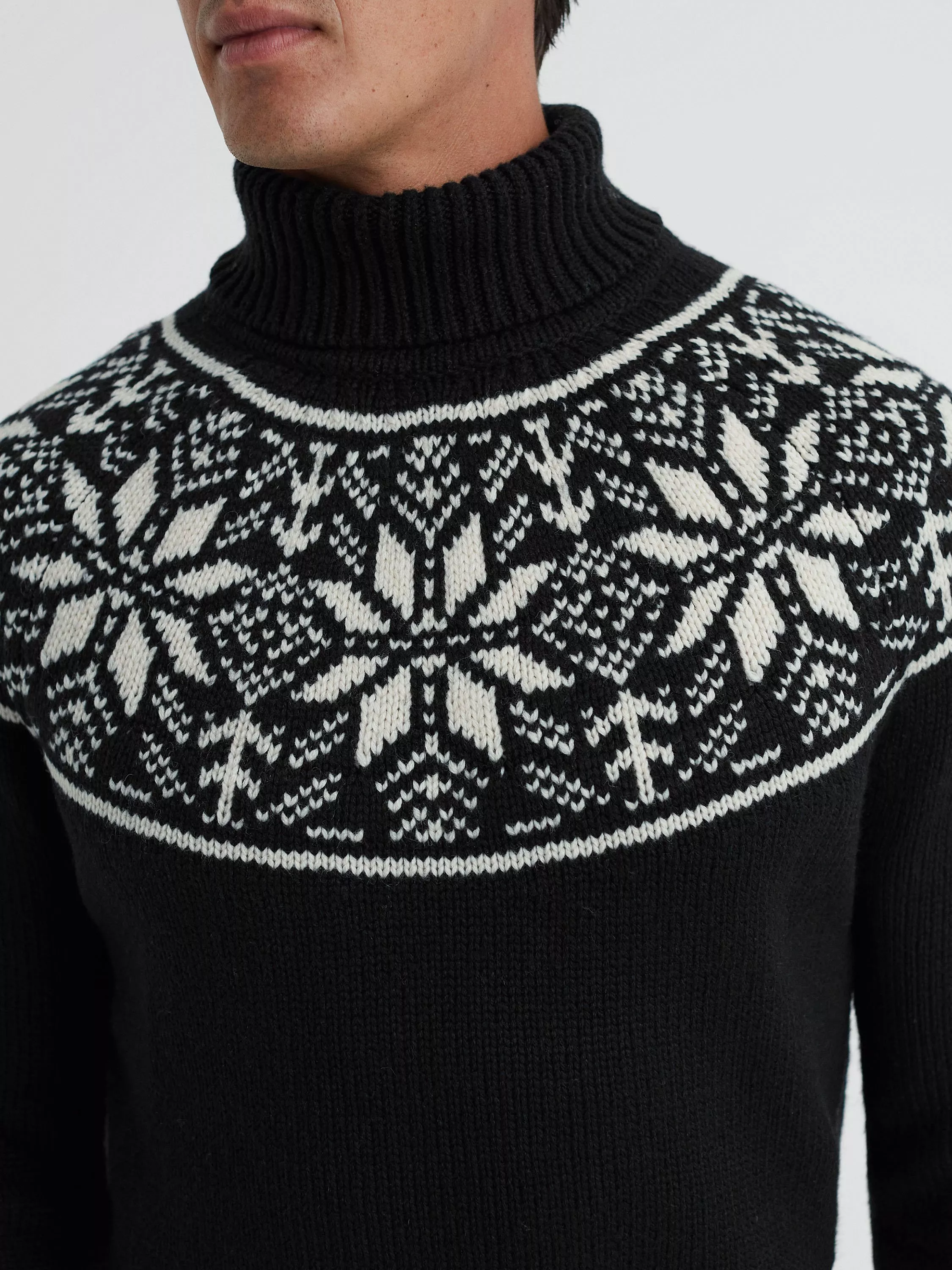 The perfect way to beat the chill, this roll neck jumper from Reiss showcases traditional Fair Isle embroidery and is crafted from the finest wool blend.