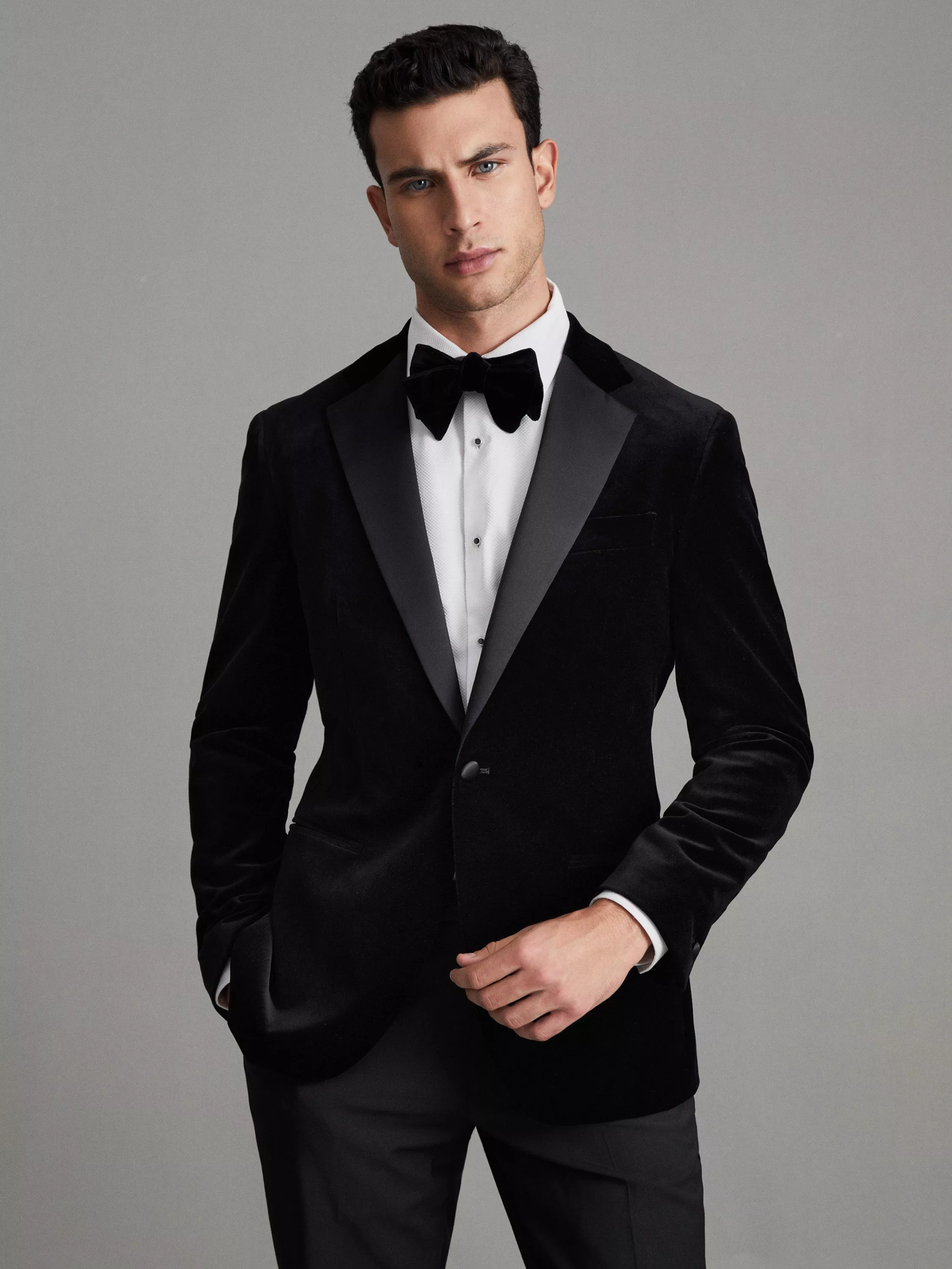 The Ace velvet blazer from Reiss is the party piece that will earn you sartorial points season after season. Finished with traditional details such as a single-breasted silhouette and contrasting satin trim, its versatile colourway and sumptuous texture combine to make a truly timeless garment. Style it with a dress shirt, bow tie, tuxedo trousers and patent shoes for classic evening style.