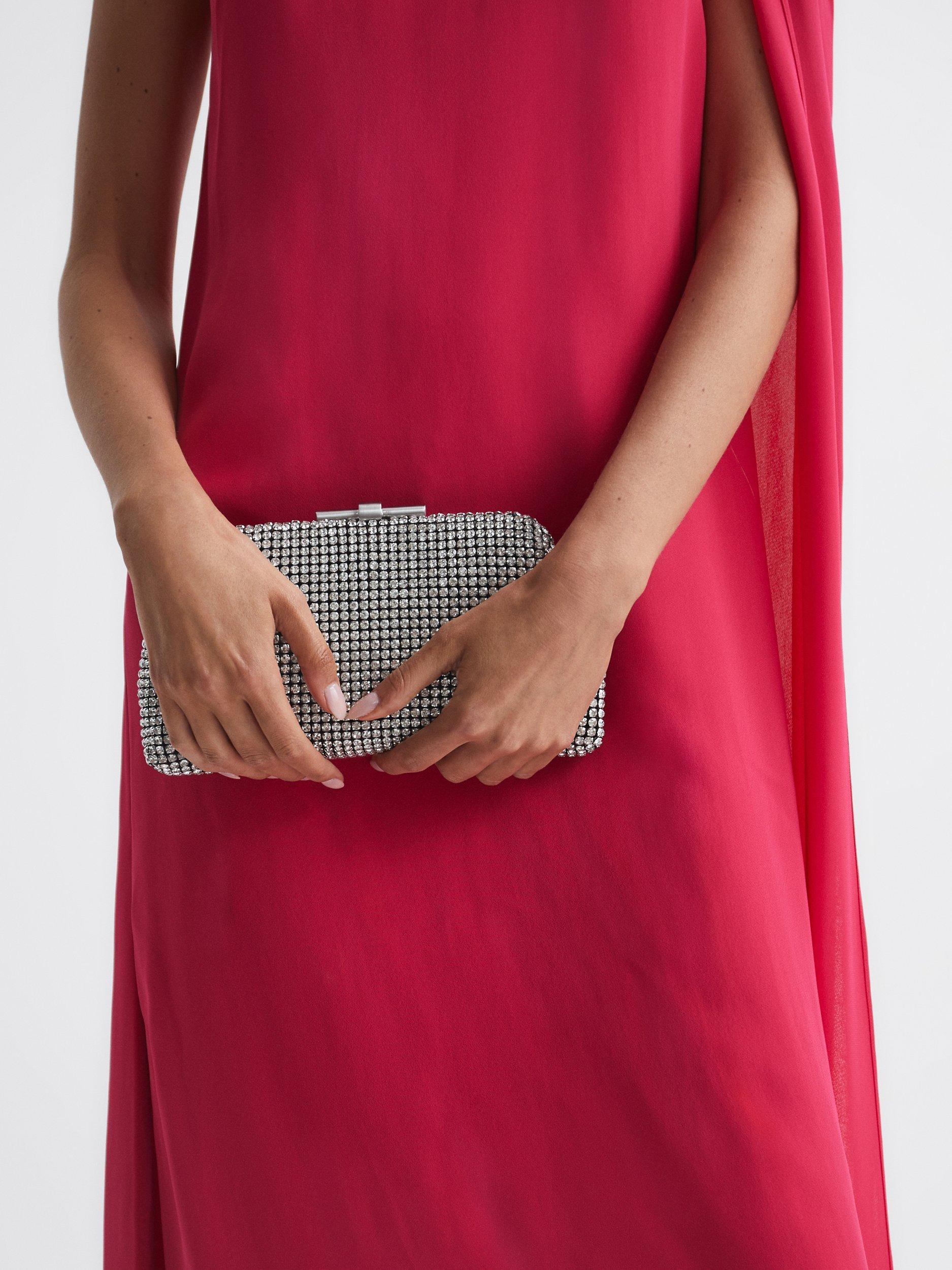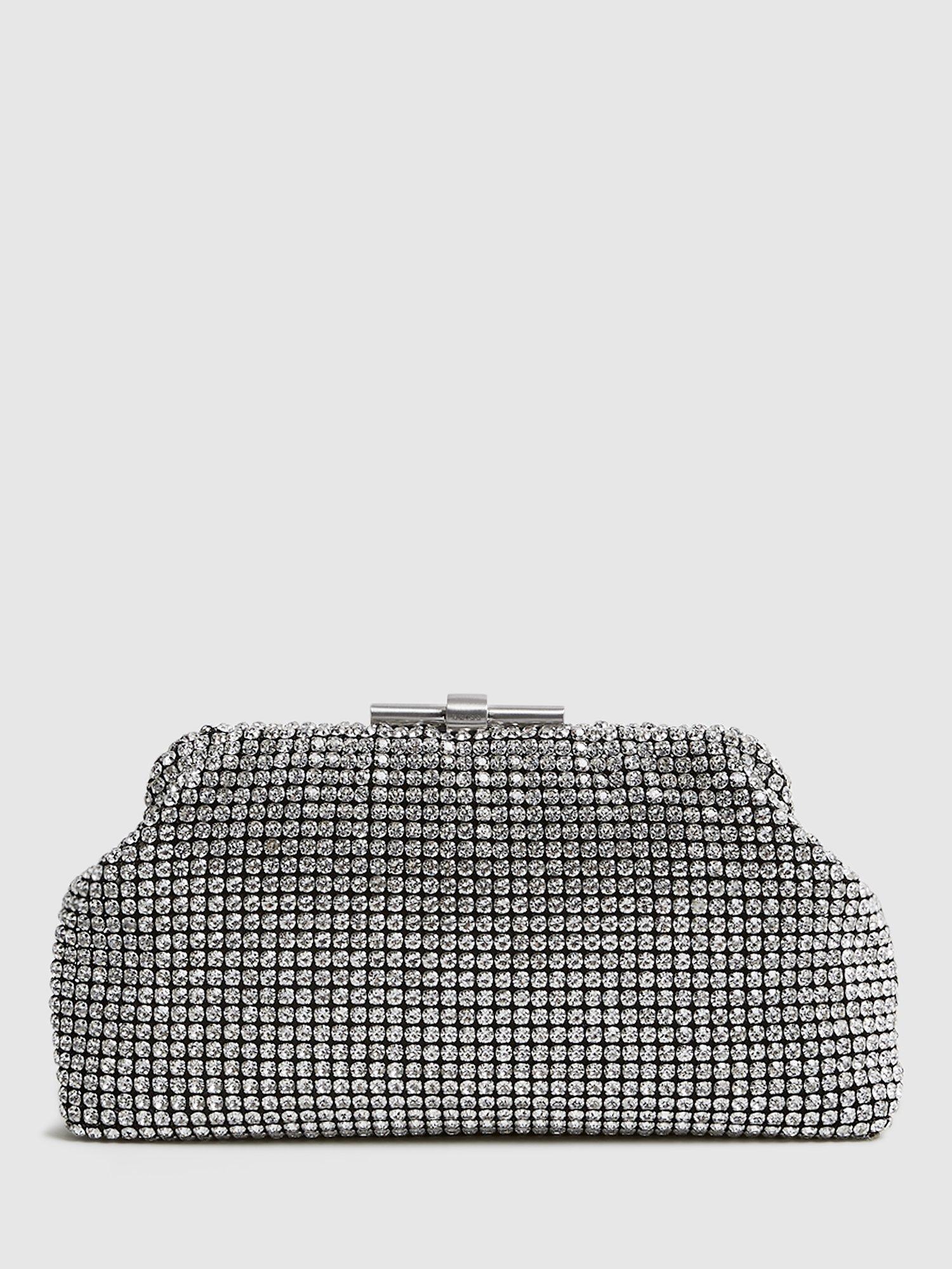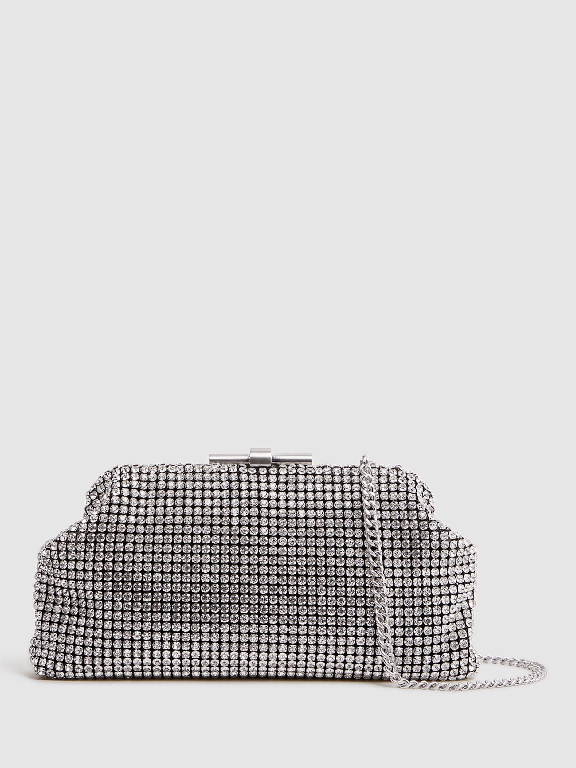 Crystal embellished all-over, it's fastens with a simple clasp and comes with a detachable chain strap that you can tuck away if you want to carry in hand.