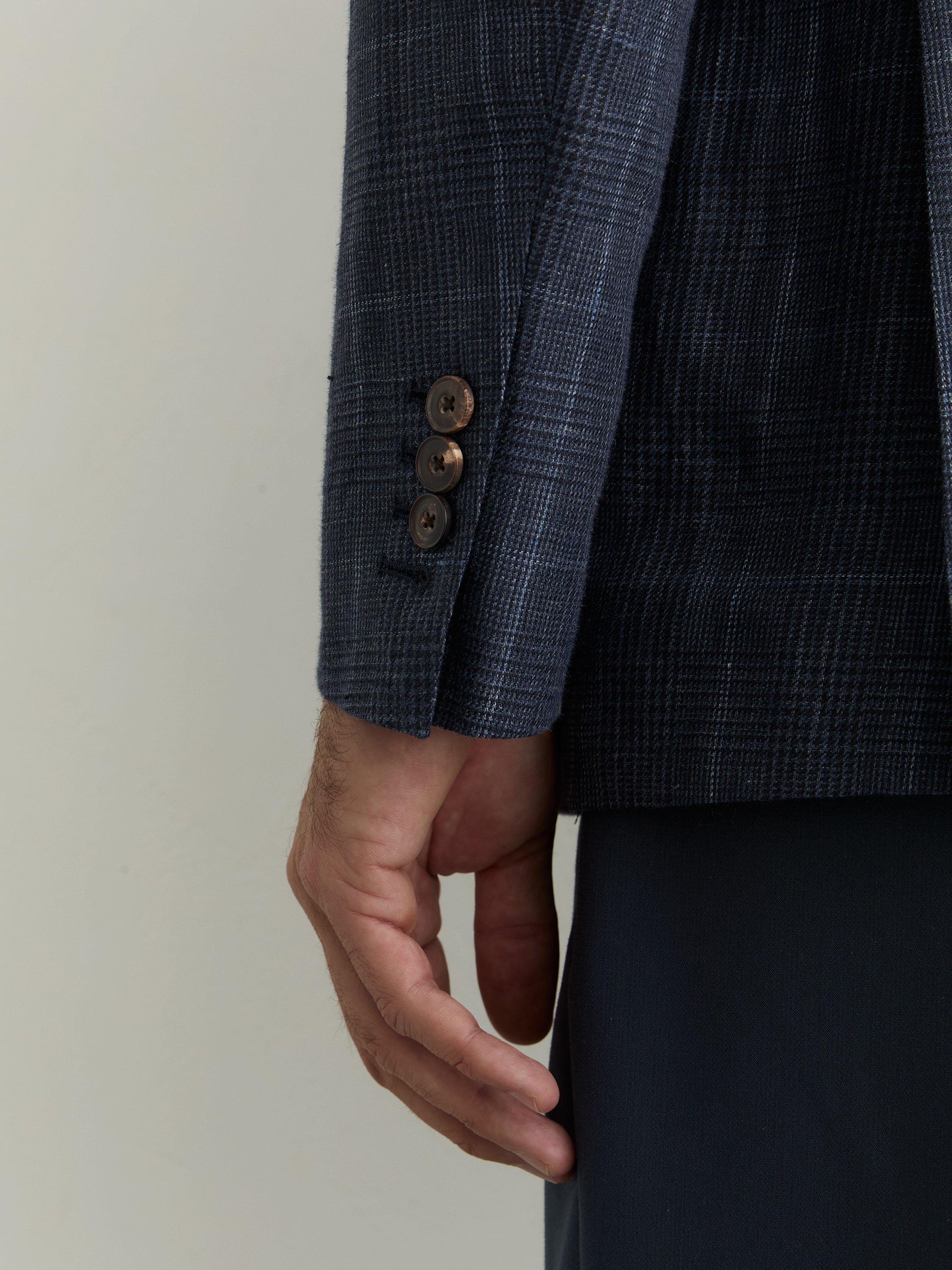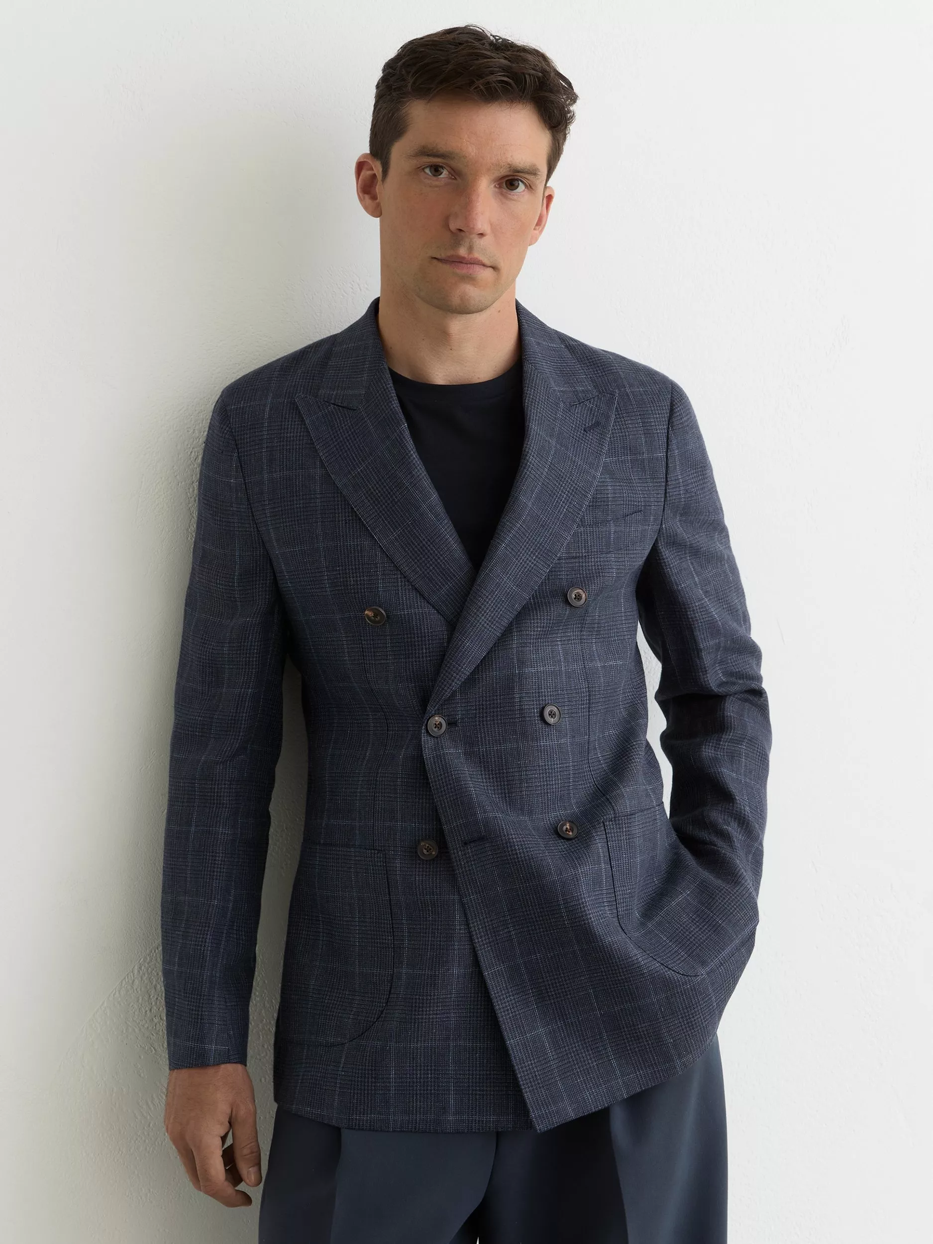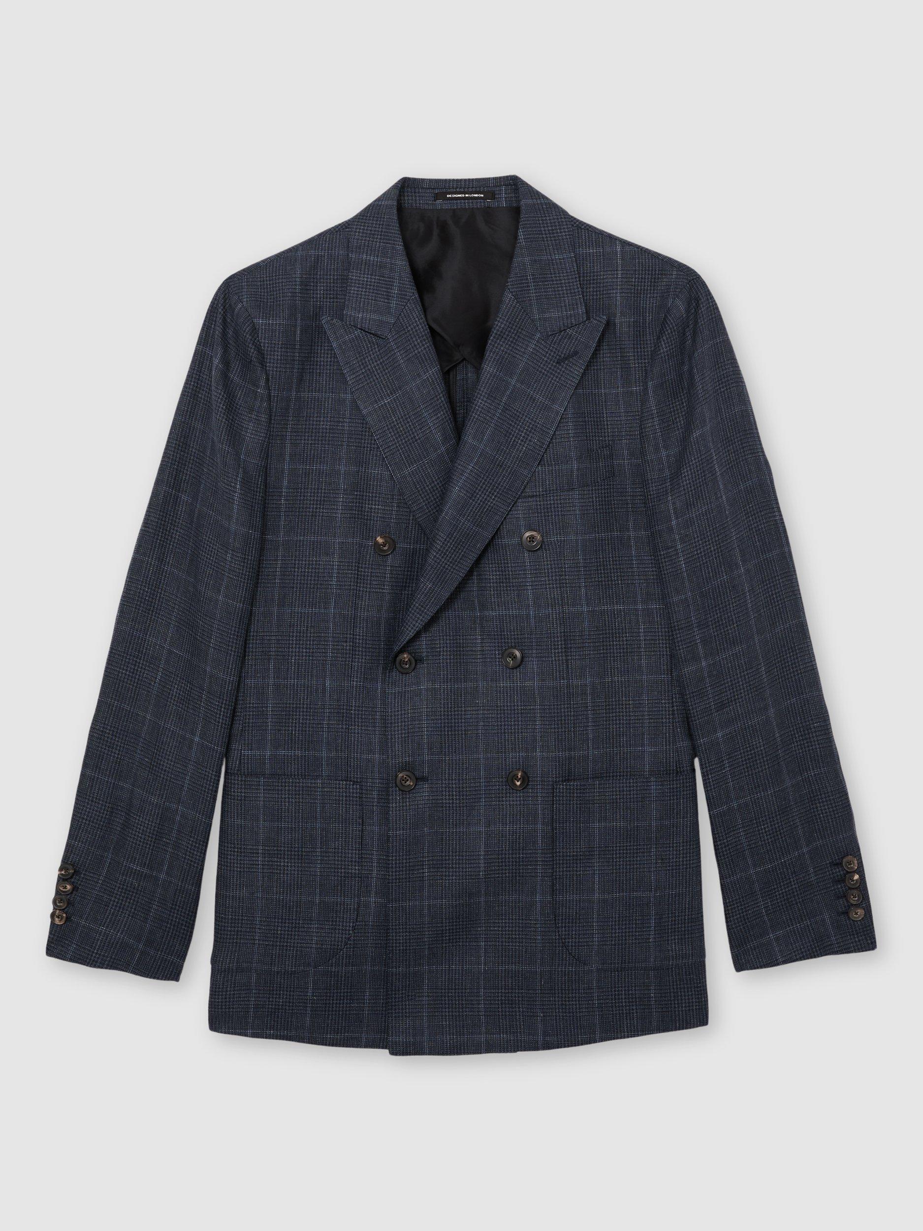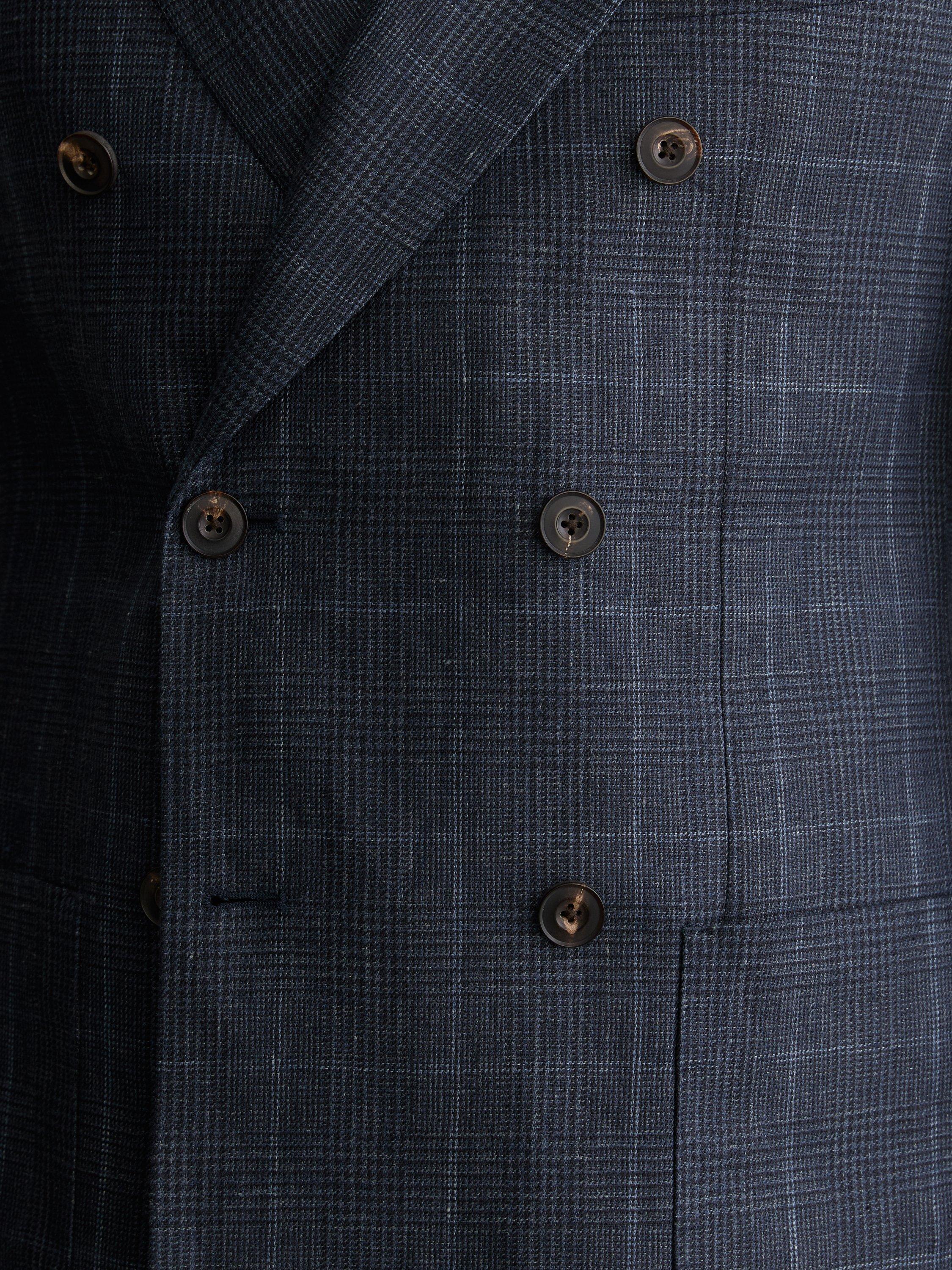 The Adoro blazer is tailored from 100% linen with a Prince of Wales check, cut to a double-breasted silhouette. It has peak lapels, patch pockets and a six-button front.