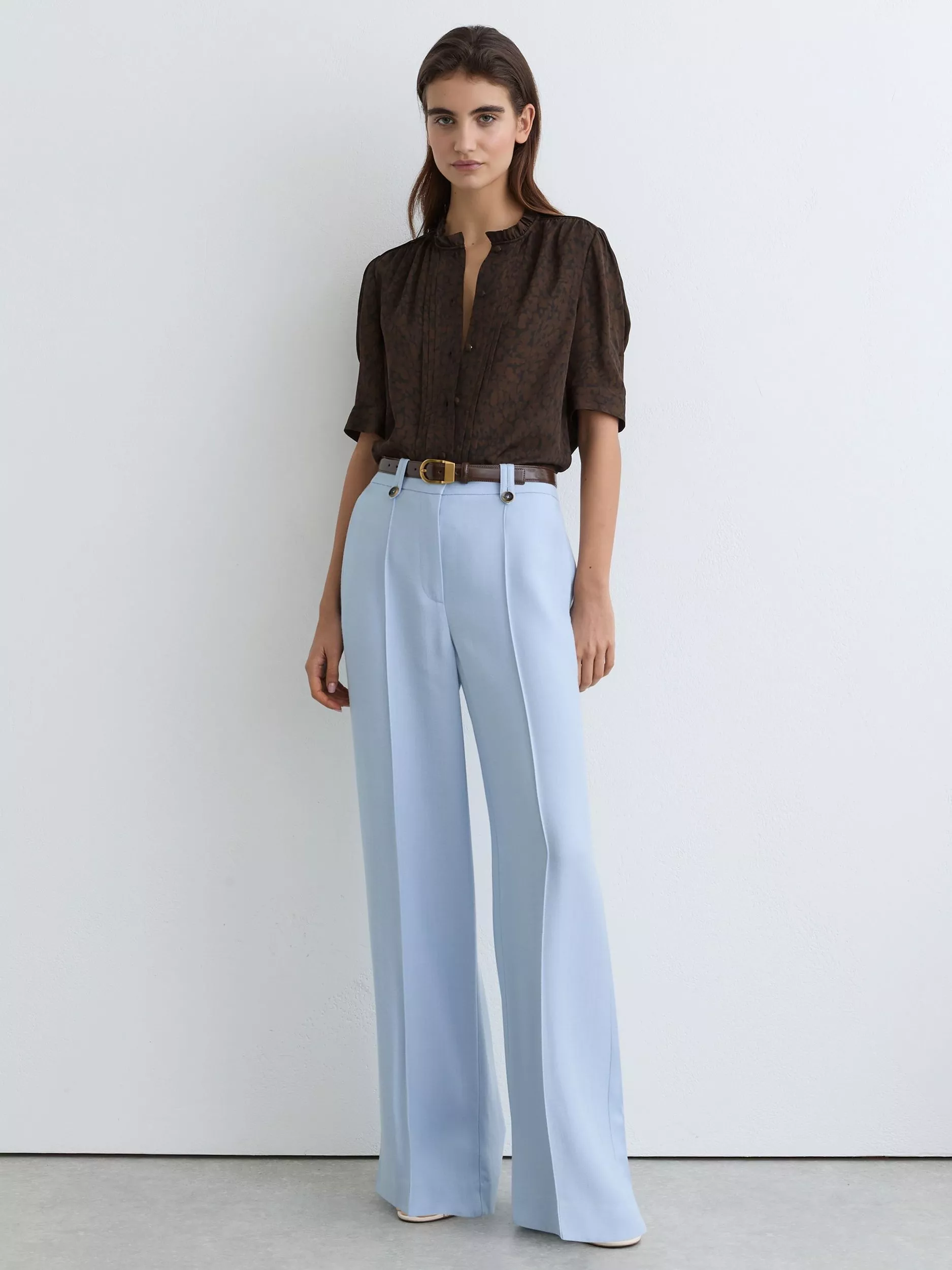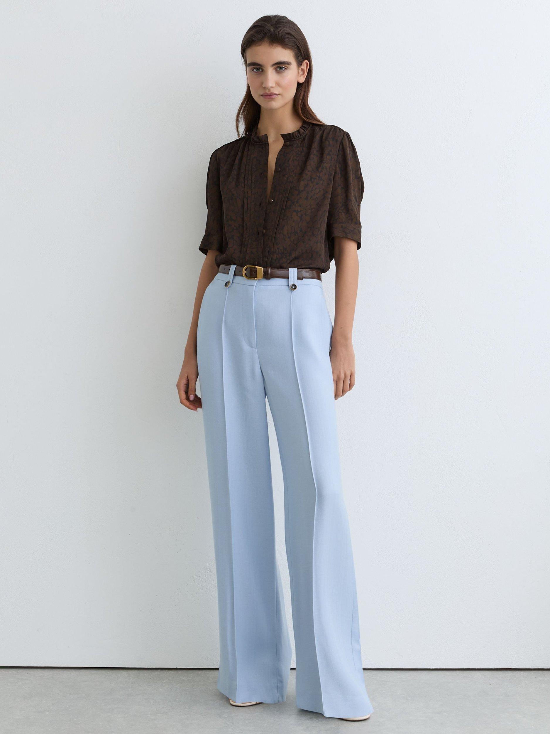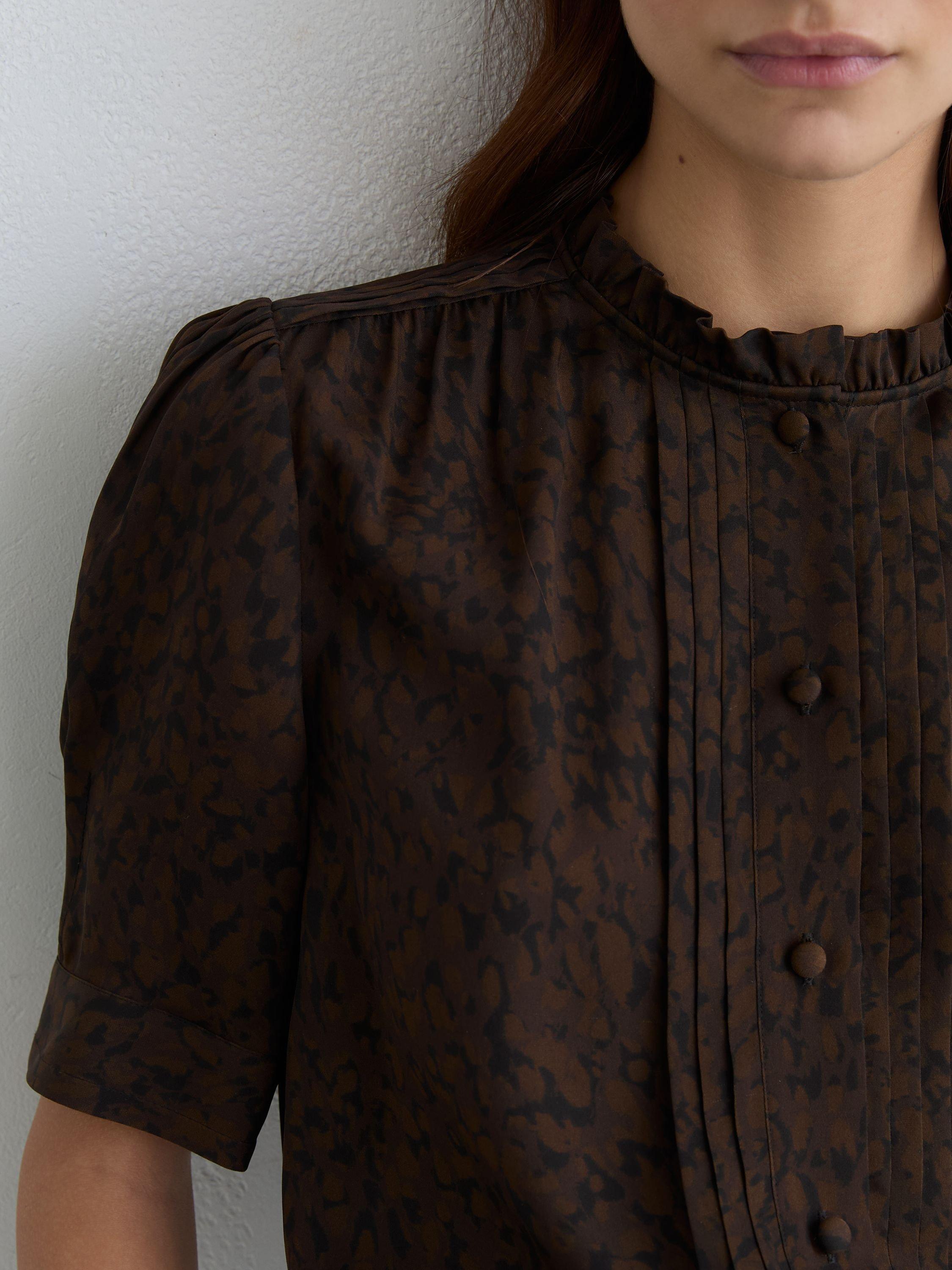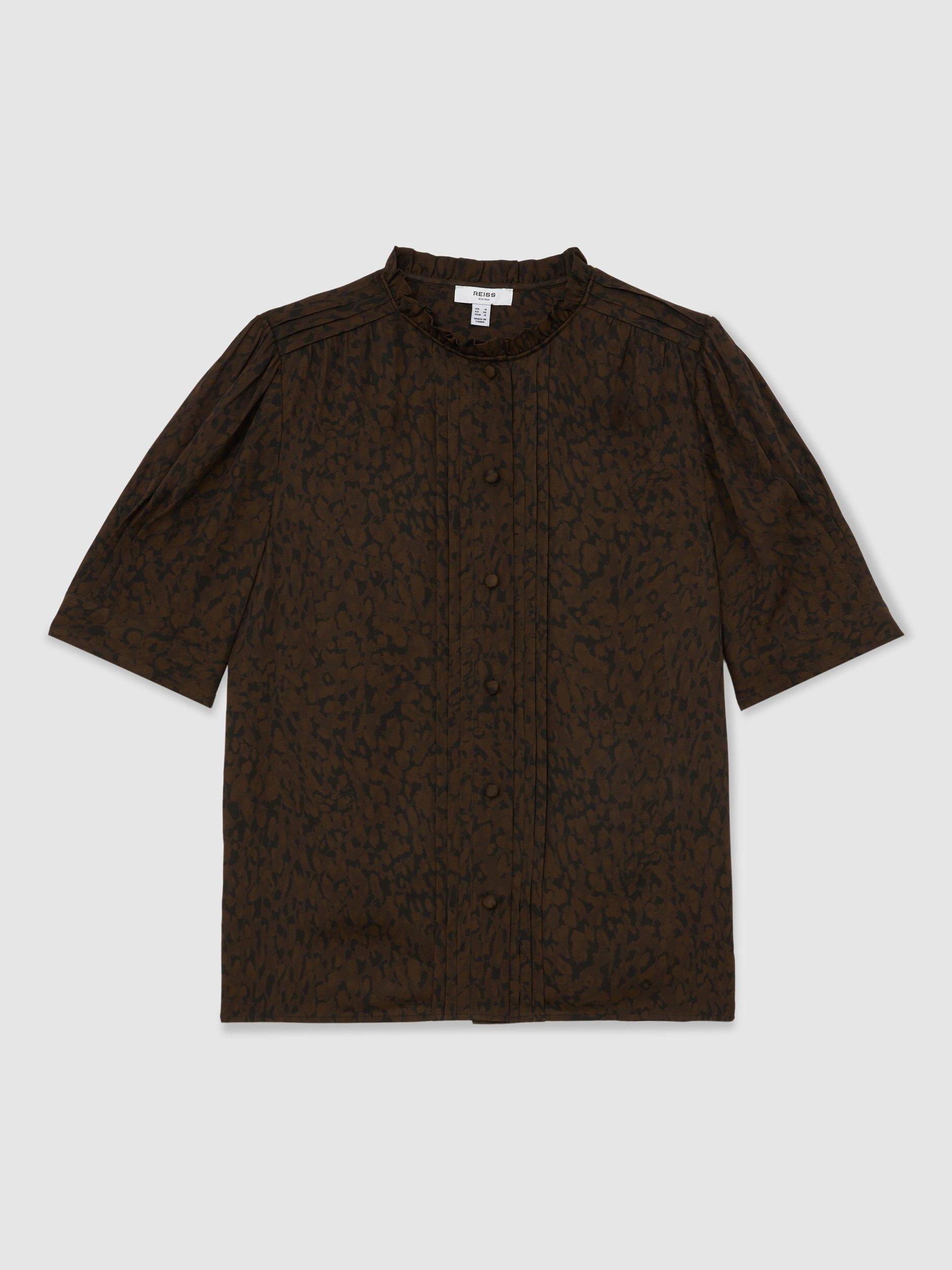 This silk blouse pairs an subtle animal pattern with a striking notch neck. Elbow-length sleeves add comfort and flair, great for any casual or summer setting.