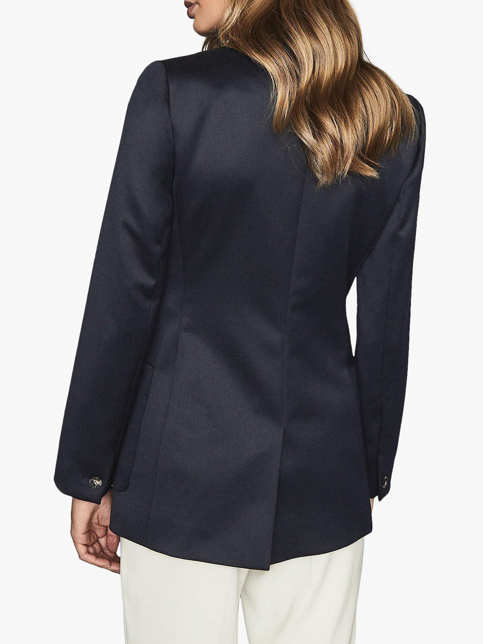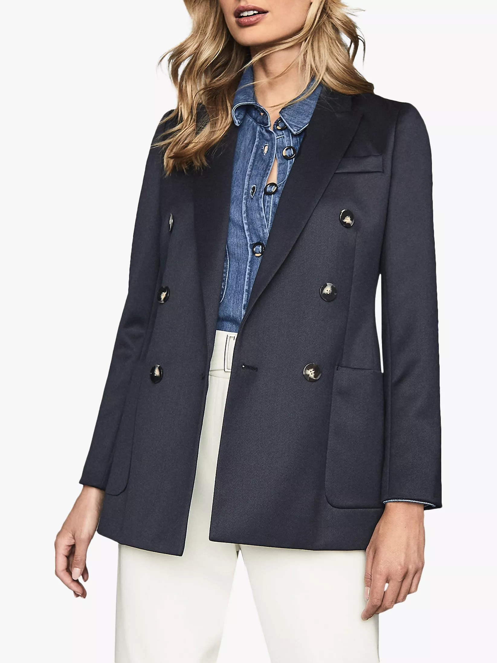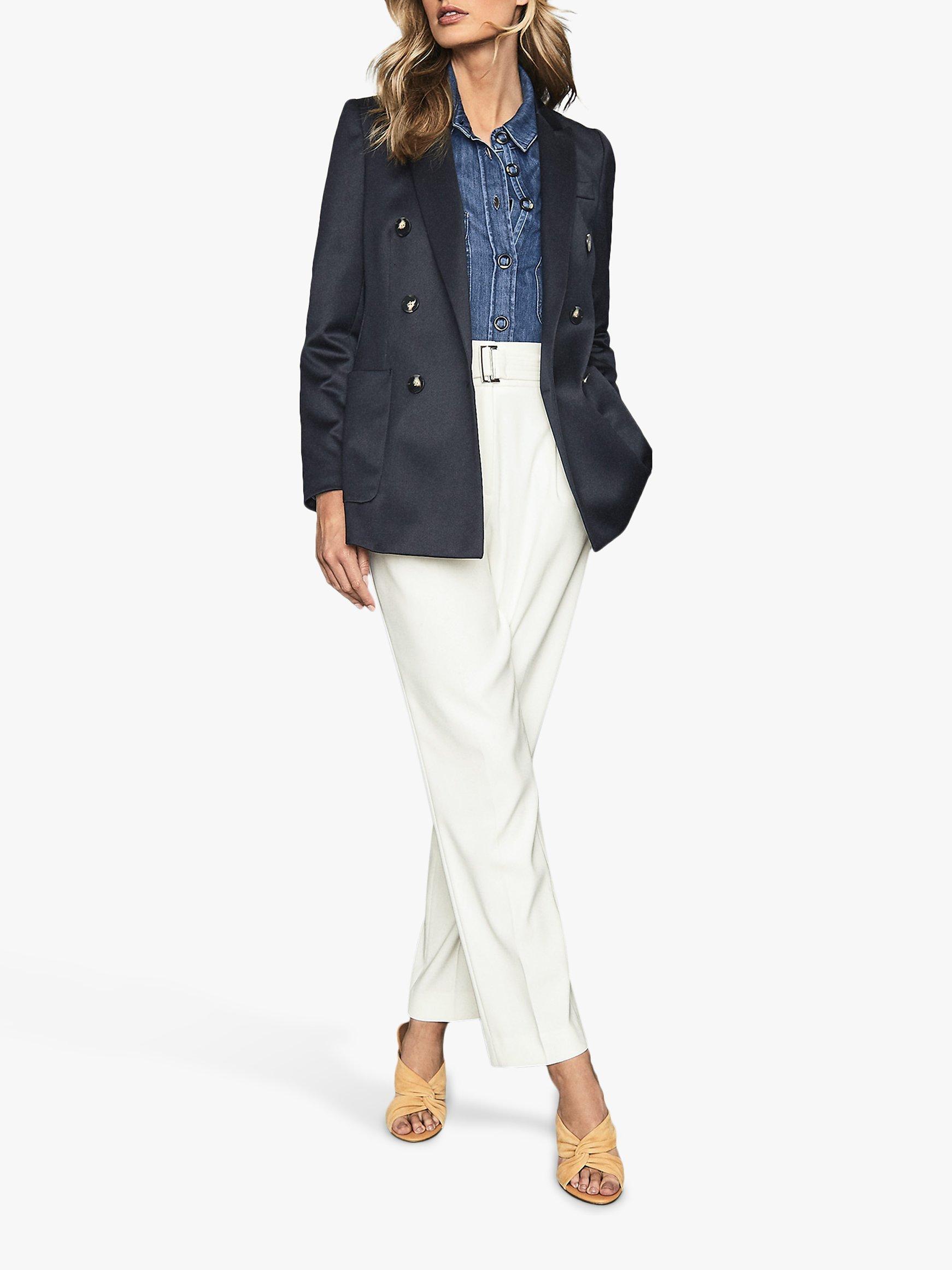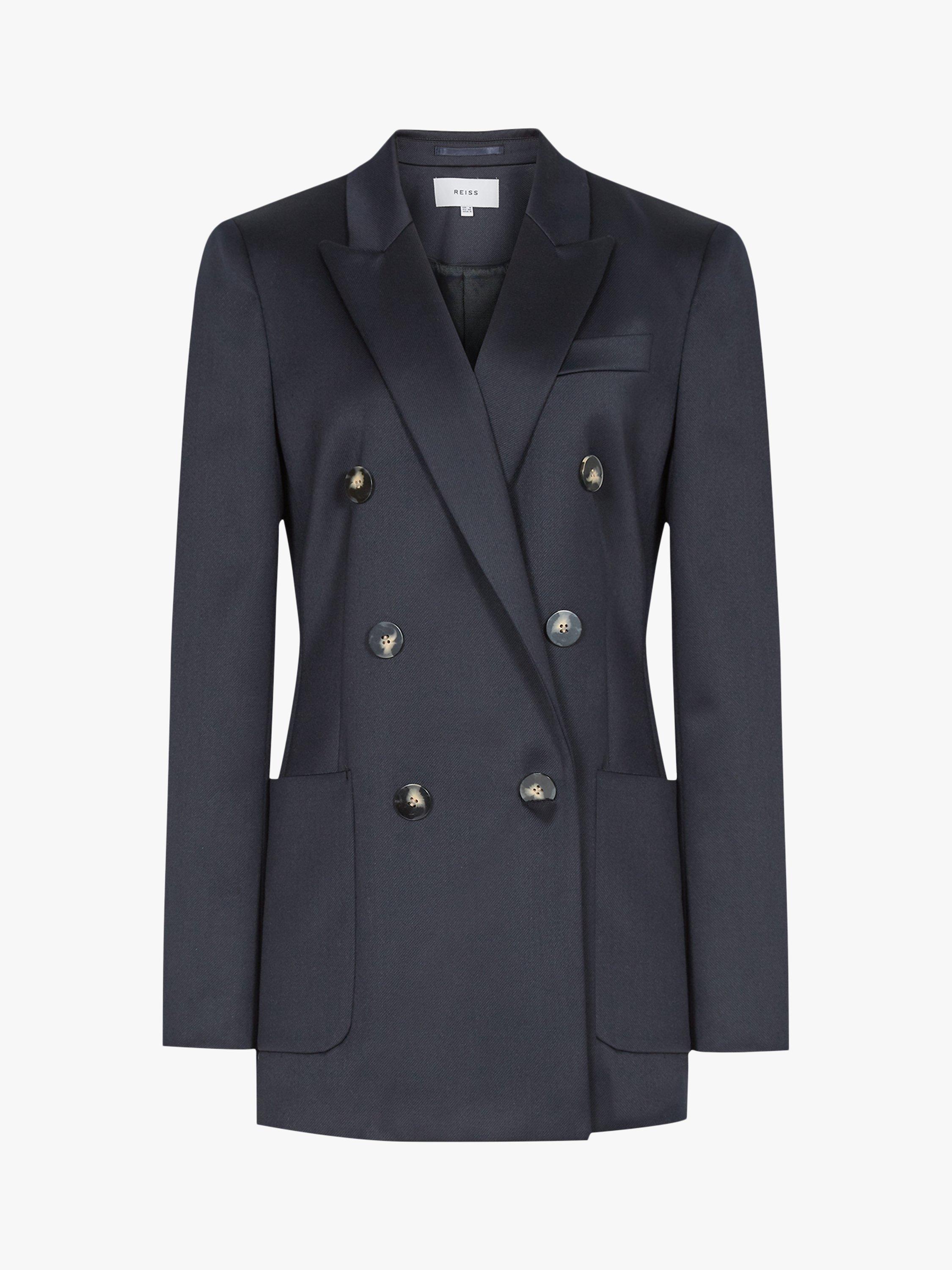 The Astrid blazer from Reiss is designed in a double-breasted silhouette, ideal for smartening up separates. Woven from a wool-blend fabrication it features functional pockets, oversized buttons and is fully lined for a smooth, comfortable fit. Layer over a collared shirt or silk blouse and tailored trousers for a formal aesthetic.