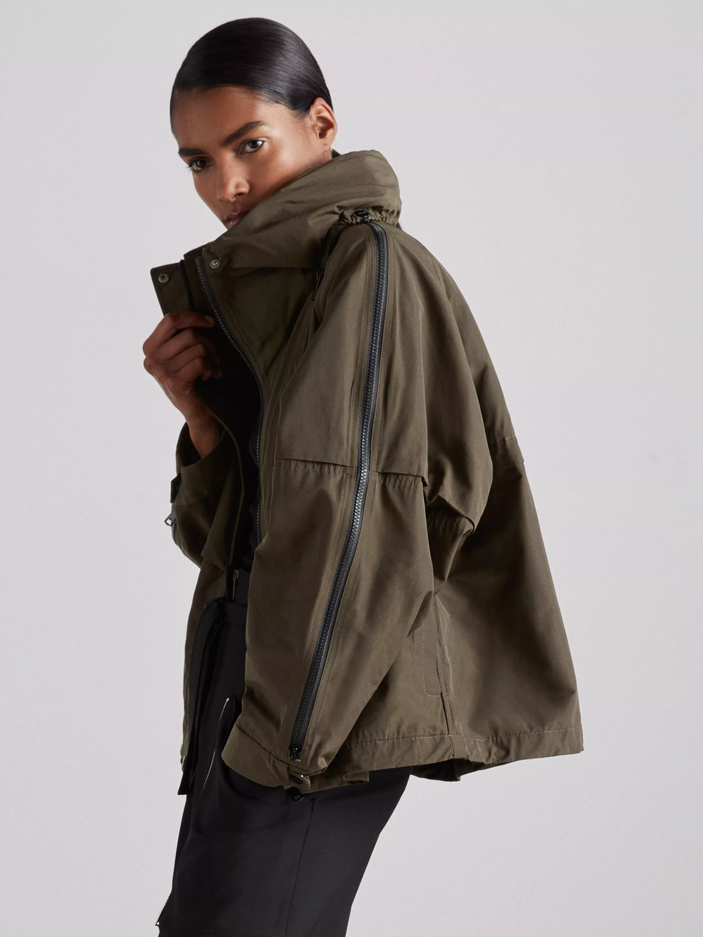 Easy to pack for those will-it-won't-it days, this shell coat by Reiss Atelier falls to a regular length. With a high neck, a roomy hood and traced with chunky zipped detailing, it is fashioned from long lasting fabric that will see away the cold.