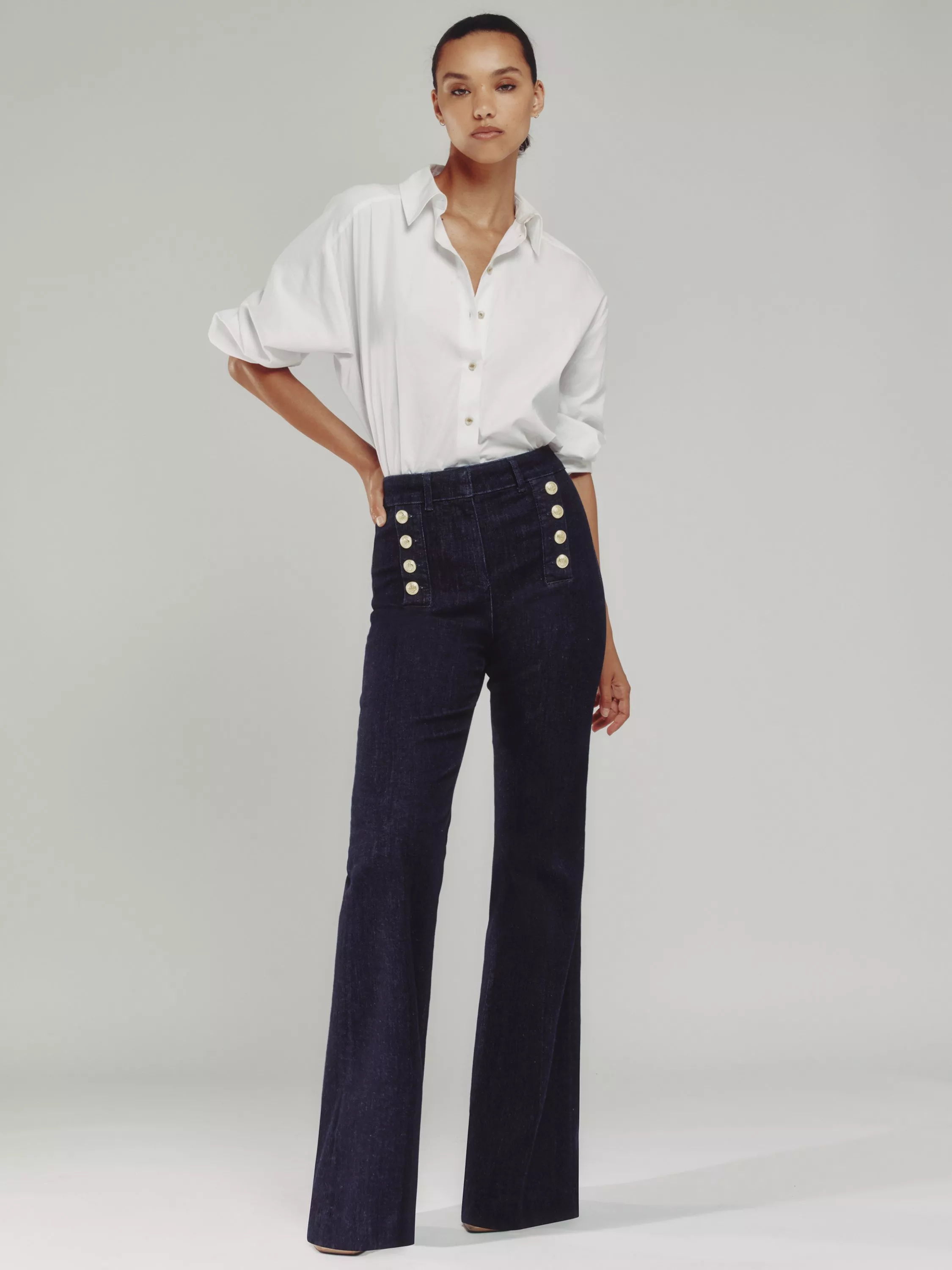 A pair of button detailed flared jeans from Reiss. Blended with cotton with a super comfortable high rise and a classic zip fly, they fall to a full-length.
