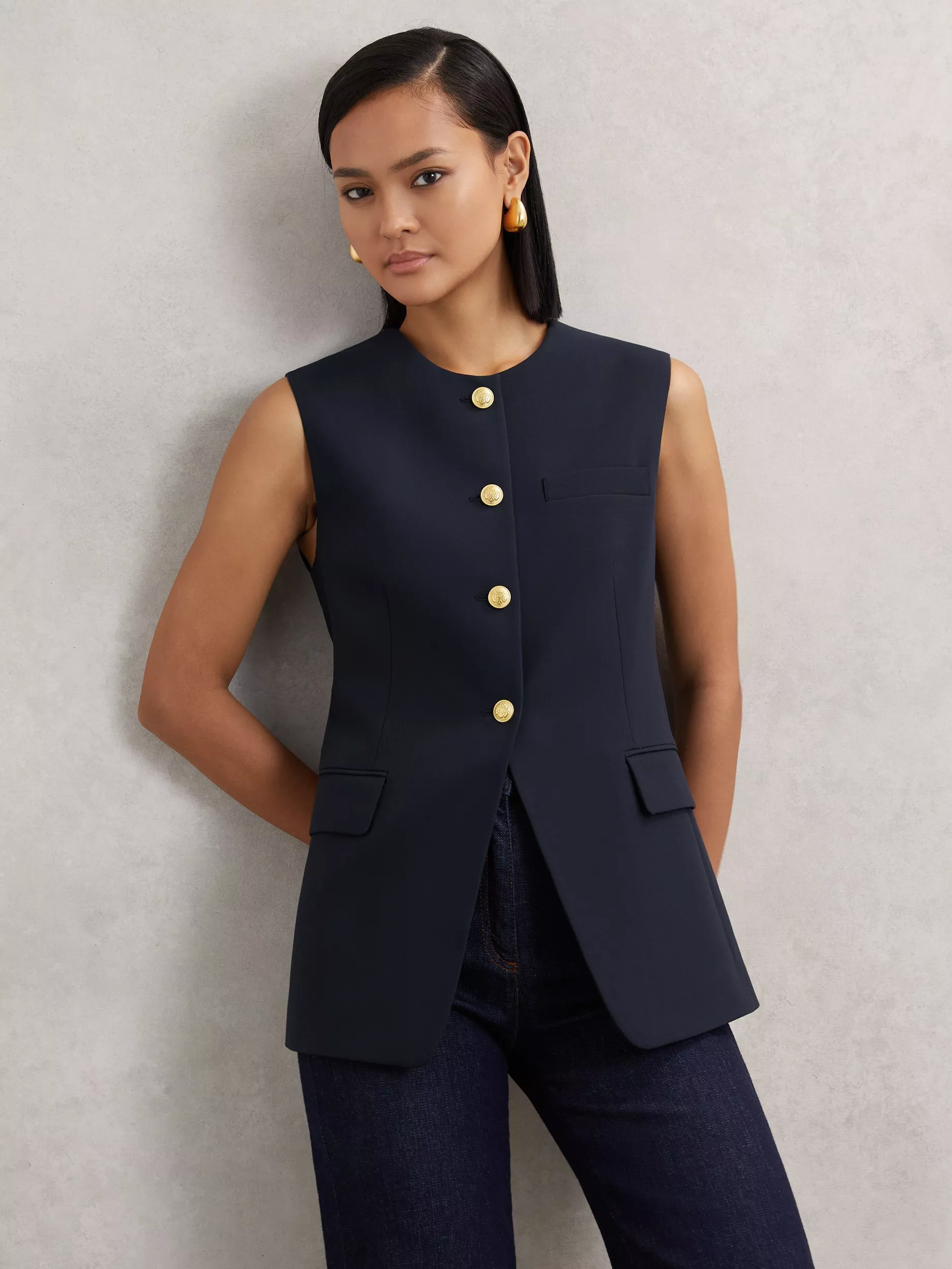 This longline waistcoat keeps you comfortable through busy days, with its regular fit and sleeveless design offering freedom to move. The round neck and button fastening add straightforward elegance, making it a practical choice for work or daily activities.