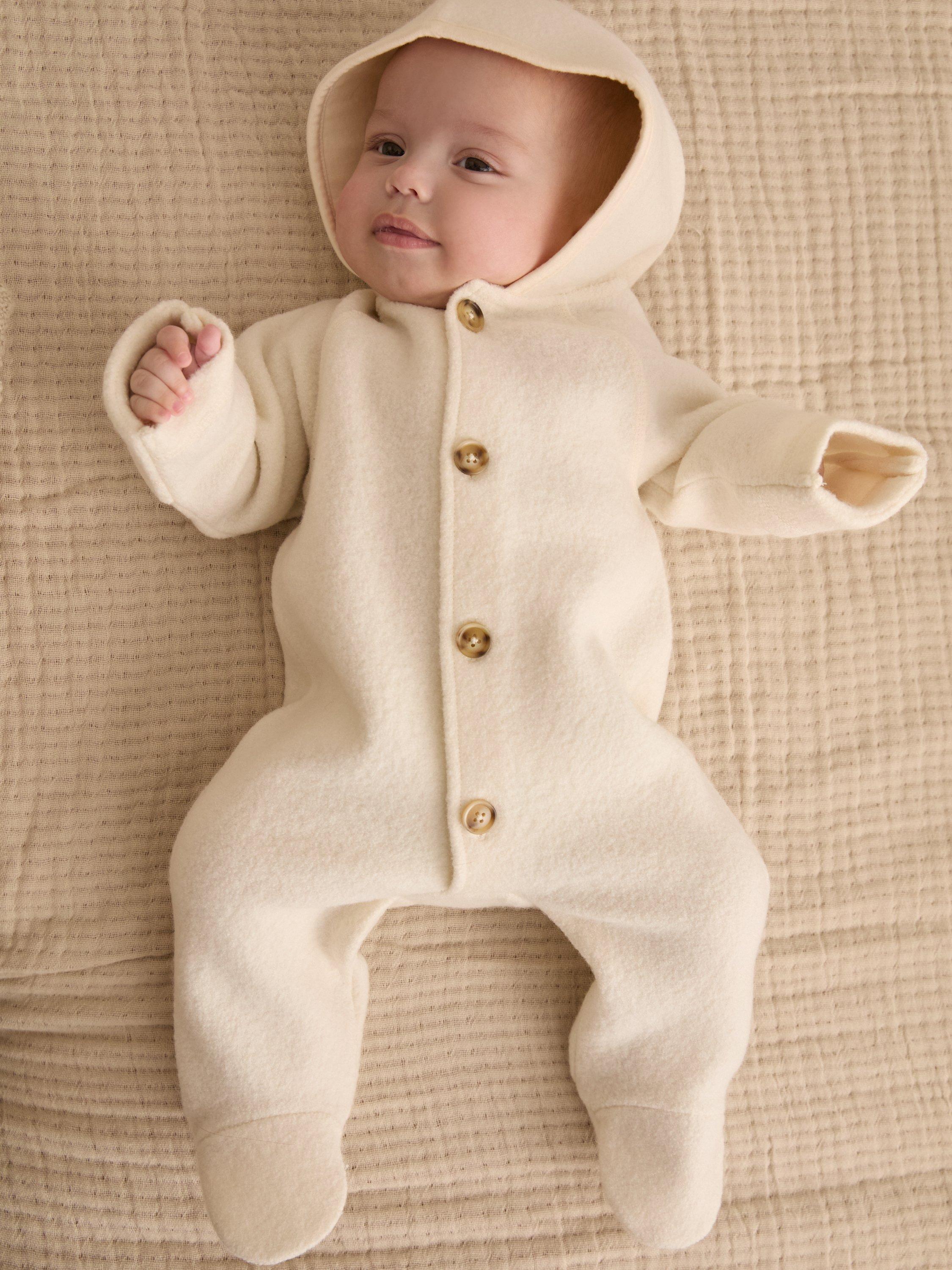Scandi cool, this snowsuit with chunky button closure is the eptiome of chic baby style. Made from 100% wool it's warm and cosy for your little one.