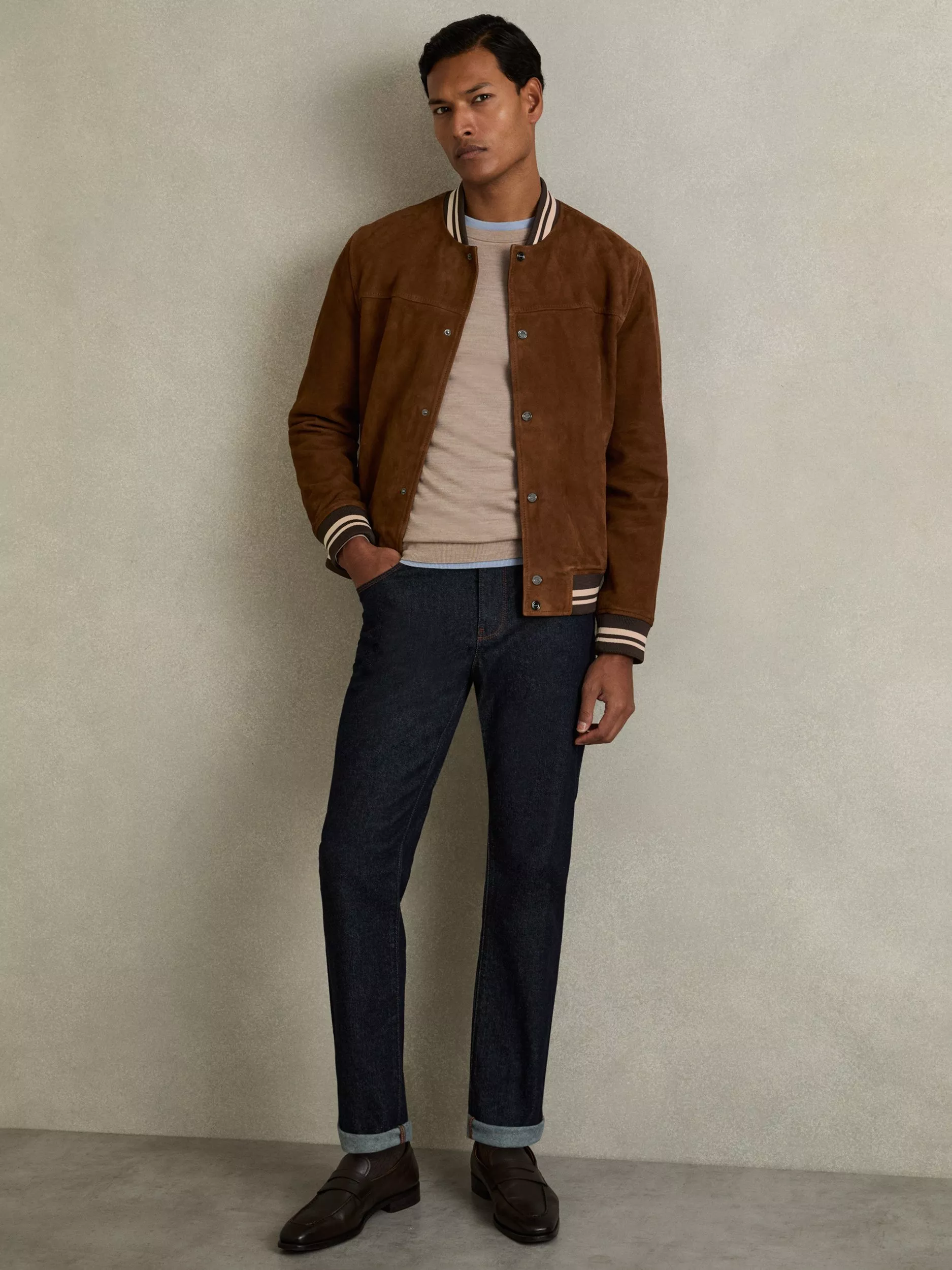 The Banridge terracotta bomber jacket is the perfect transitional layer, crafted from supple suede in a warm terracotta hue. The ribbed trim is elevated by contrasting stripes that lend a subtle athletic touch to the style.