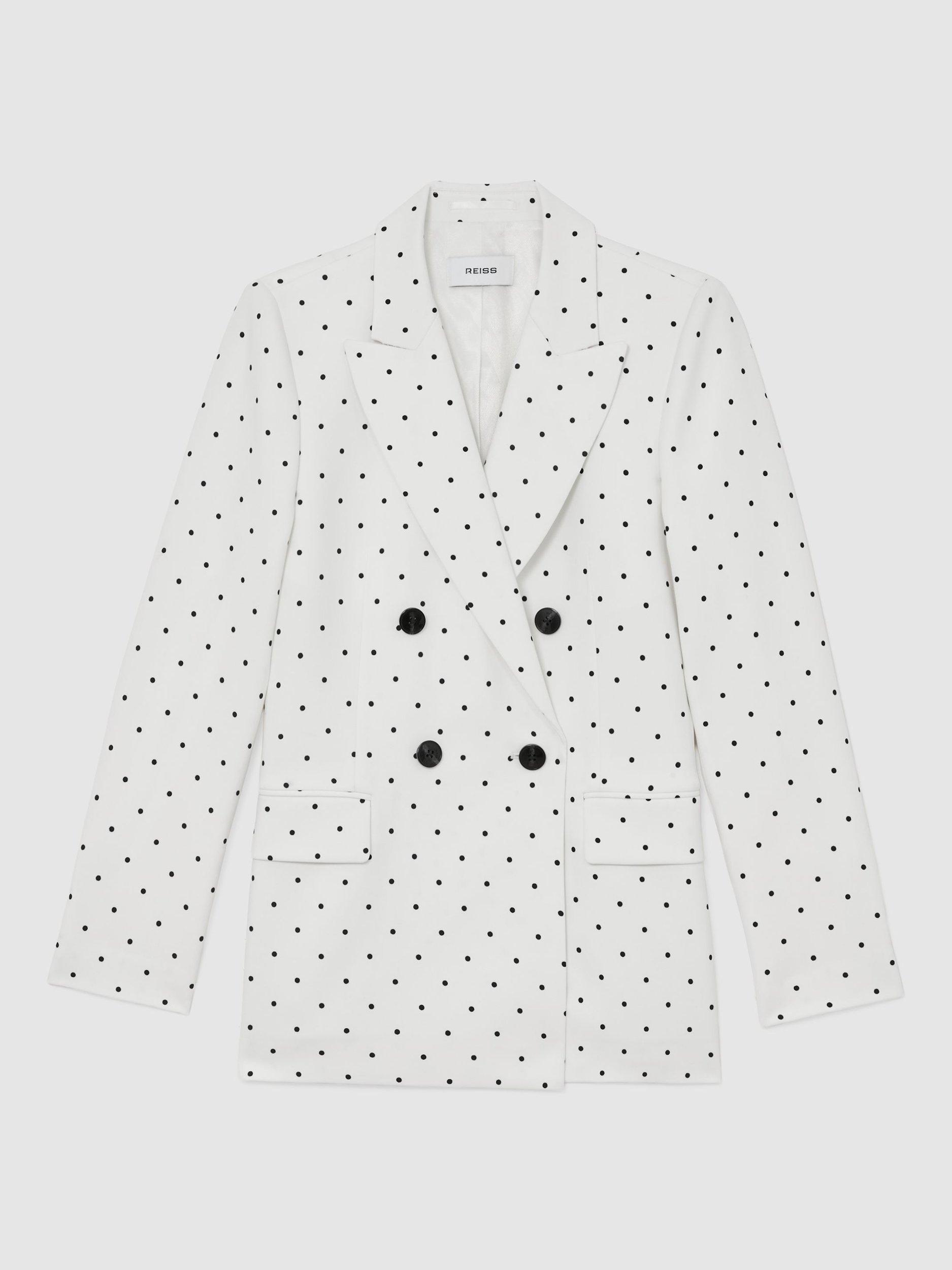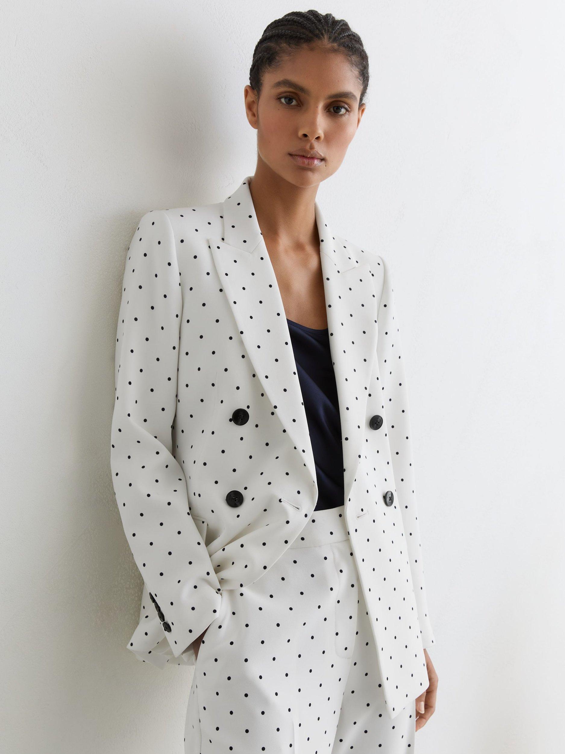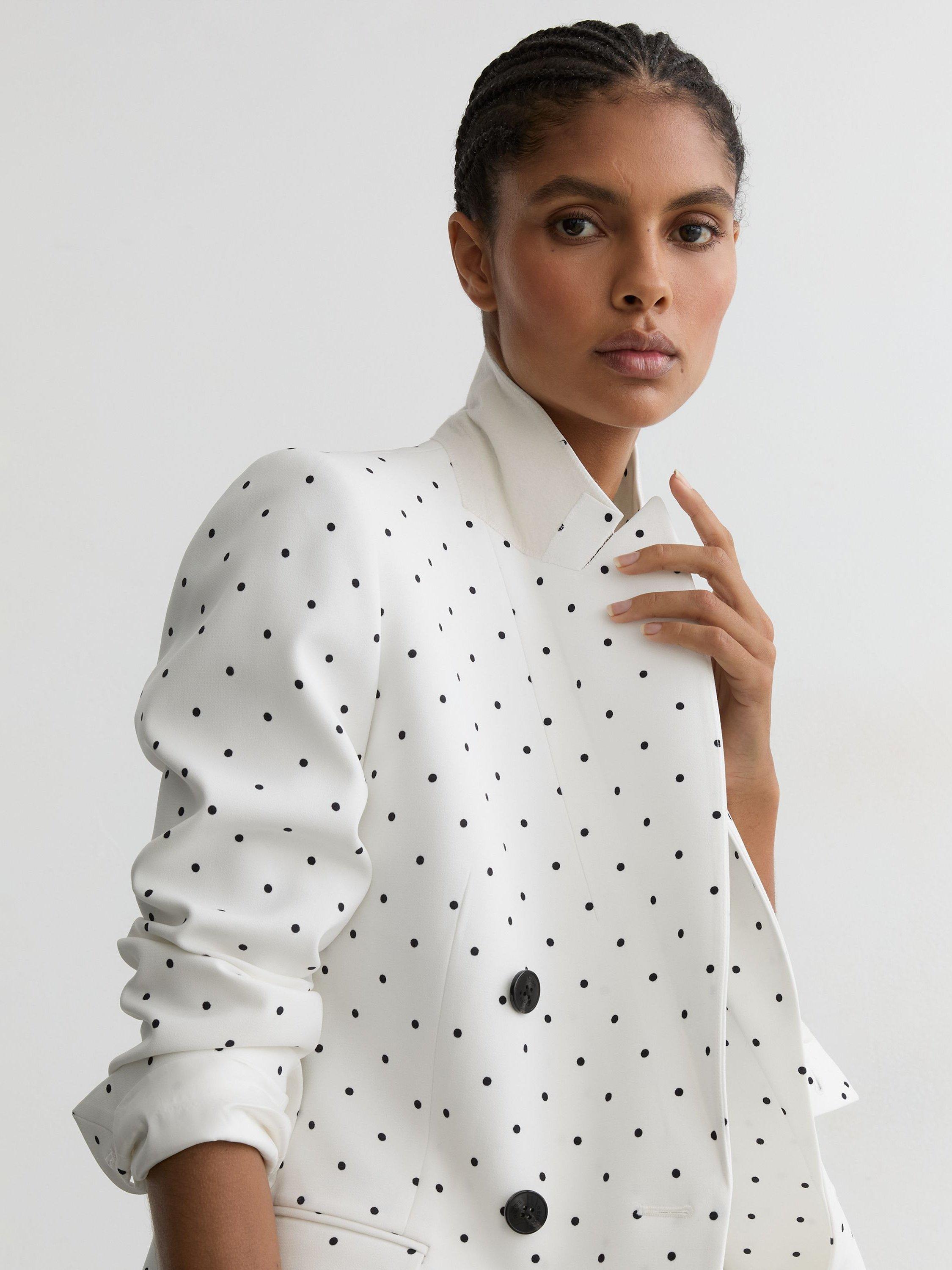 A double-breasted blazer by Reiss in statement monochrome polka dots. Smart buttons and tailored lines create a sharp look, ensuring comfort and style from day to evening.