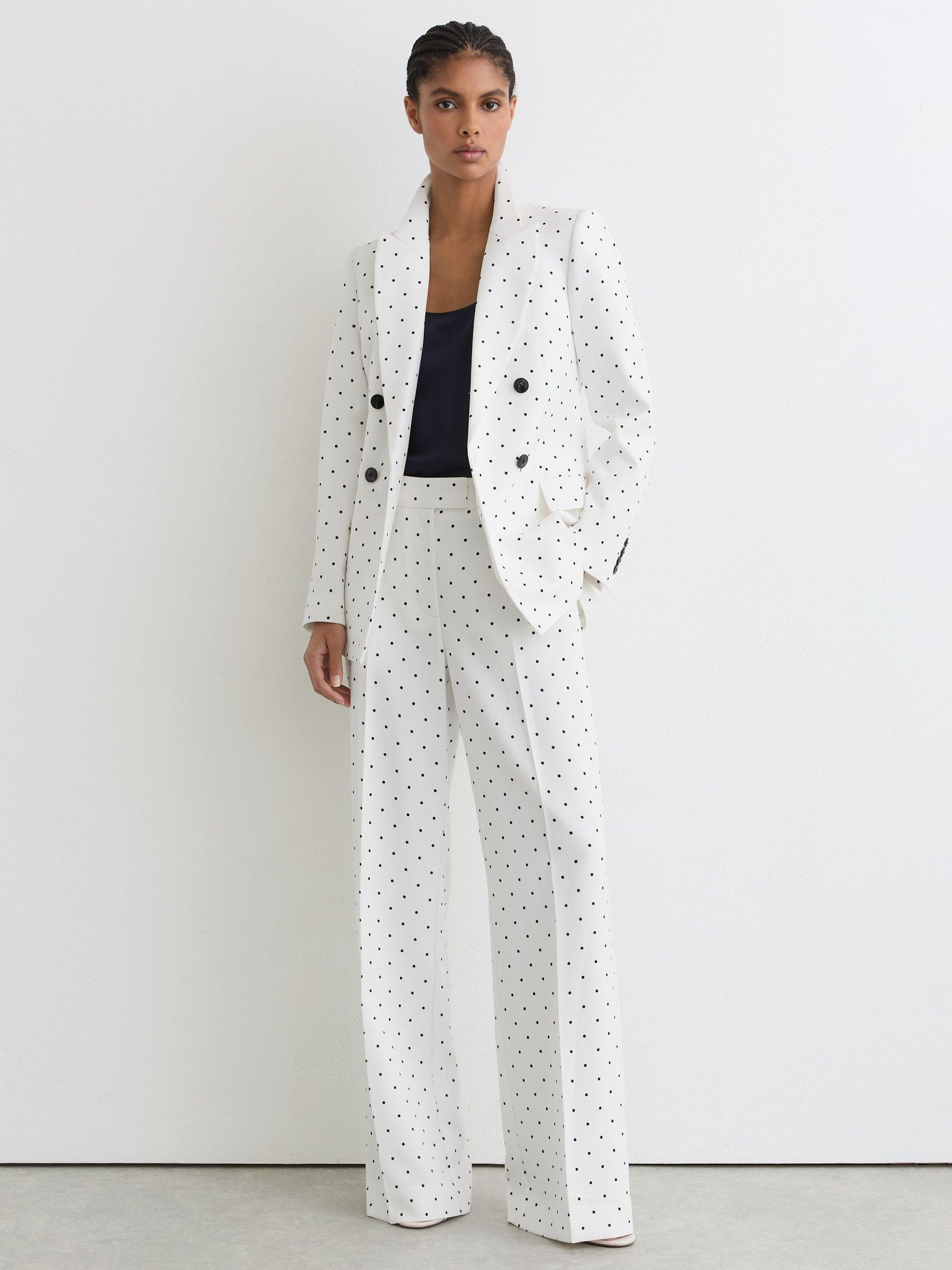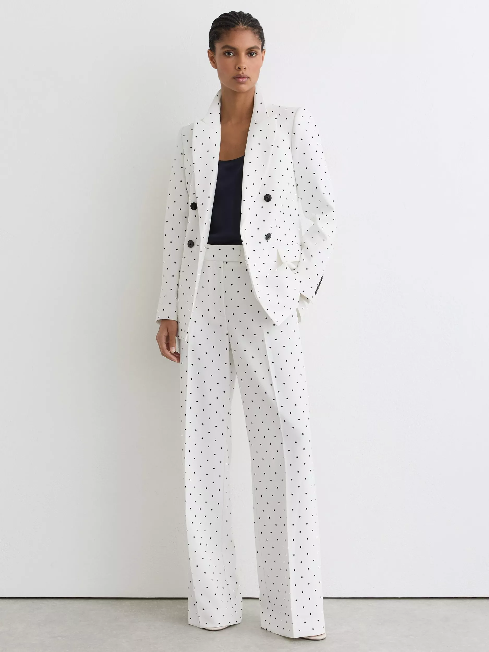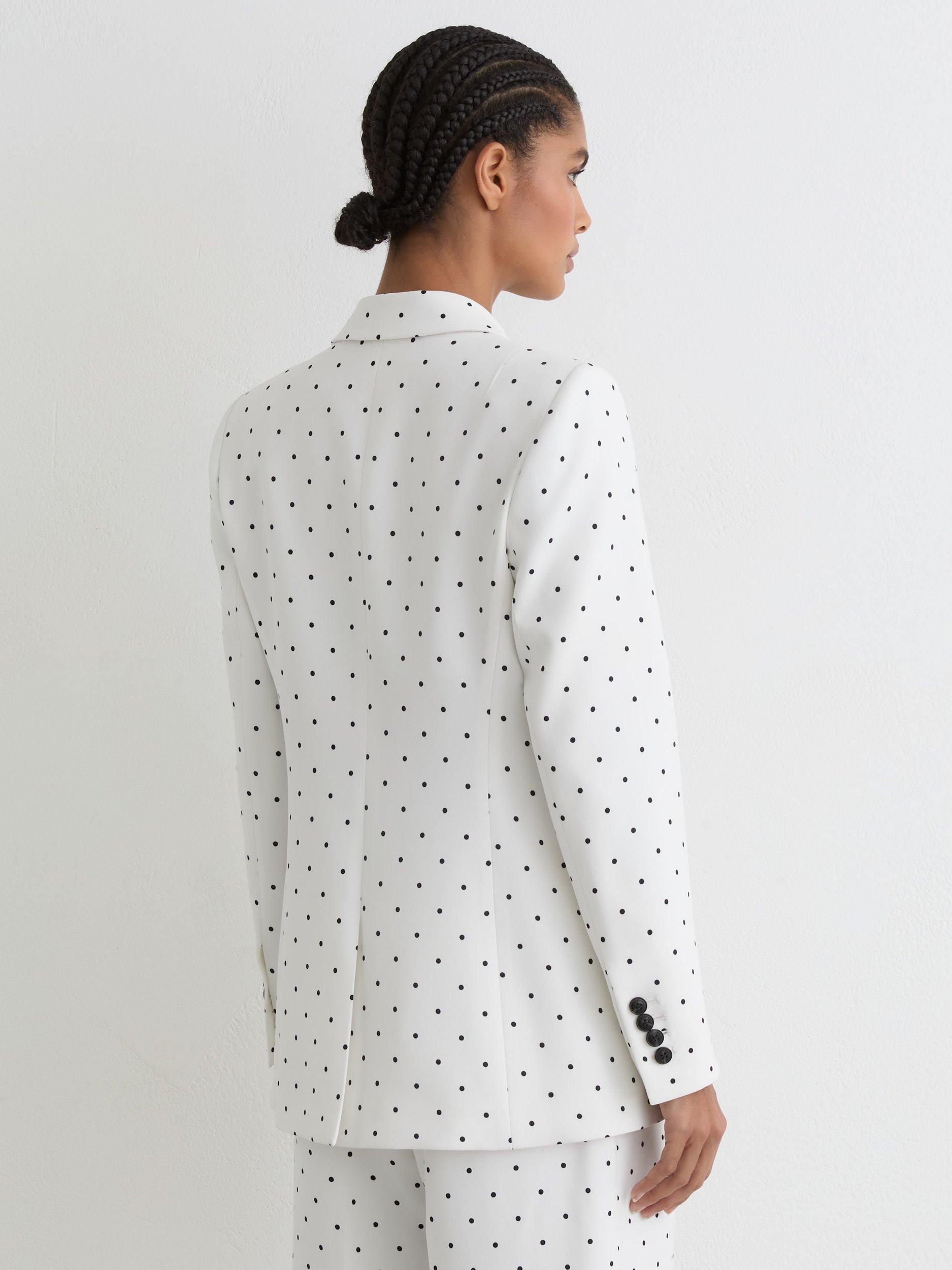 A double-breasted blazer by Reiss in statement monochrome polka dots. Smart buttons and tailored lines create a sharp look, ensuring comfort and style from day to evening.