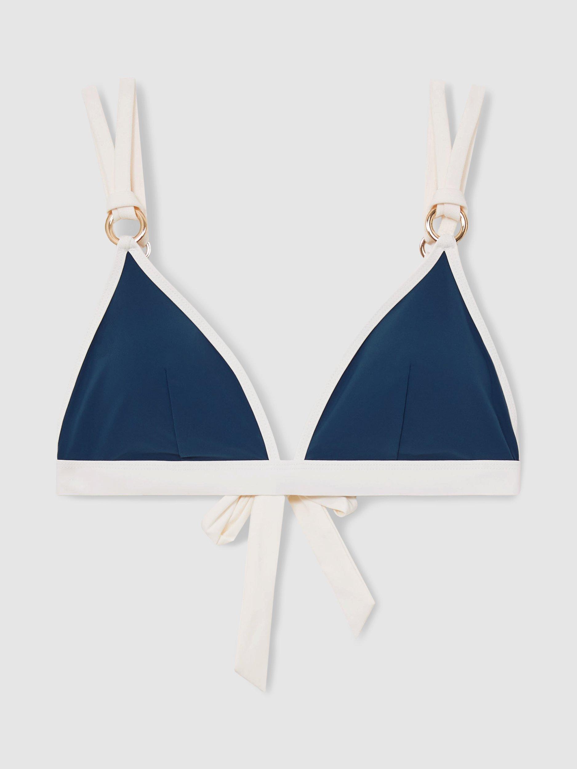 In a triangle shape, this bikini top by Reiss features contrast white tipping, adjustable straps and a self-tie back. Team yours with the corresponding bottoms or mix and match with contrasting colours for a truly unique look.