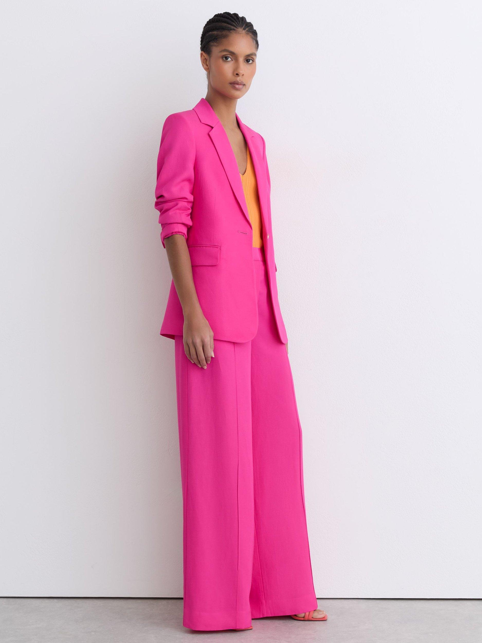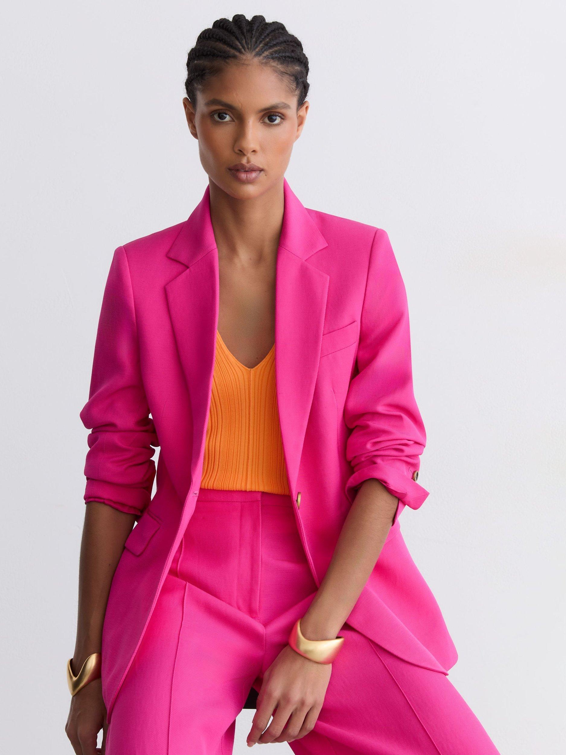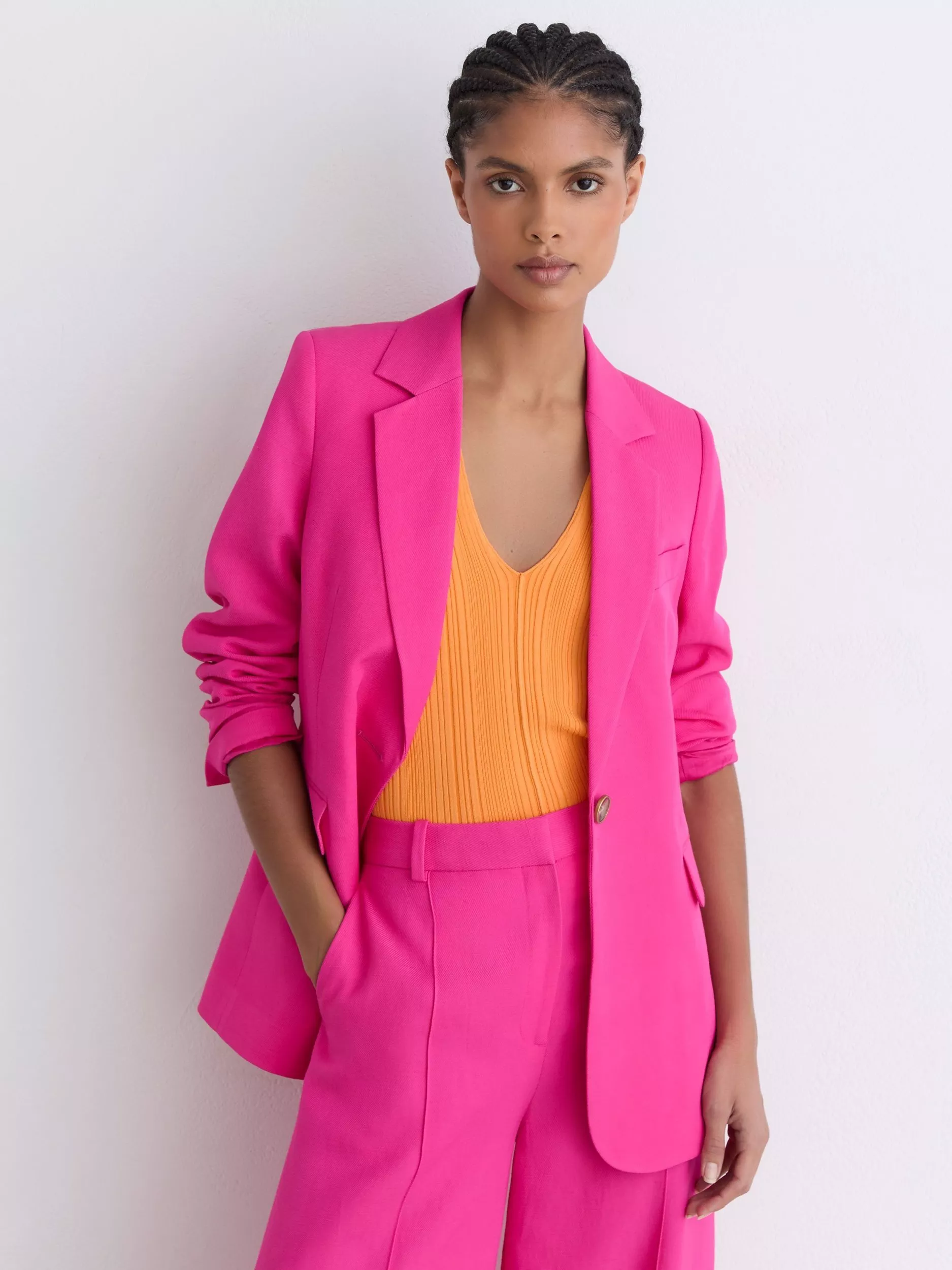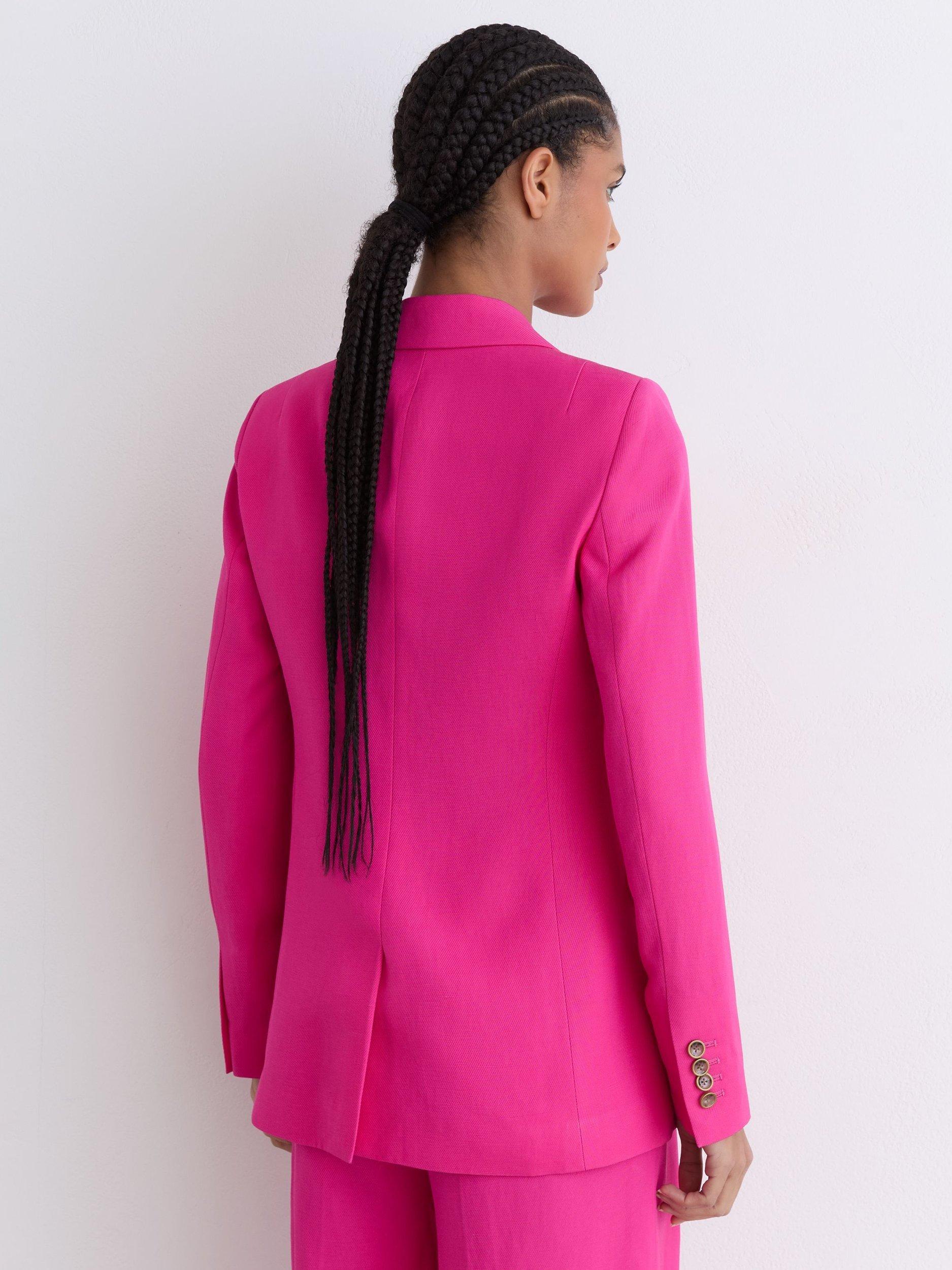 Cut for a sharp silhouette, this single-breasted blazer balances relaxed linen with a tailored edge, making it a bold layer for daywear or creative meetings.