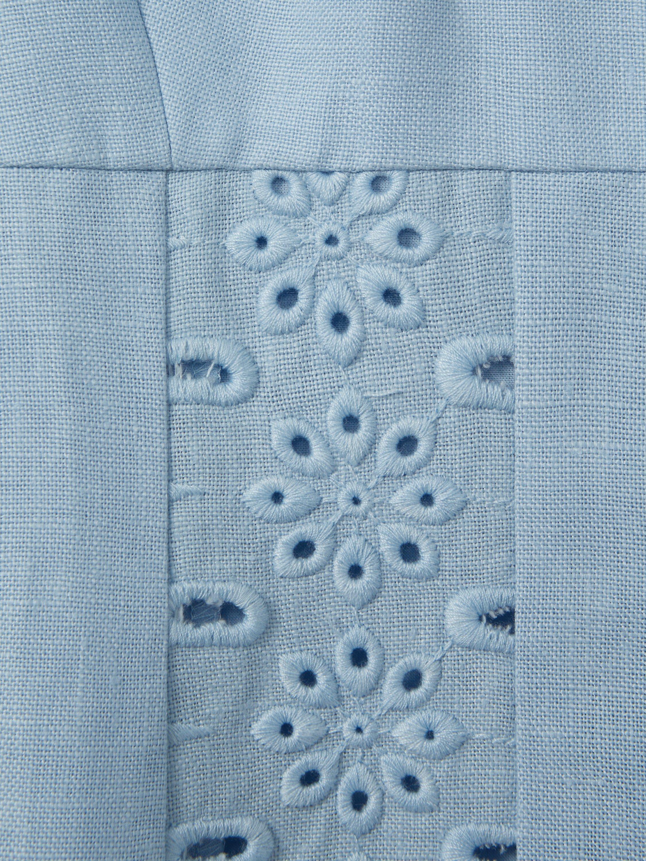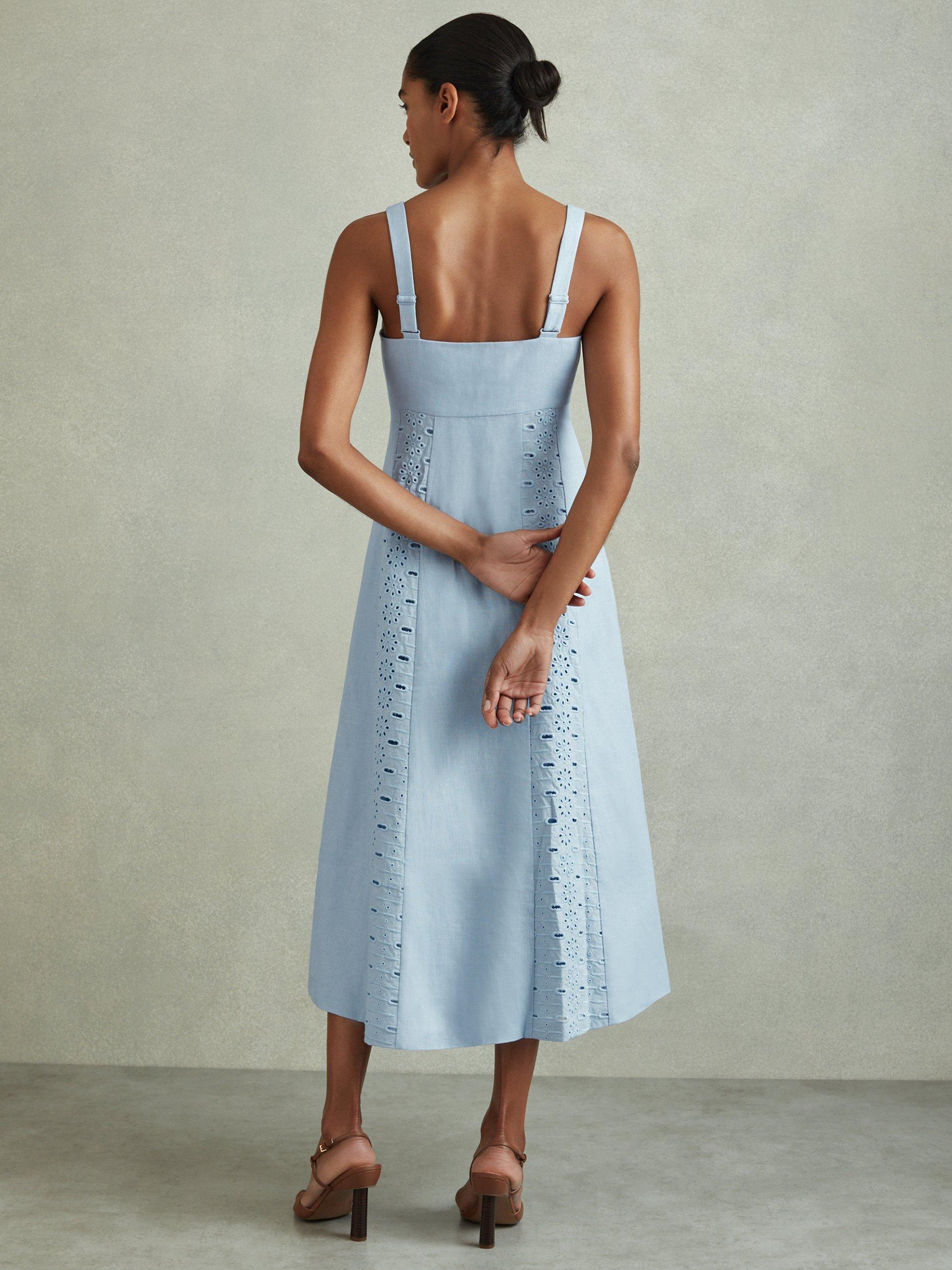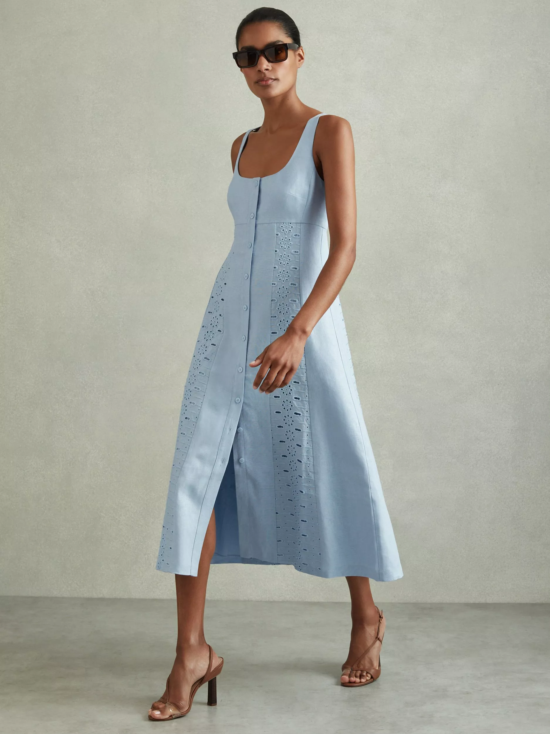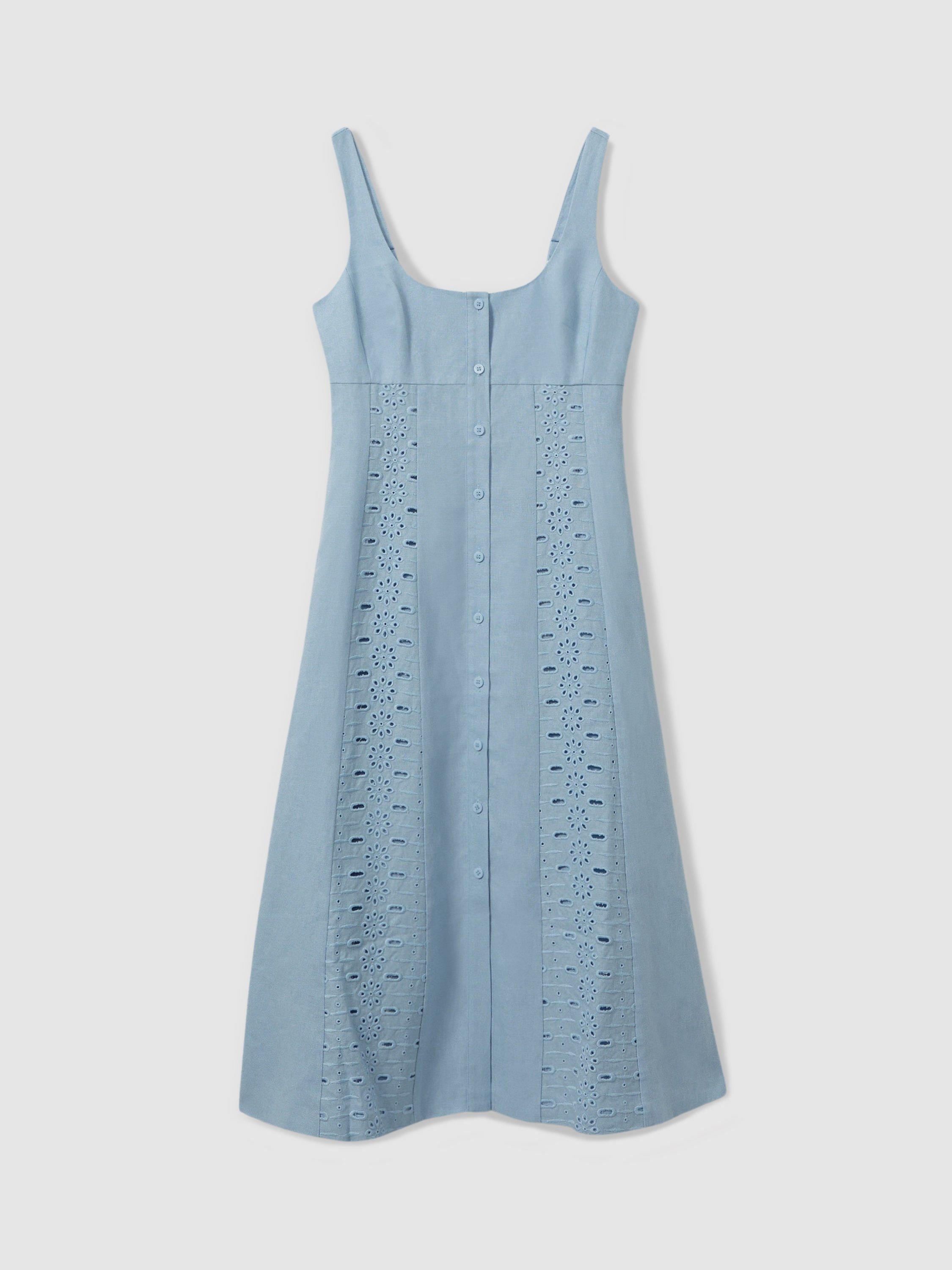 Designed with summer in mind, the Clarice linen midi dress fastens with buttons for a customisable movement through the length. Broderie detailing accents the garment from the empire waistband through to the hem.