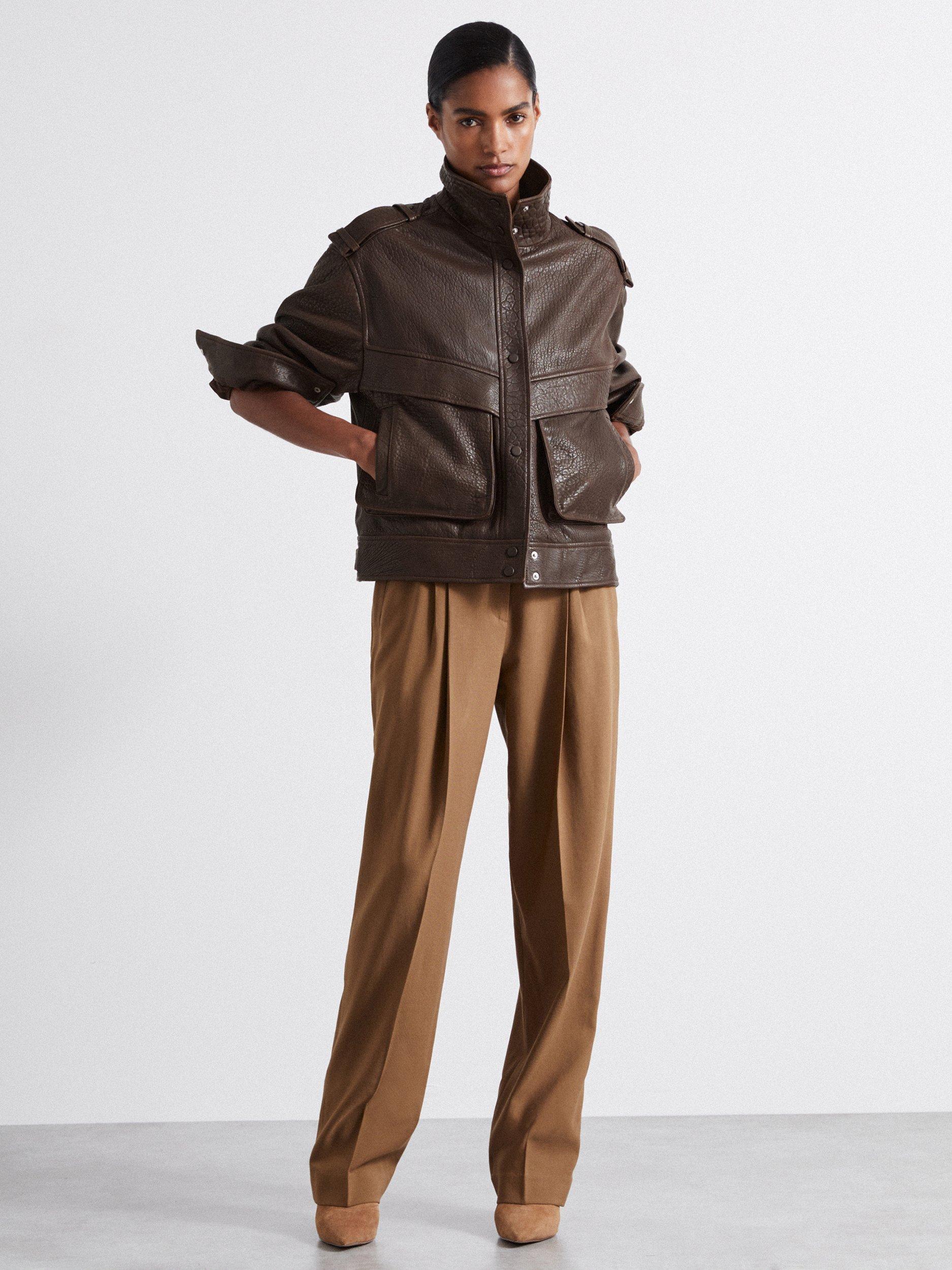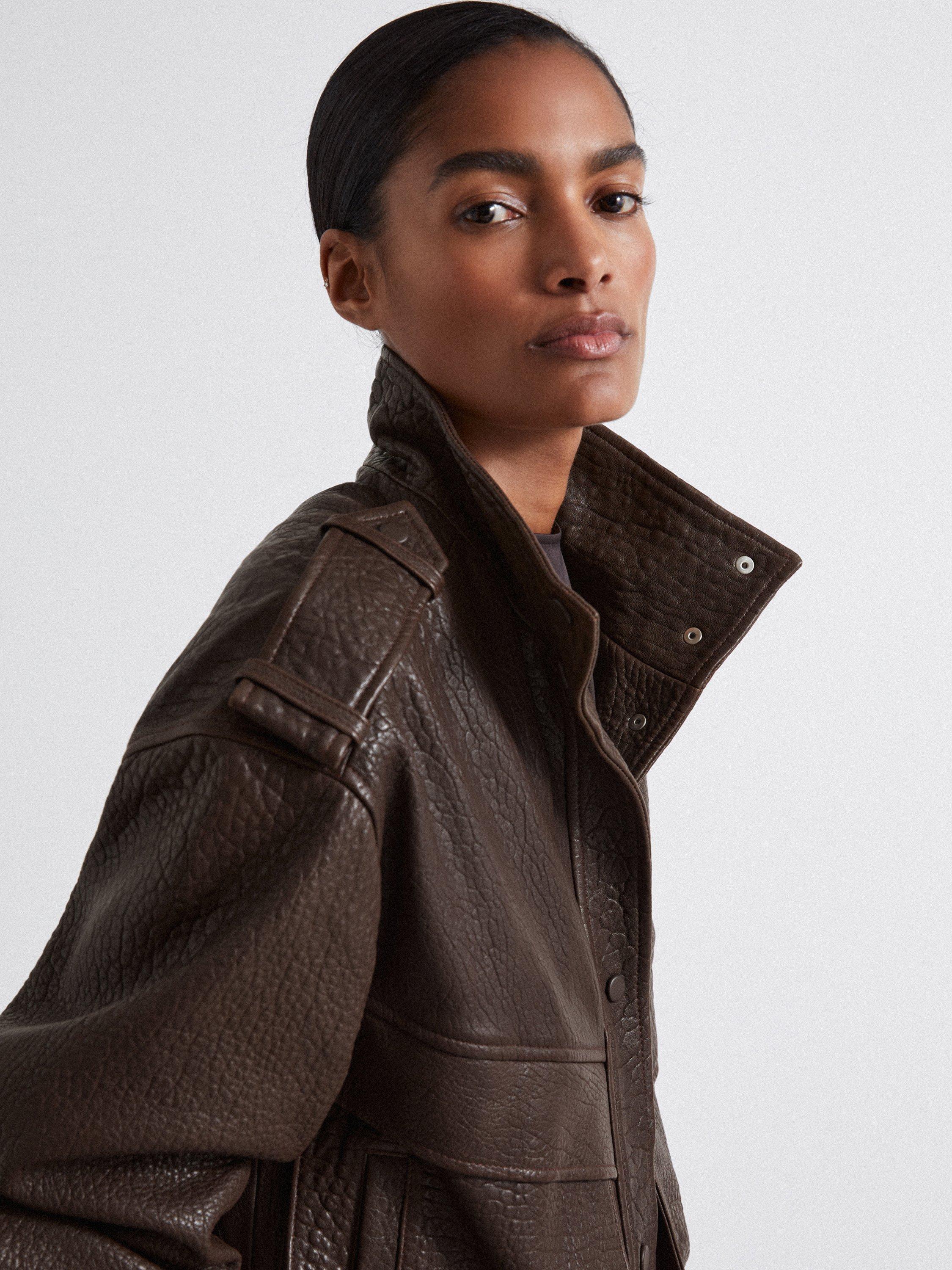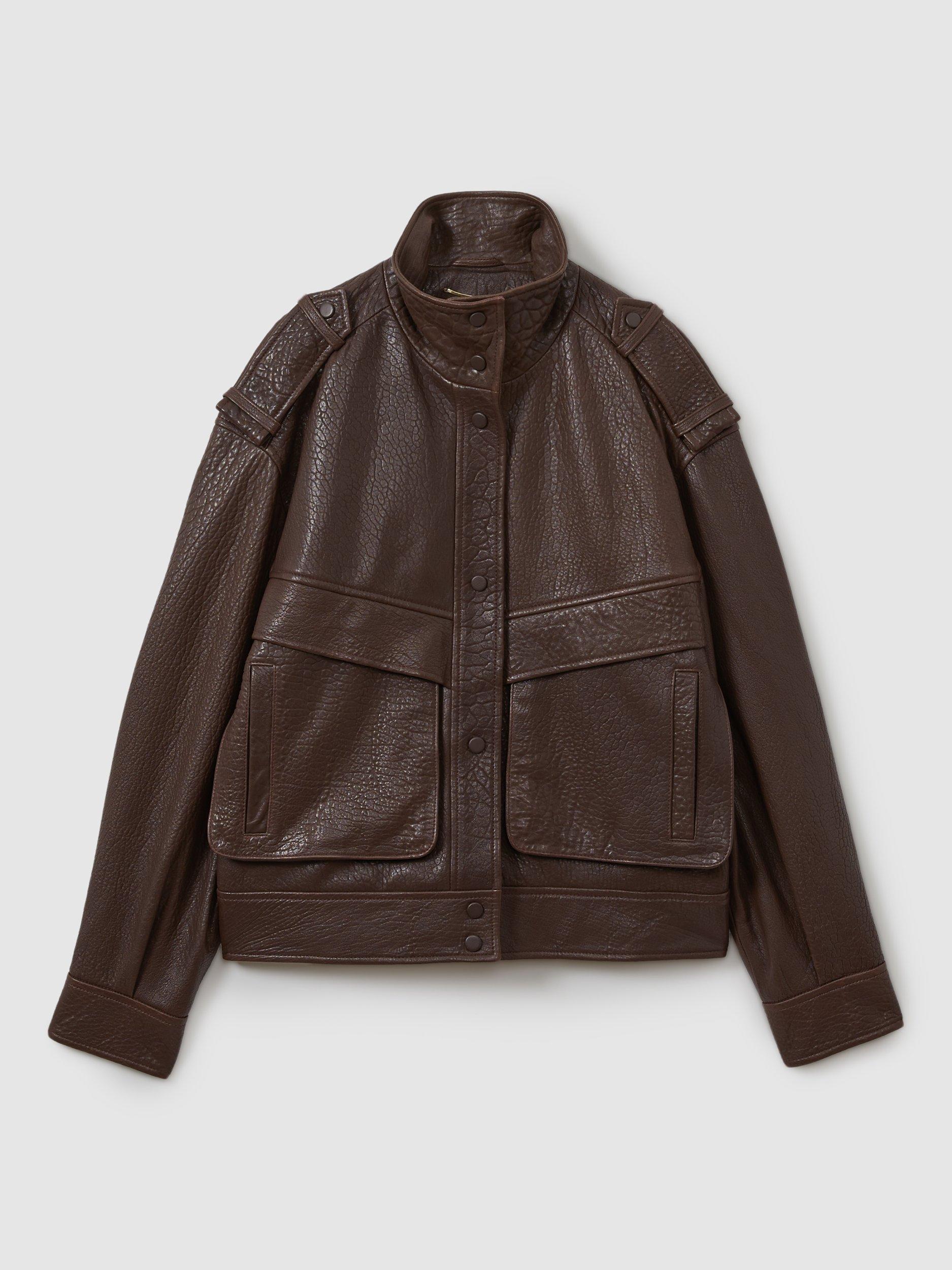 Made from heavyweight leather with a tactile grained finish, it's designed with oversized bellowed pockets.