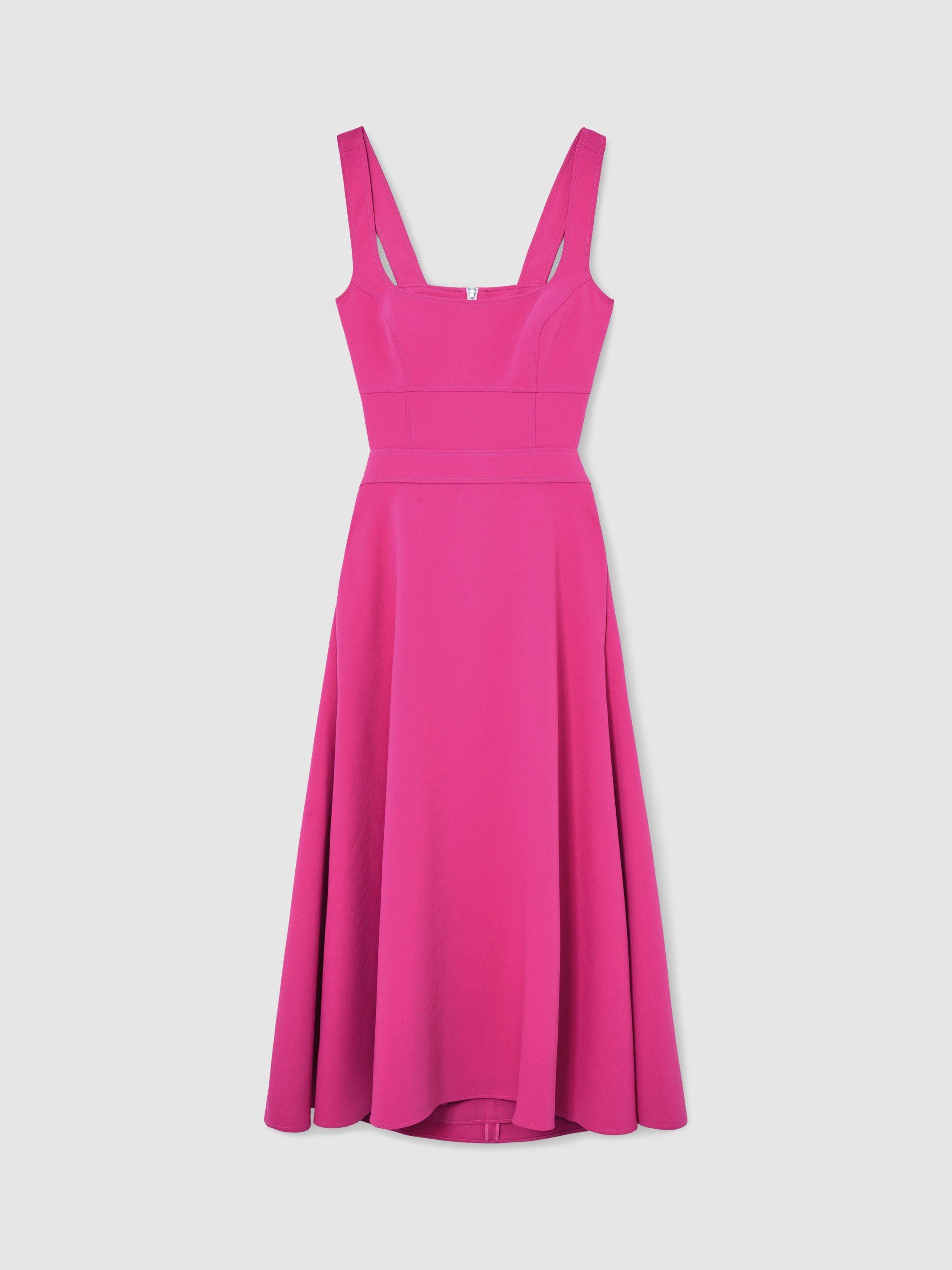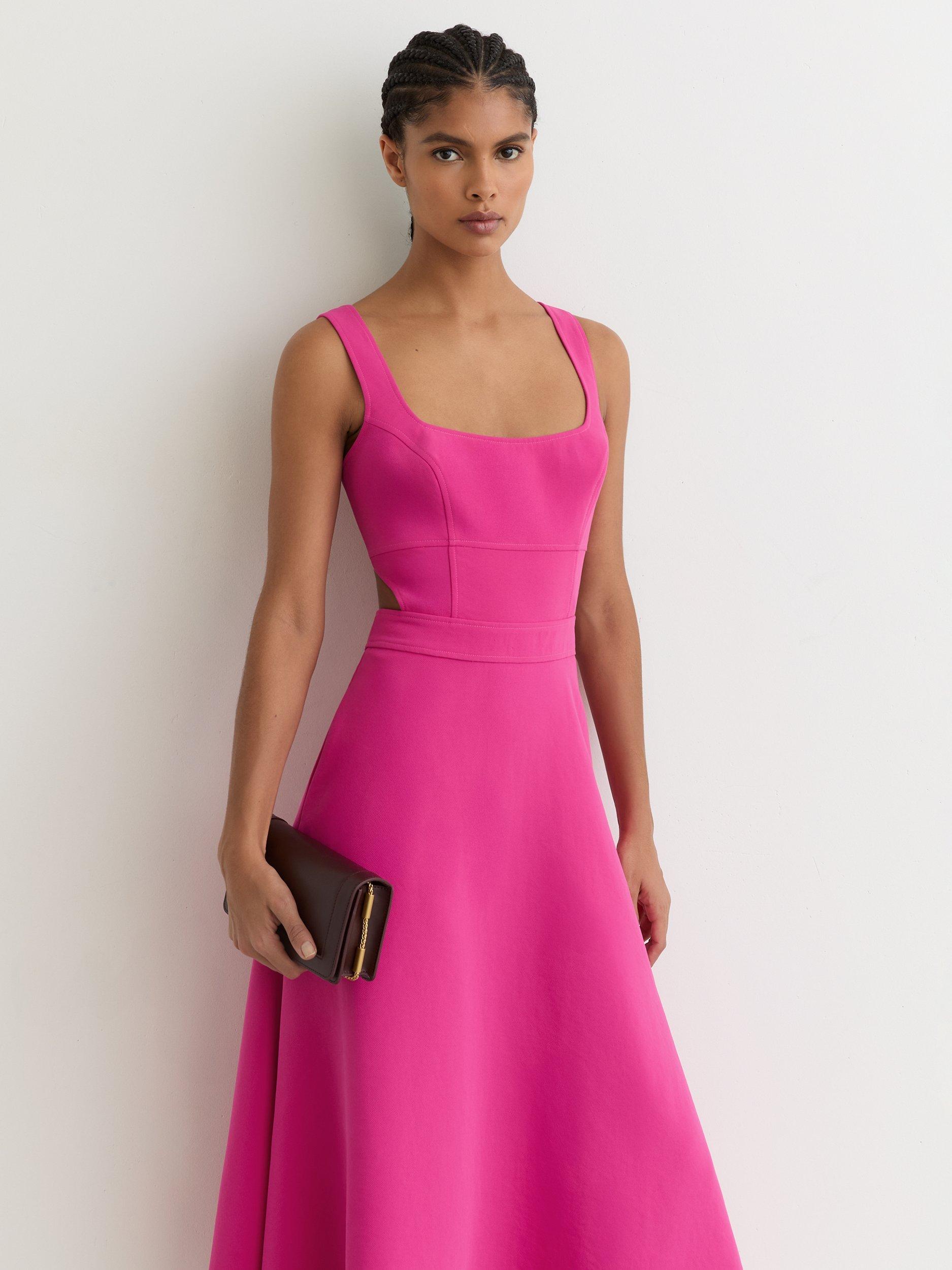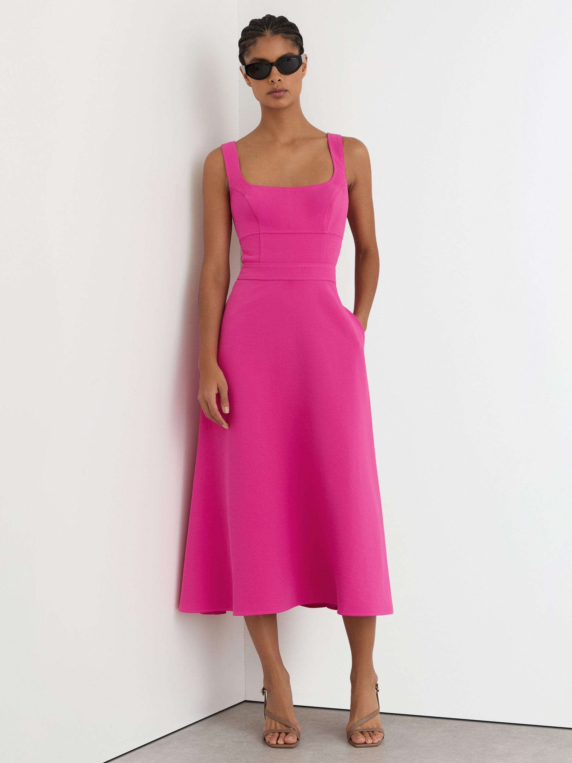 Fitted, flared, and fabulous. This sleeveless midi dress from Reiss has a square neck whilst the plain colour means it goes with everything.