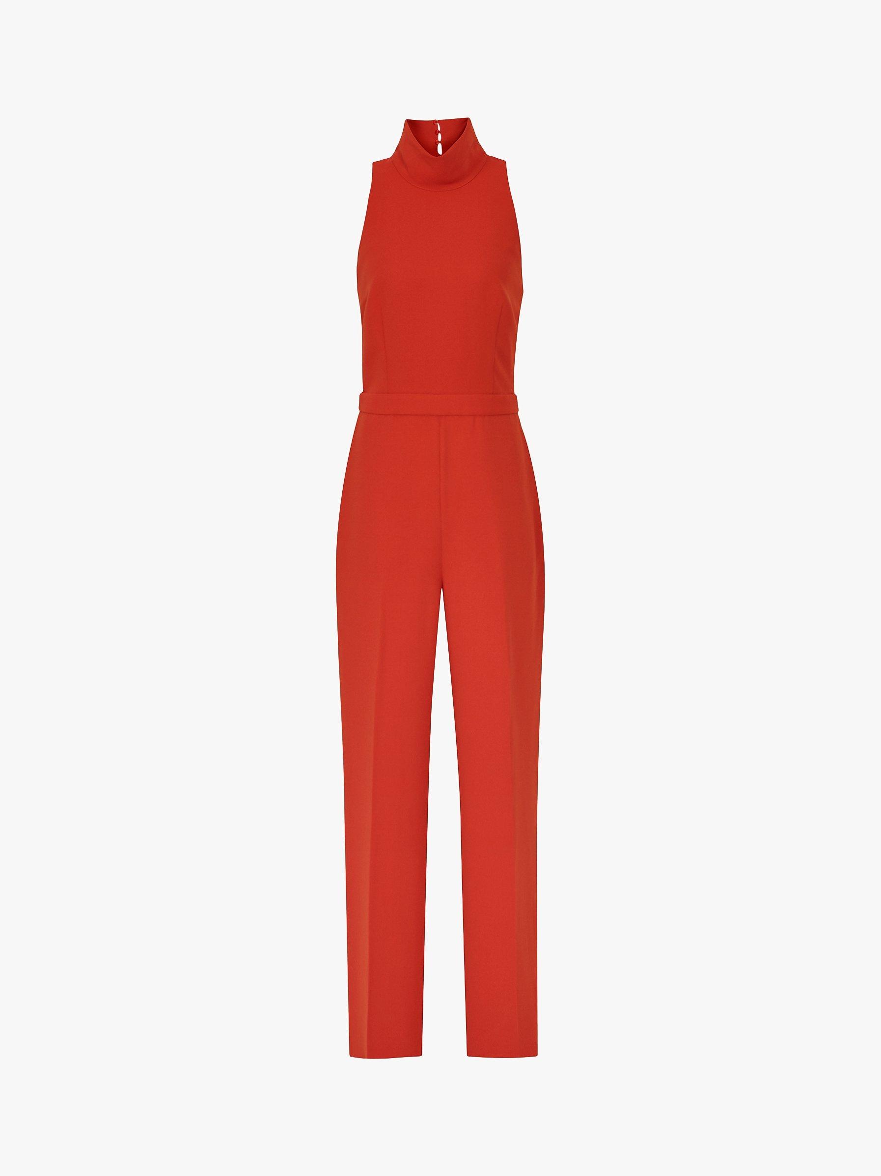 Crafted from a light material, its designed with a high-neck funnel top and high-rise tailored trousers that fall to a wide-leg silhouette. With an open-back design for added elegance, this jumpsuit will make a striking addition to your wardrobe.