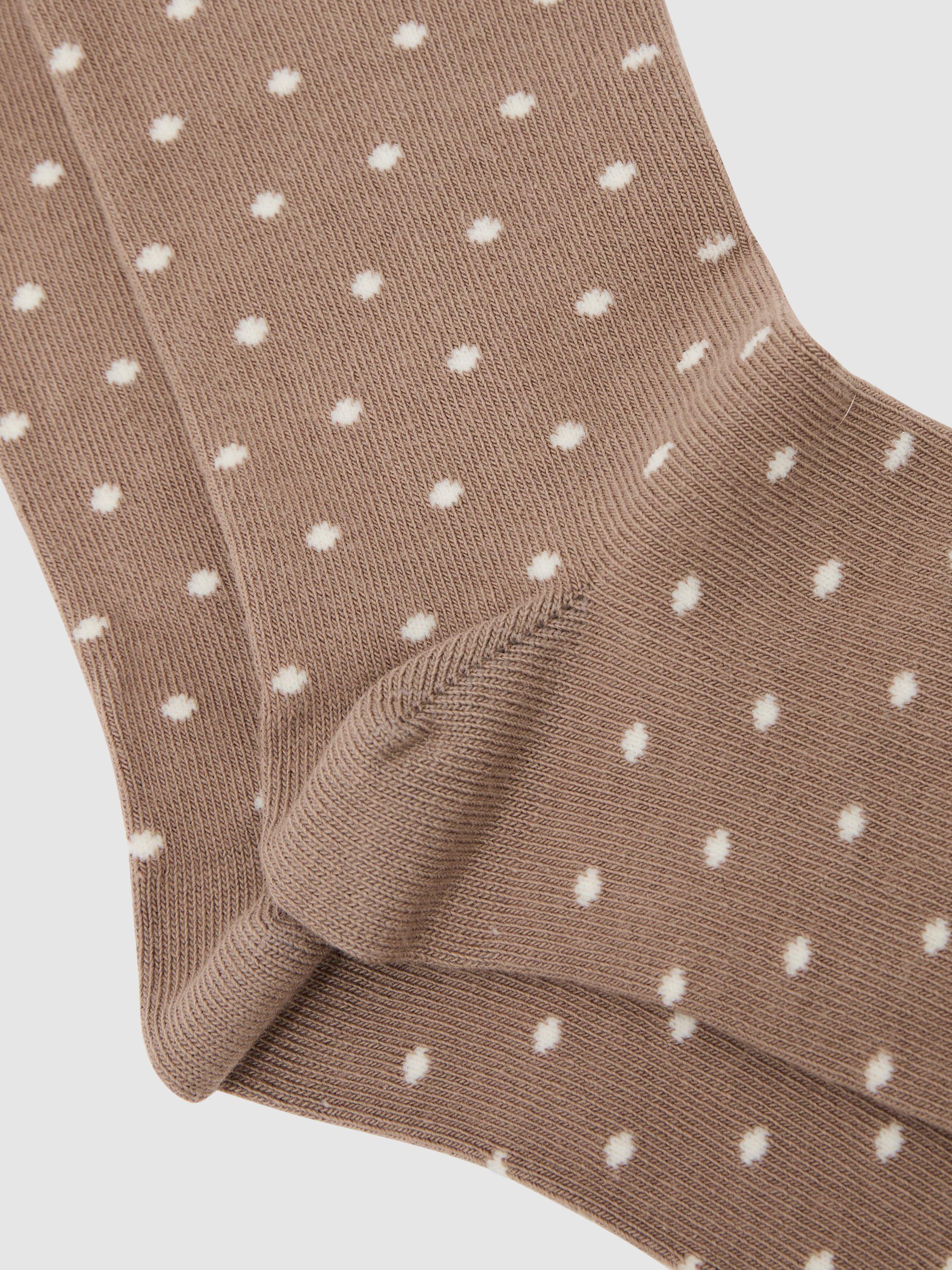 A pair of polka dot ankle socks. Designed for comfort and everyday practicality, each pair adds an unexpected twist to your outfit while fitting snugly for all-day wear.