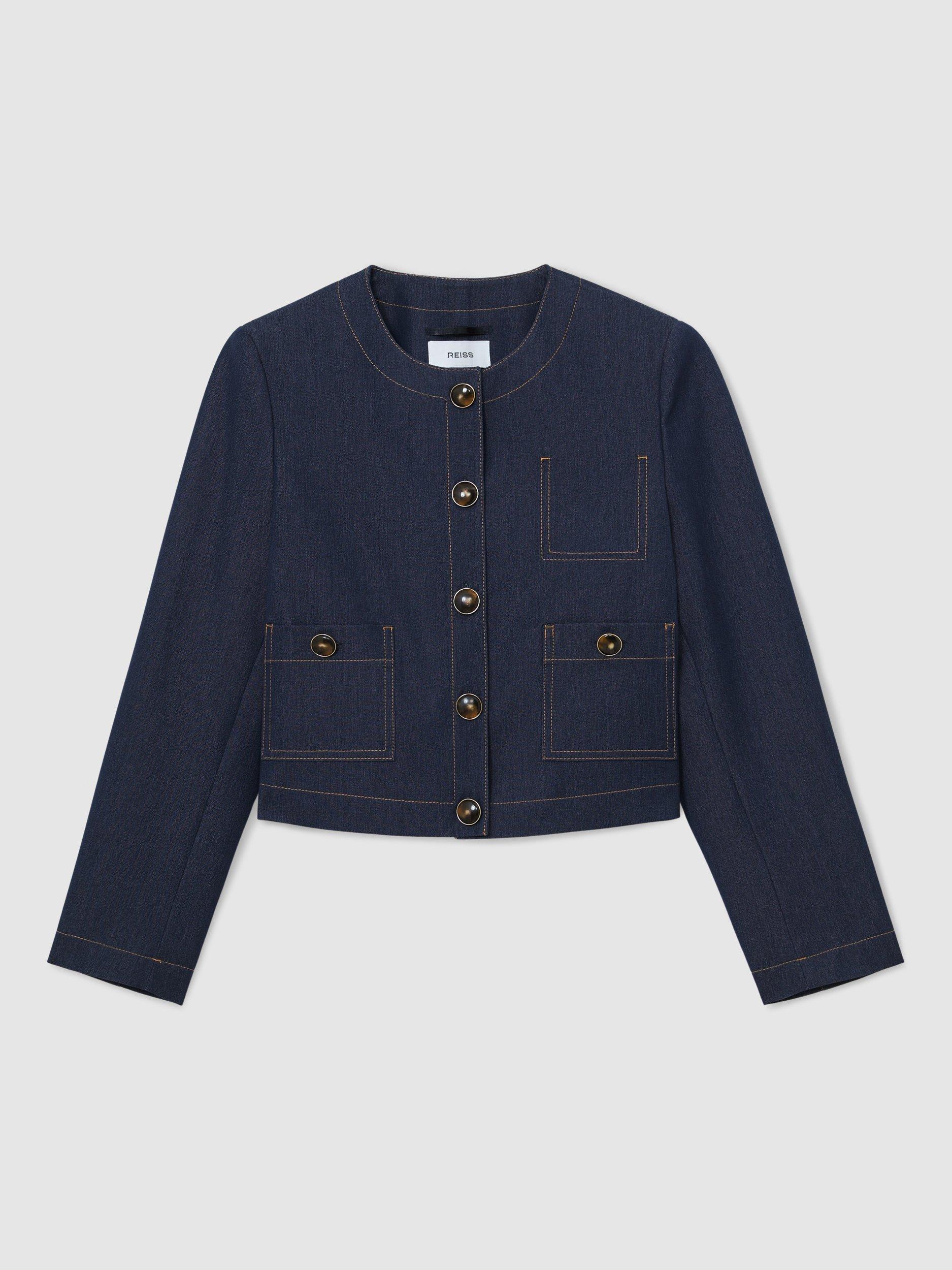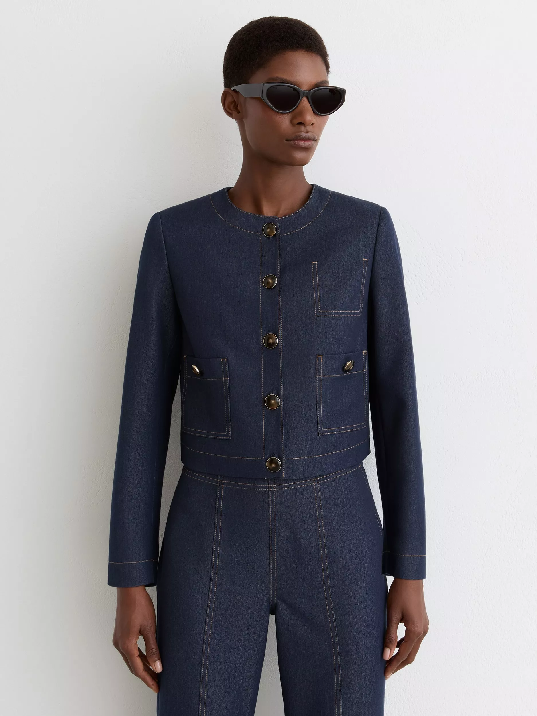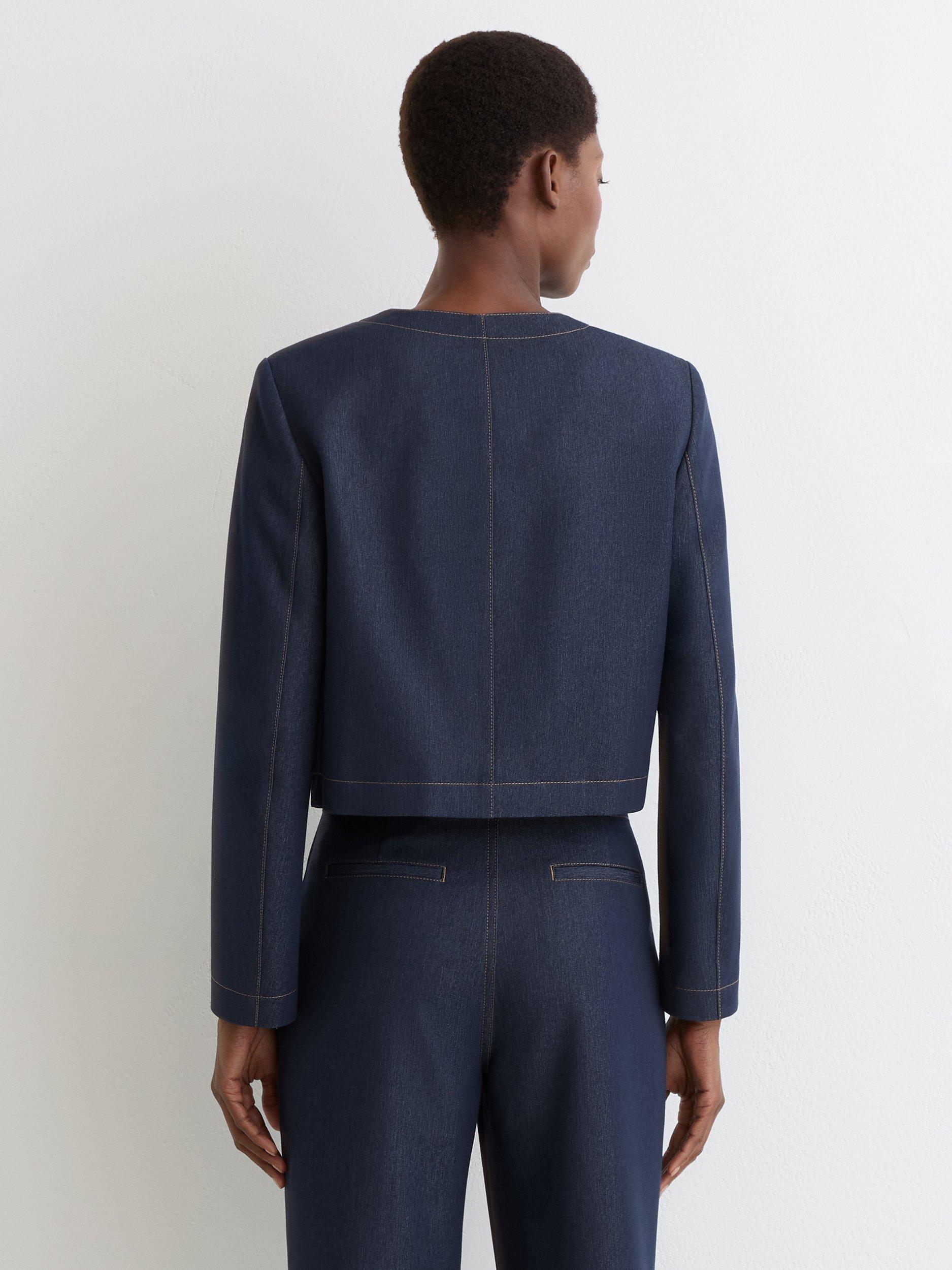 A versatile jacket, crafted from smooth, lightweight denim-look fabric with a collarless, cropped silhouette. It’s finished with contrast topstitching and horn-effect buttons.