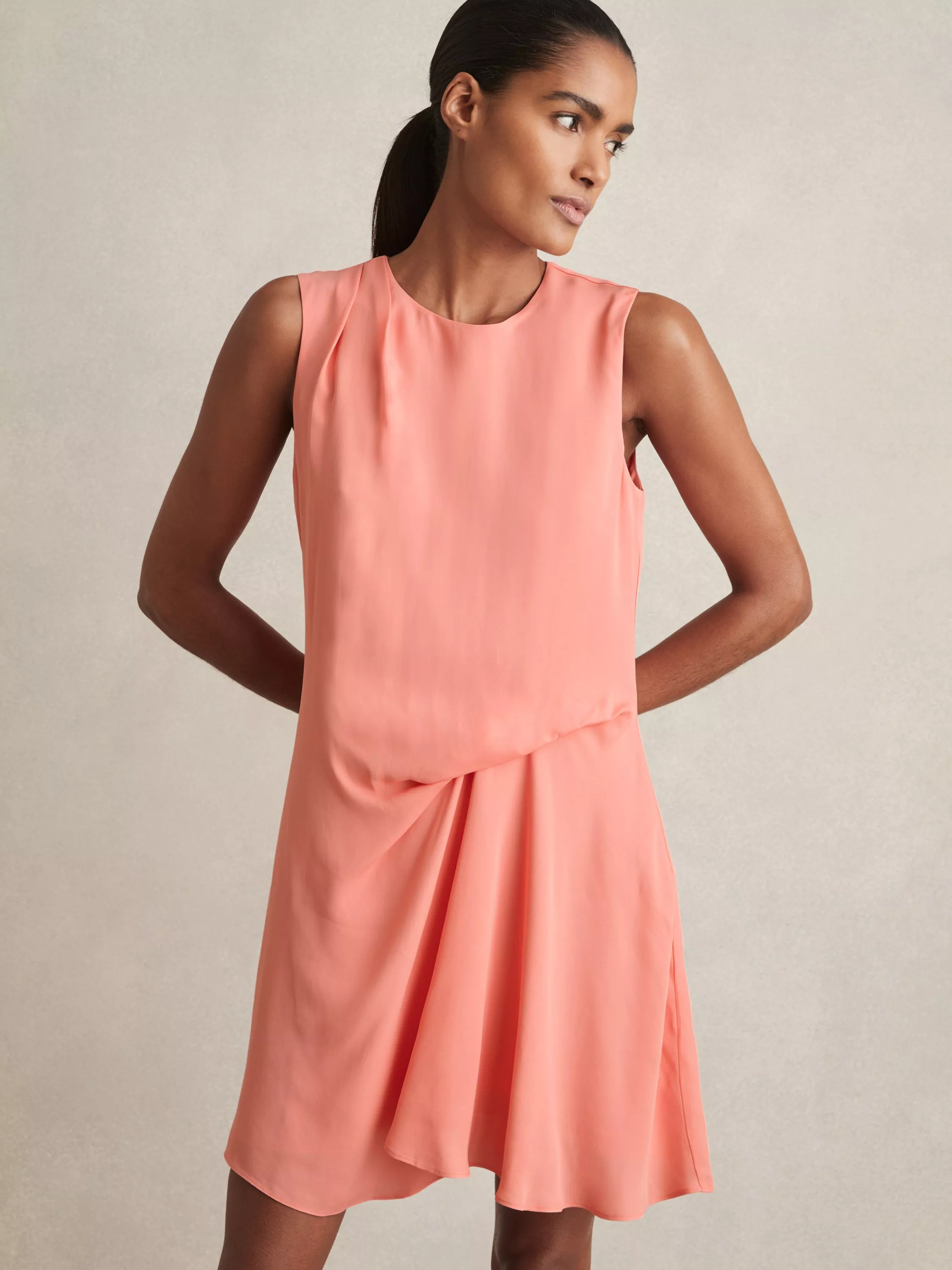In a simple A-line that's defined by gathered details that cause the fabric to drape effortlessly, this mini dress from Reiss is made from liquid-like viscose. With a fuss-free round neckline, this style comes without pattern or print so you can set your imagination and creativity free when it comes to accessorising.