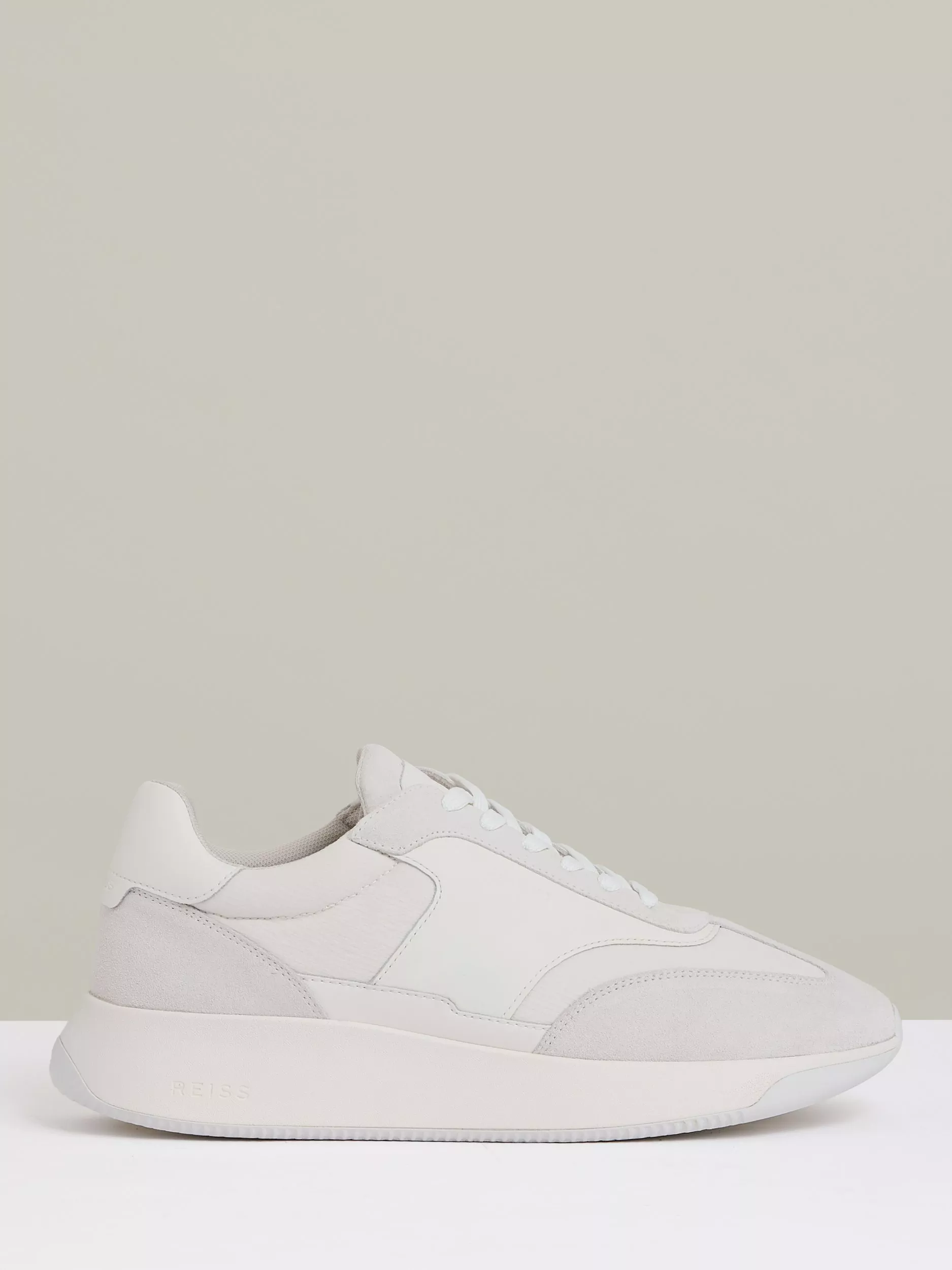 Emmett from Reiss is a lightweight pair of lace-up running trainers in all-black with a thick sole and a streamlined colour-block design. Suede, leather, and mesh details feature throughout.