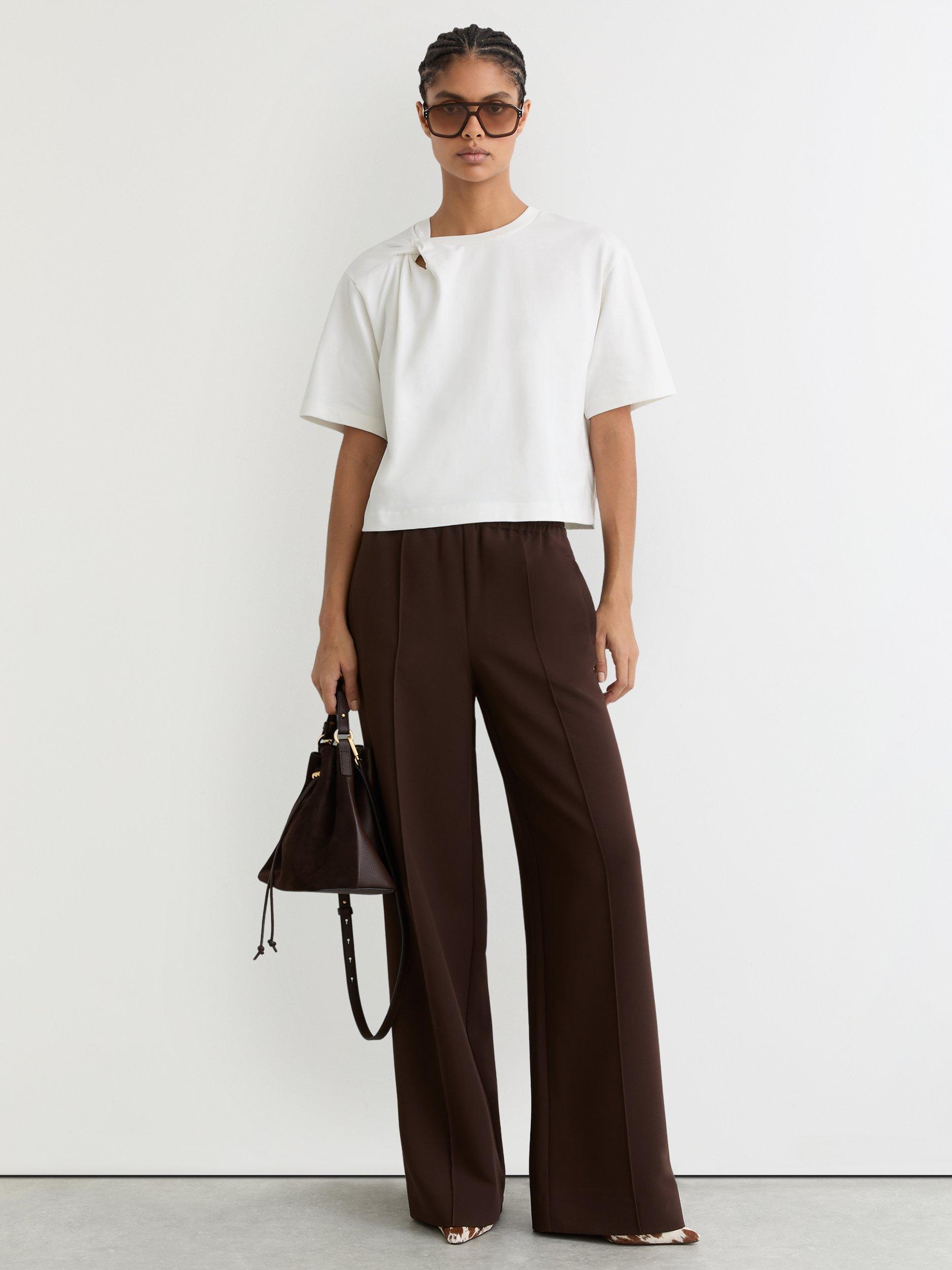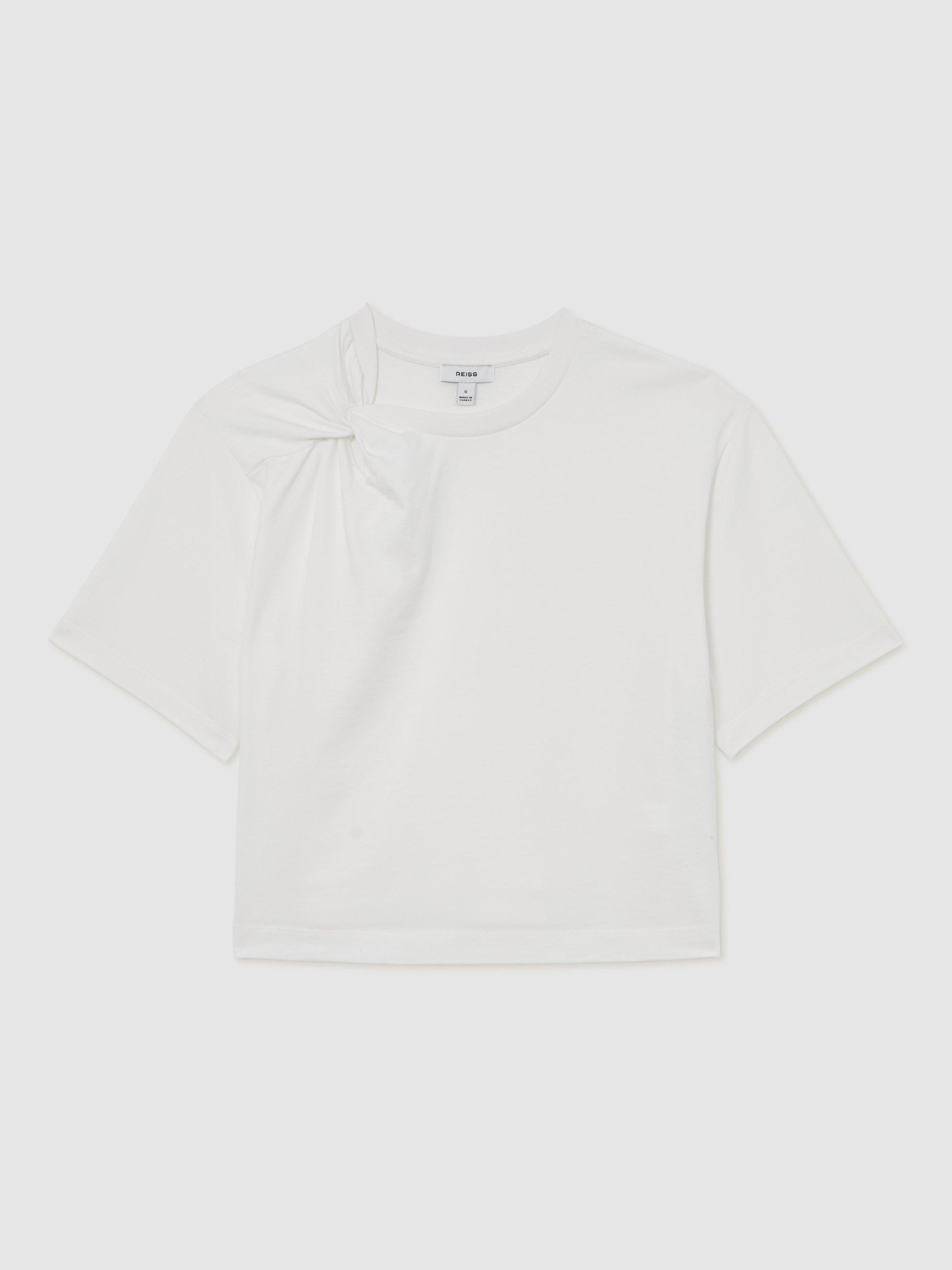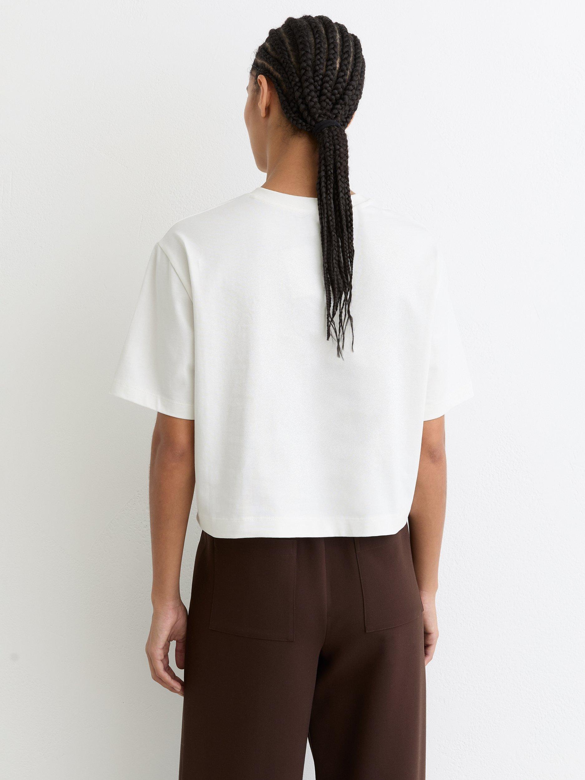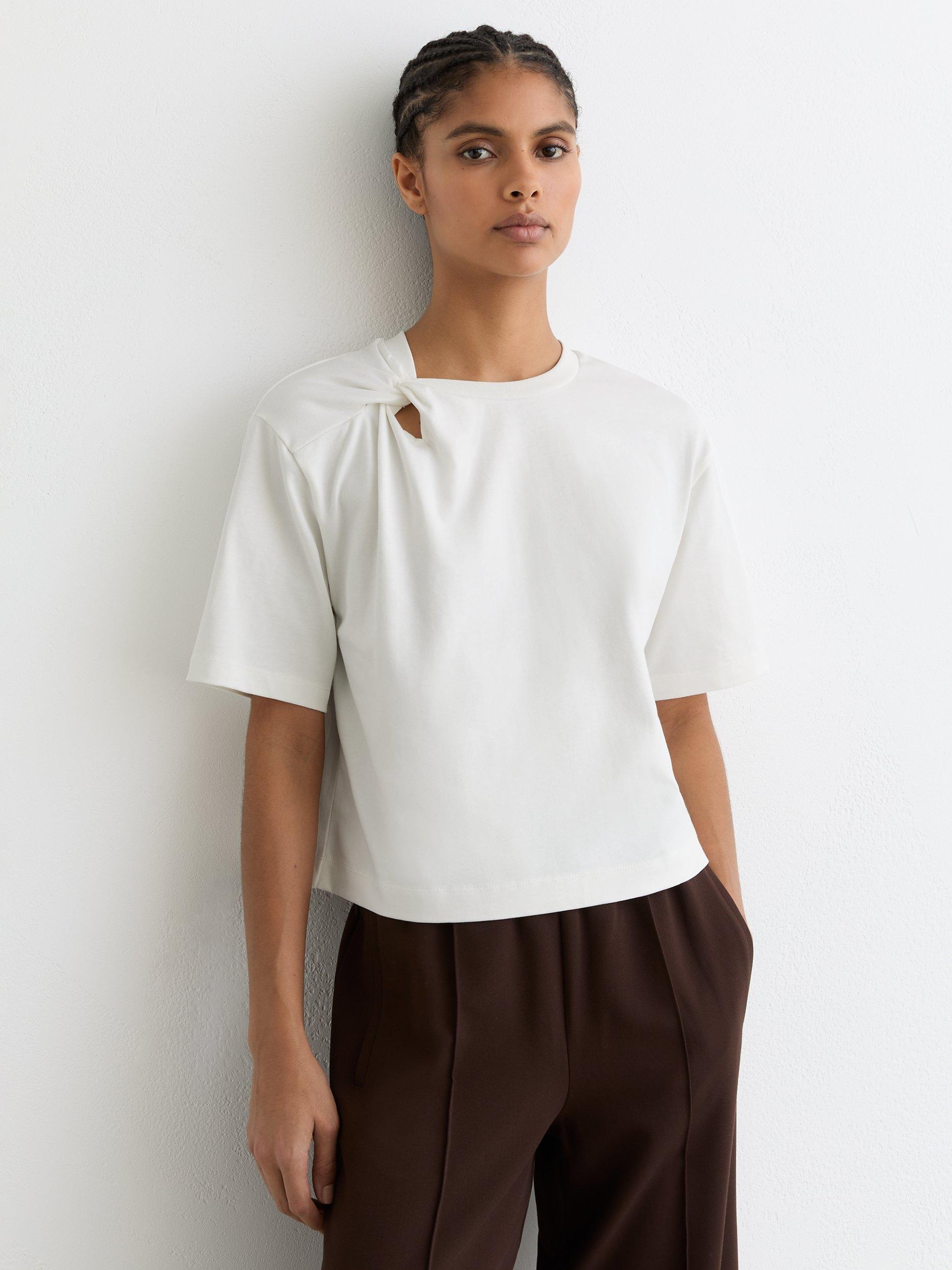 Lightweight and crisp, this cropped cotton T-shirt brings a fresh edge to your daily style. The crew neck and short sleeves create a classic silhouette, while the twist detail on the shoulder adds a unique detail.