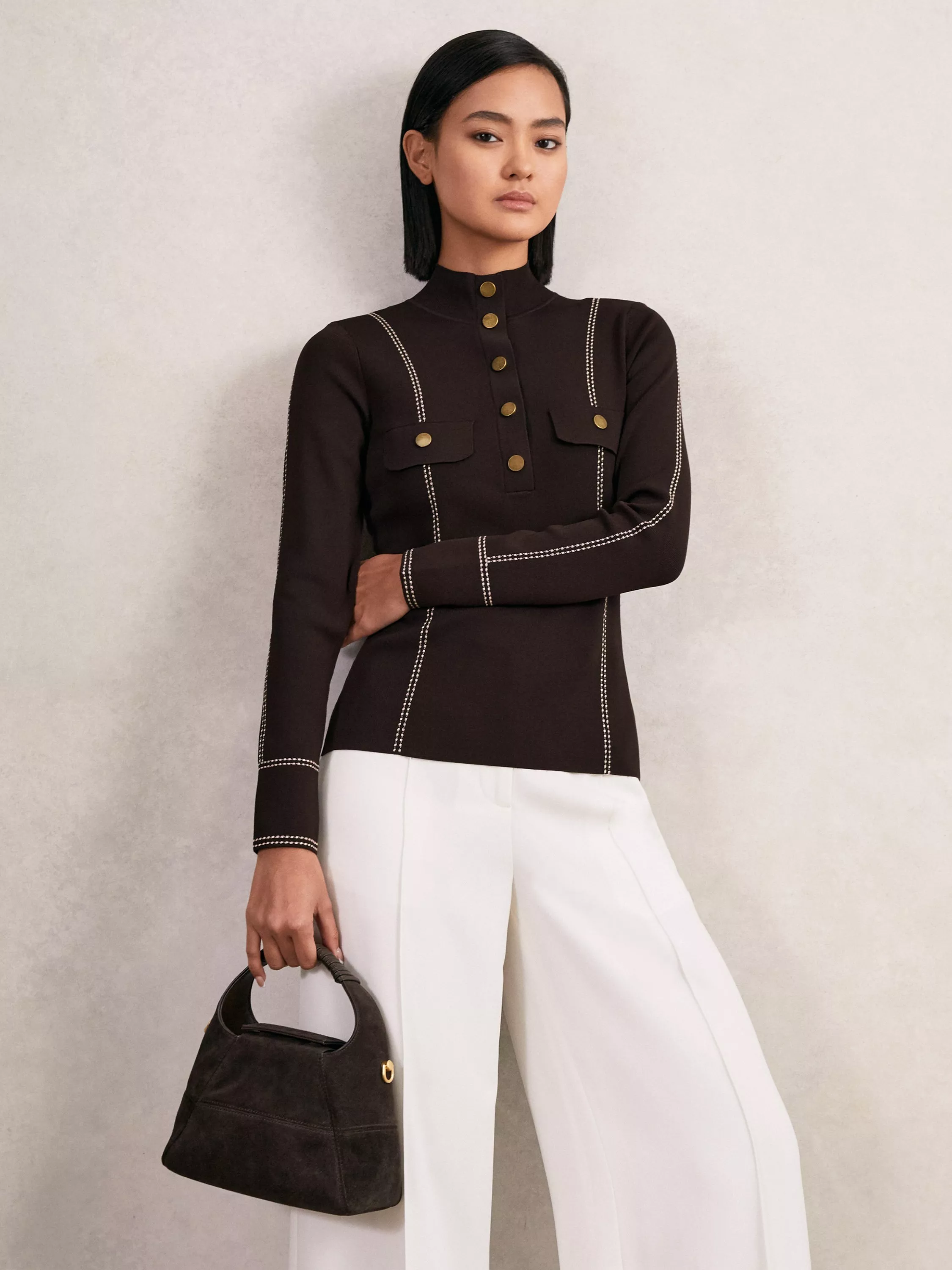 This button detail top features a smart neck and long sleeves, blending comfort and versatility for your everyday plans. The perfect companion to patterned layers, it's an easy daytime option.