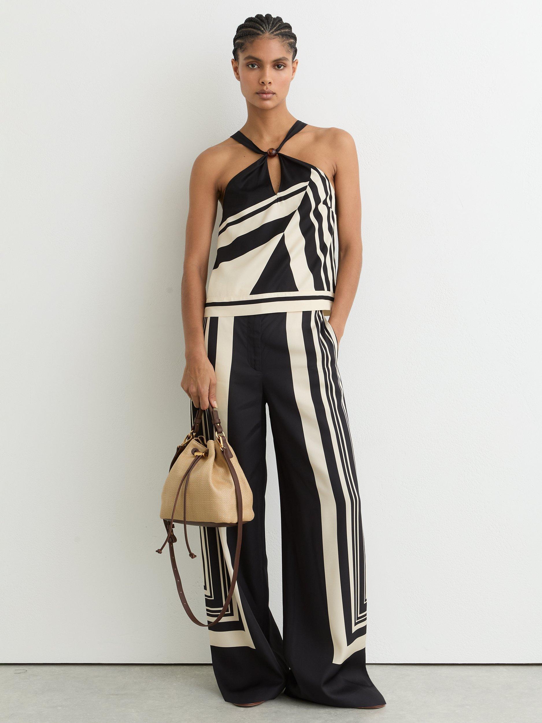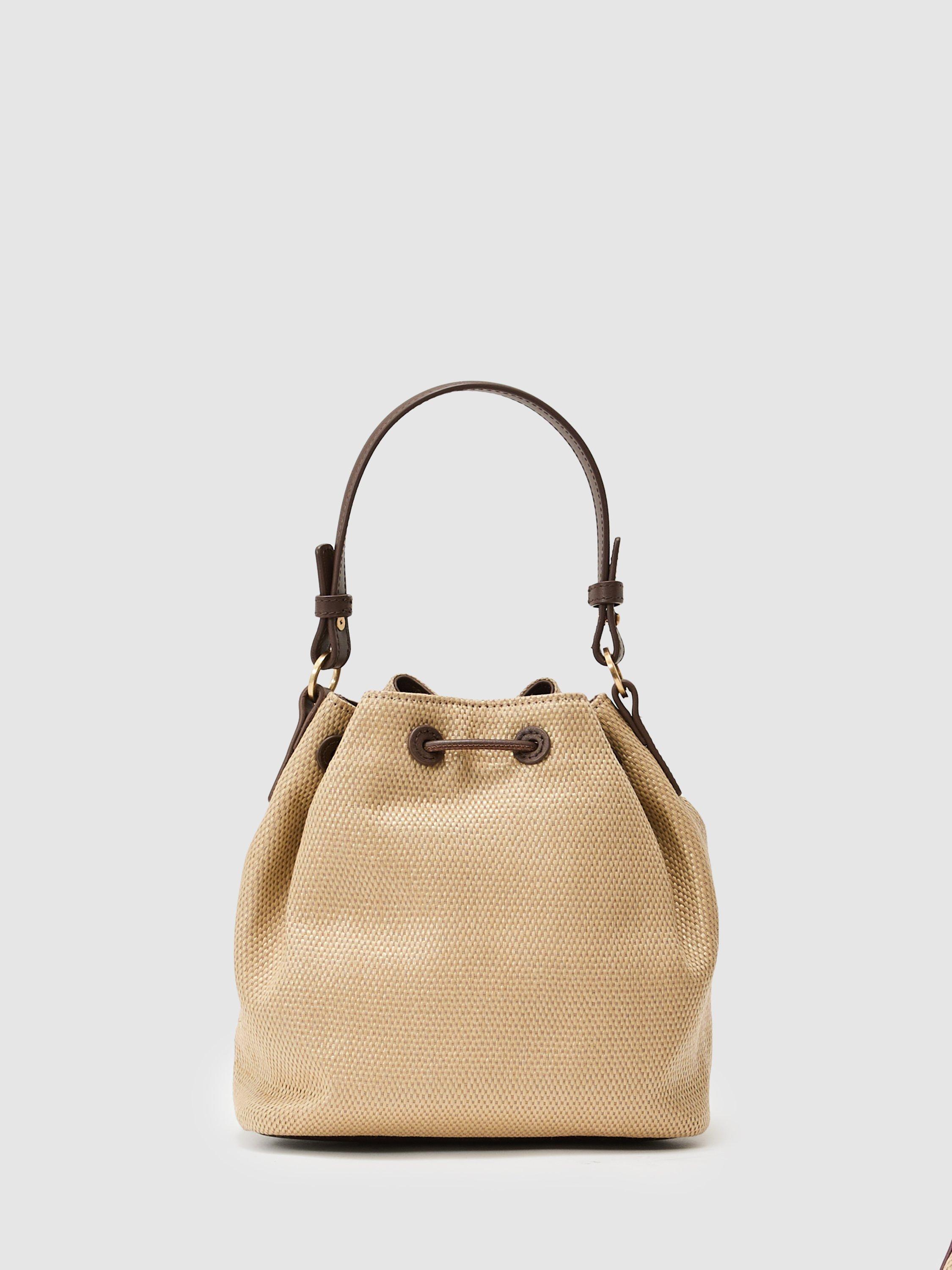 The natural Evie bucket bag is crafted in a woven raffia-effect with a leather drawcord and toggle closure. Removable and adjustable leather straps offer versatile styling.