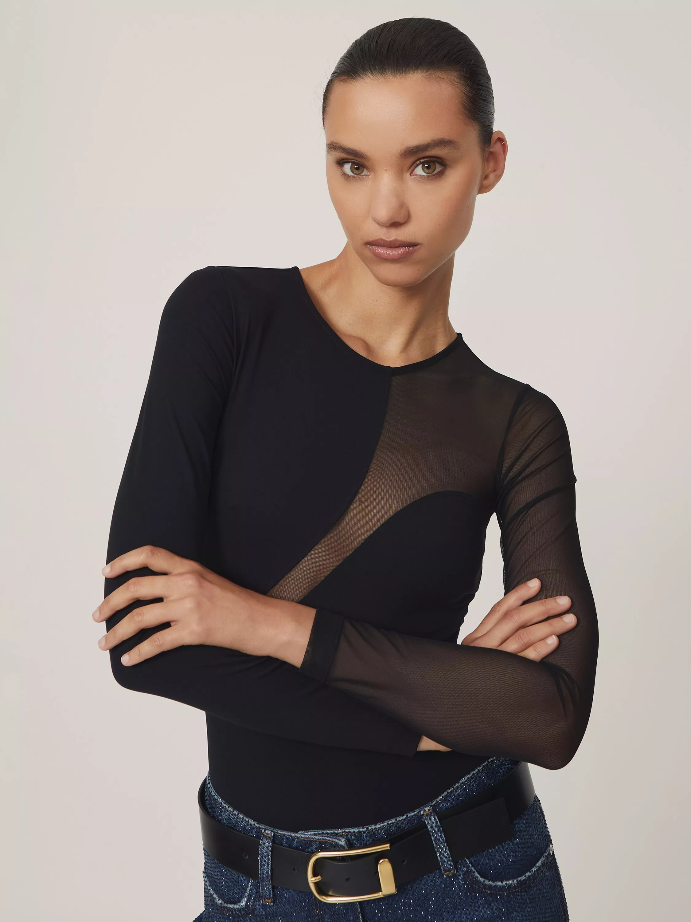 A sheer panel bodysuit from Reiss. Featuring a round neck and long sleeves, it comes in a mix-and-match ready plain colour.