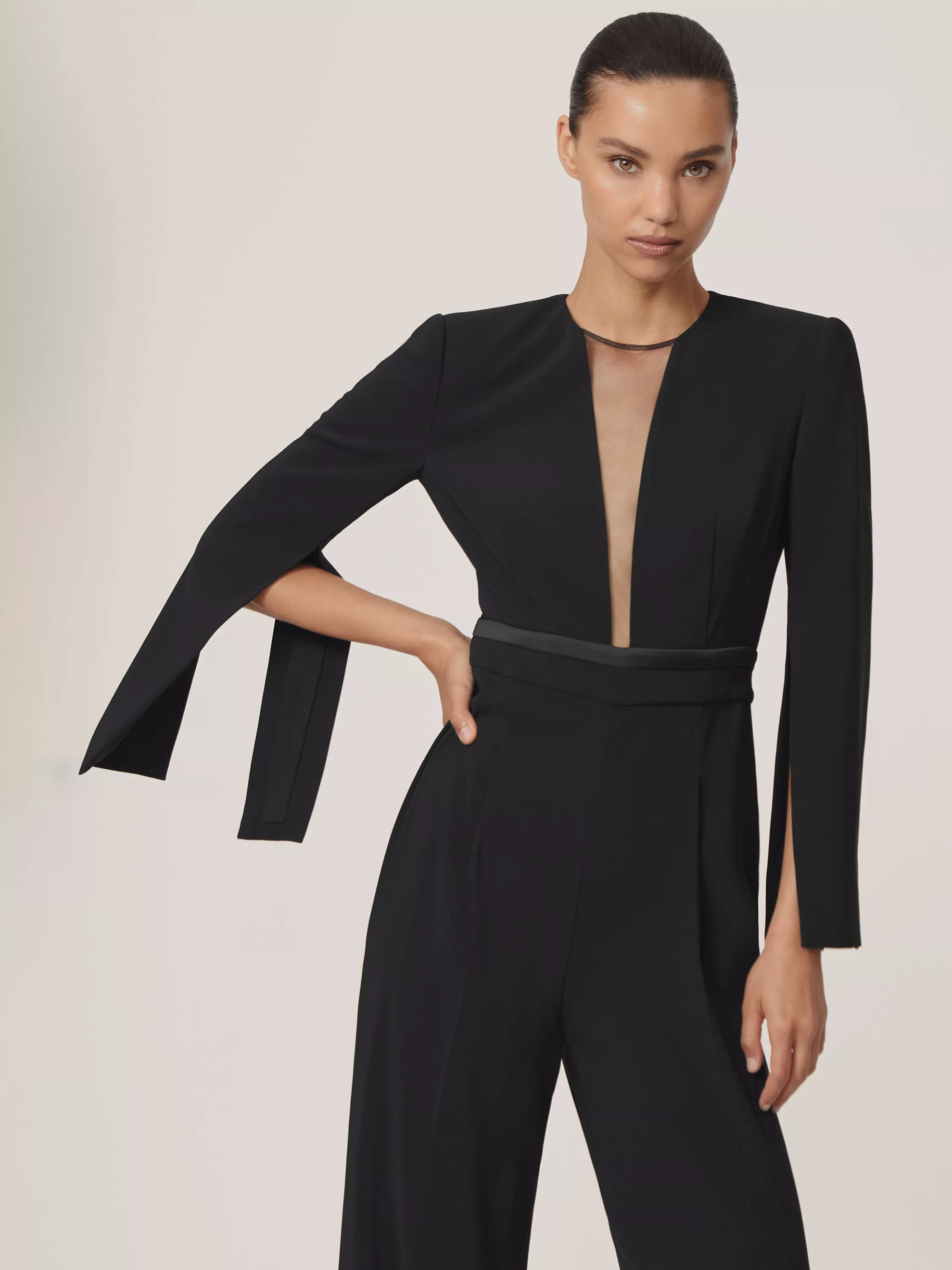With a sheer plunge panel and statement split sleeves, this long jumpsuit shapes your silhouette. With a crew neck and tailored wide-leg silhouette, it offers comfort and sophistication for nights you want to remember.