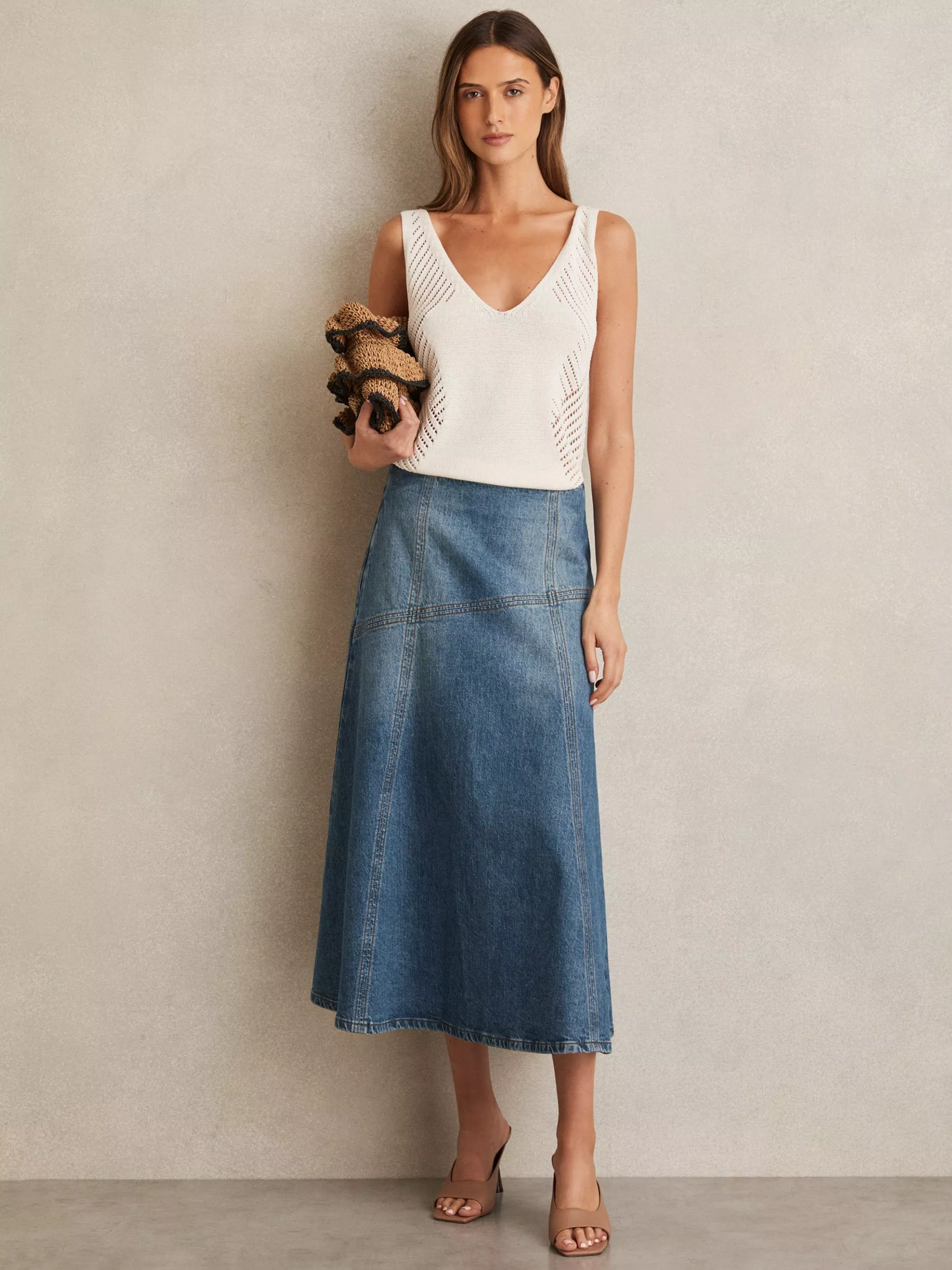 Tailored for movement, this midi skirt is designed by Reiss. Carved to a comfortable A-line, it's blended from cotton with a mid rise and patchwork print. Fastens with a zip.