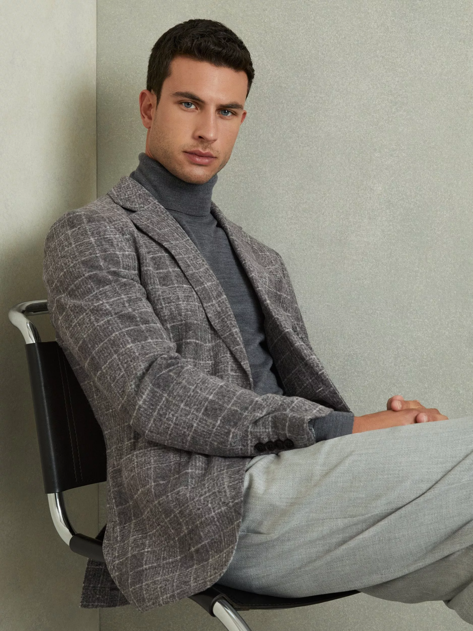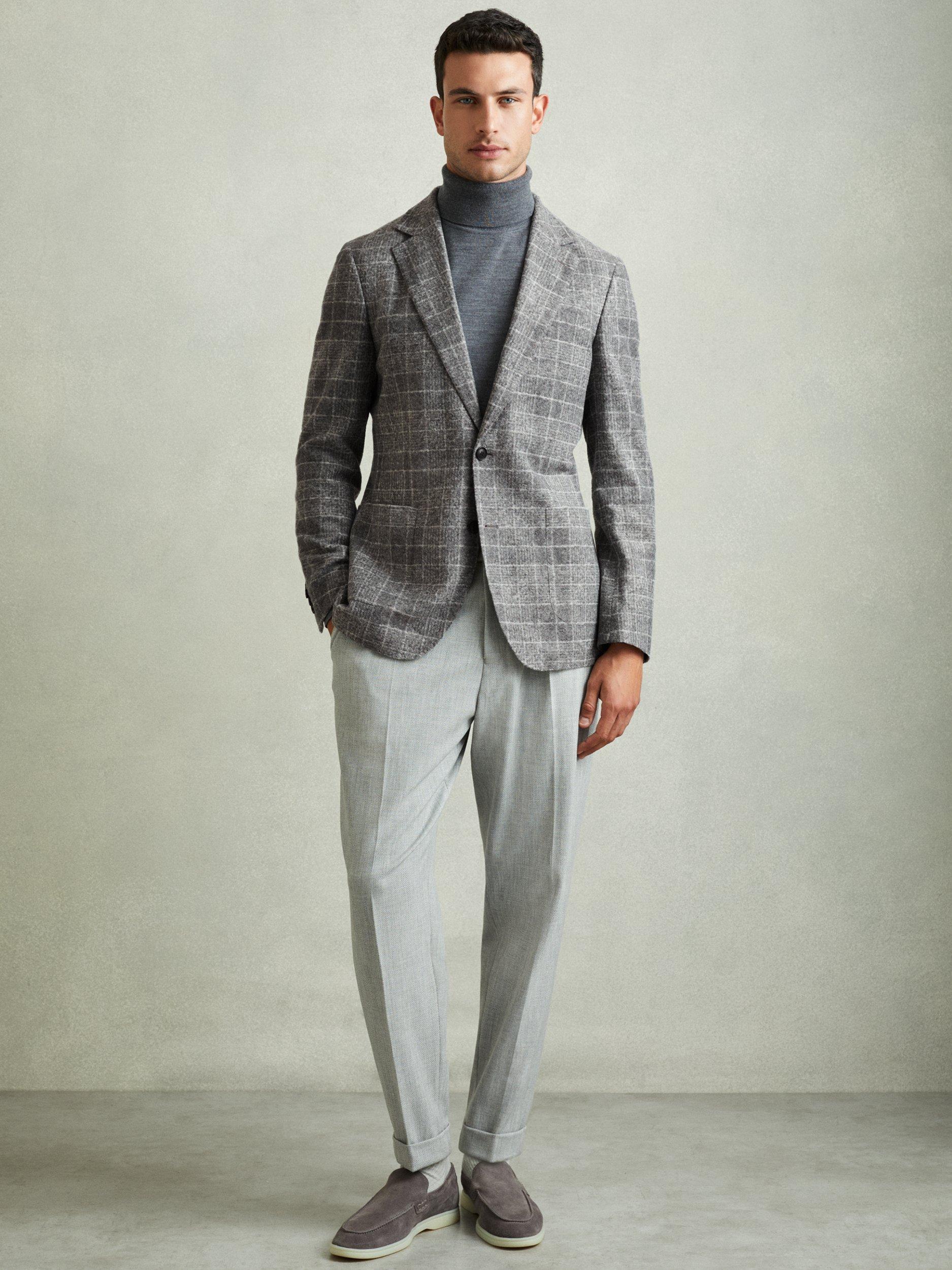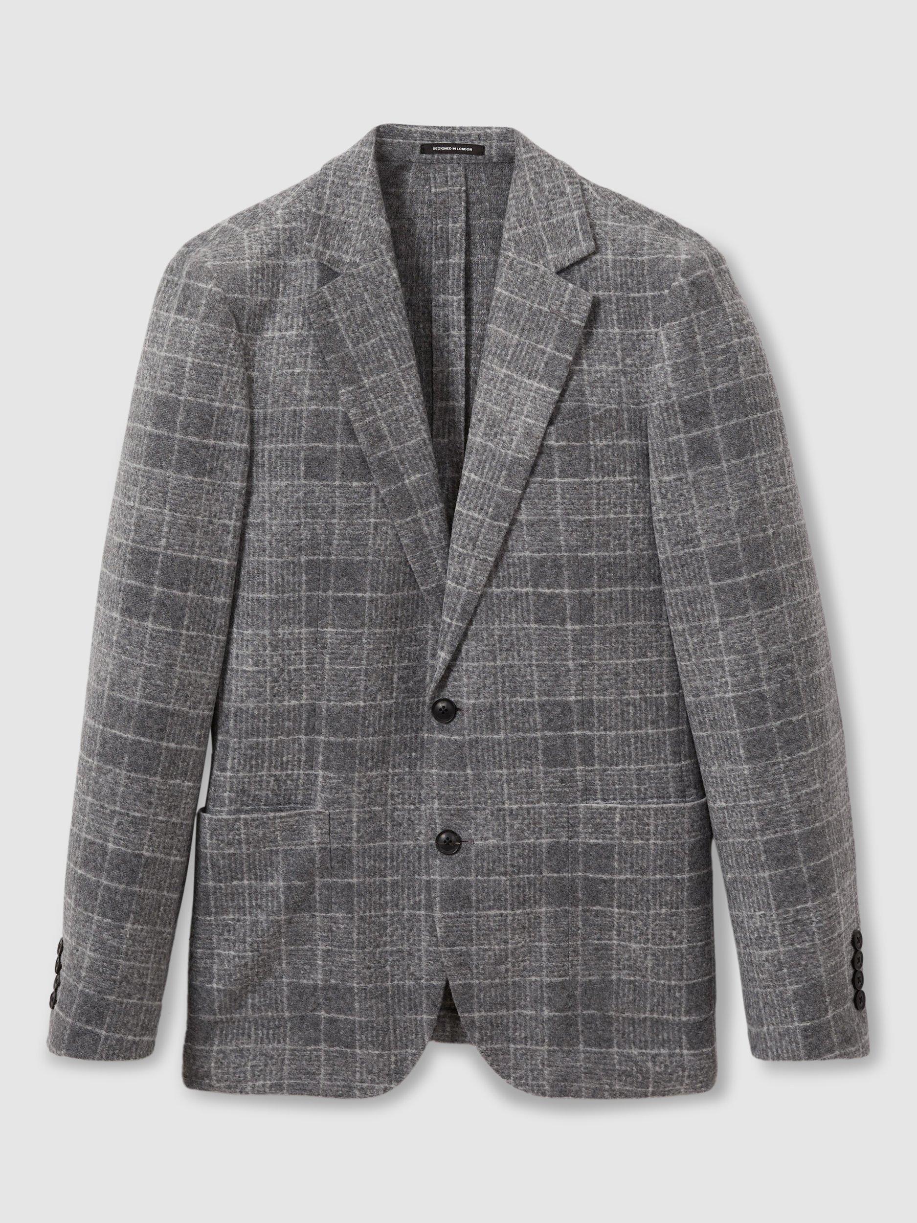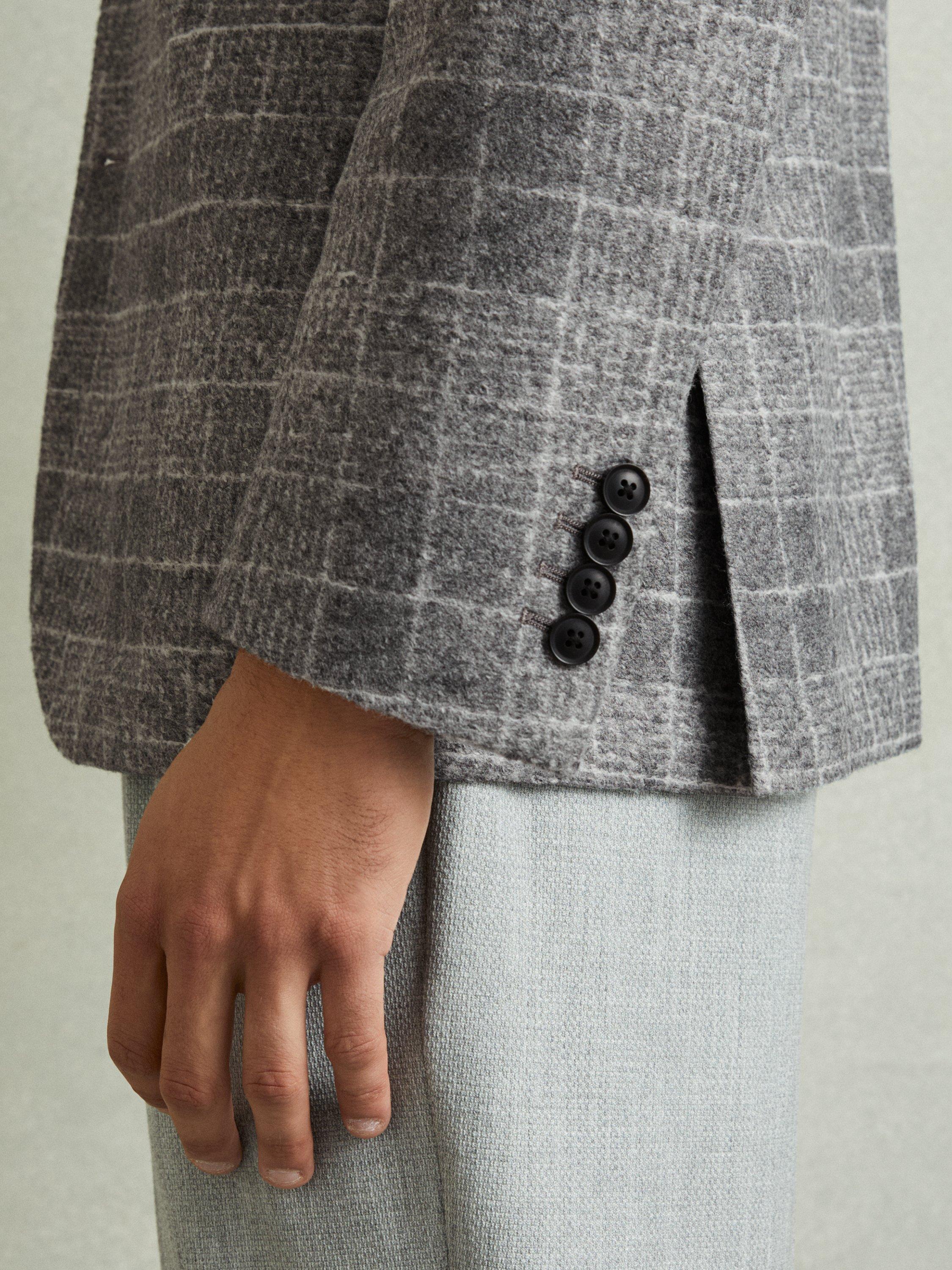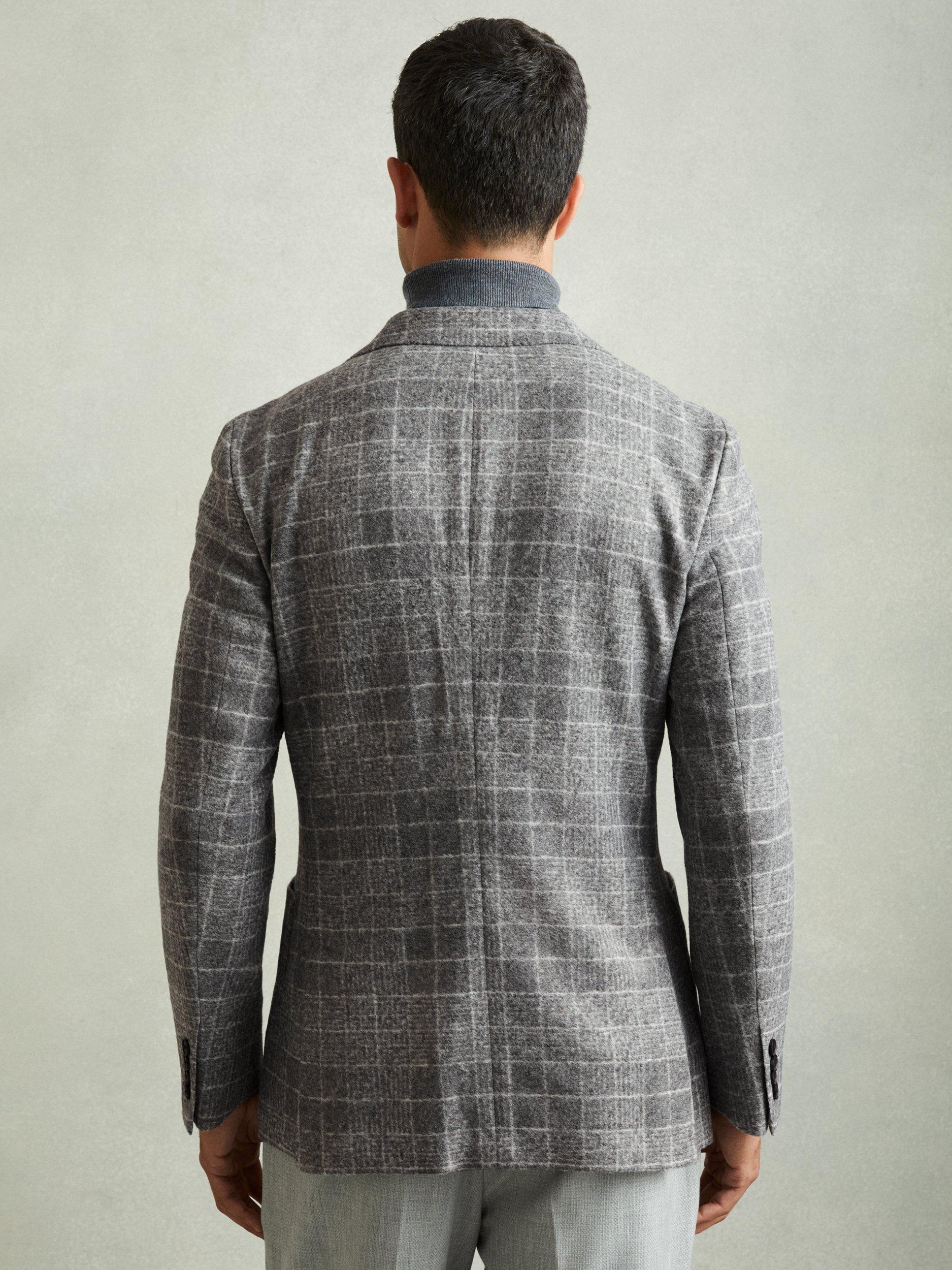 A brushed finish softens the magnified checks of the feel blazer, heightening its relaxed aspect. Tailored without a lining or canvassing to complement the unstructured shoulder line, it’s patched with pockets and cut with curved quarters.
