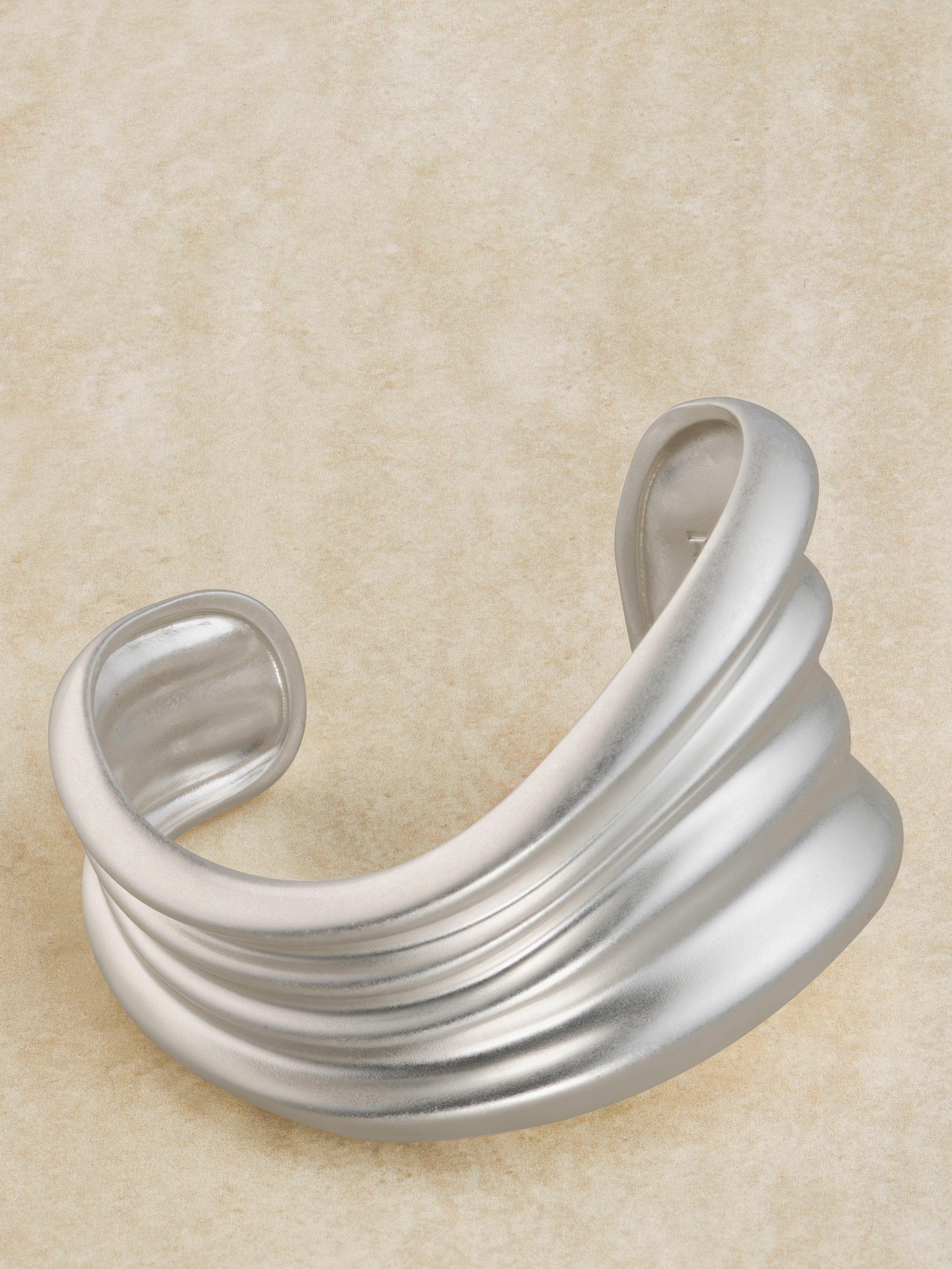 Reiss's Florence cuff has sleek, fluid lines and wraps elegantly around the wrist, mimicking the appearance of liquid metal. Its modern design creates a sophisticated look.