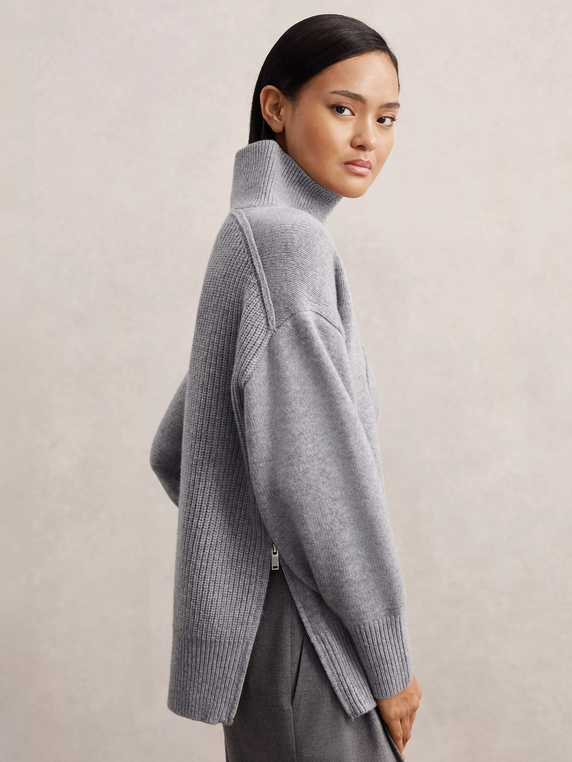 Made from pure wool, this medium-weight jumper features a funnel neck and zip fastening. It keeps you warm and comfortable, blending smart detail with everyday usefulness for your wardrobe. Perfect for layering on cooler days.