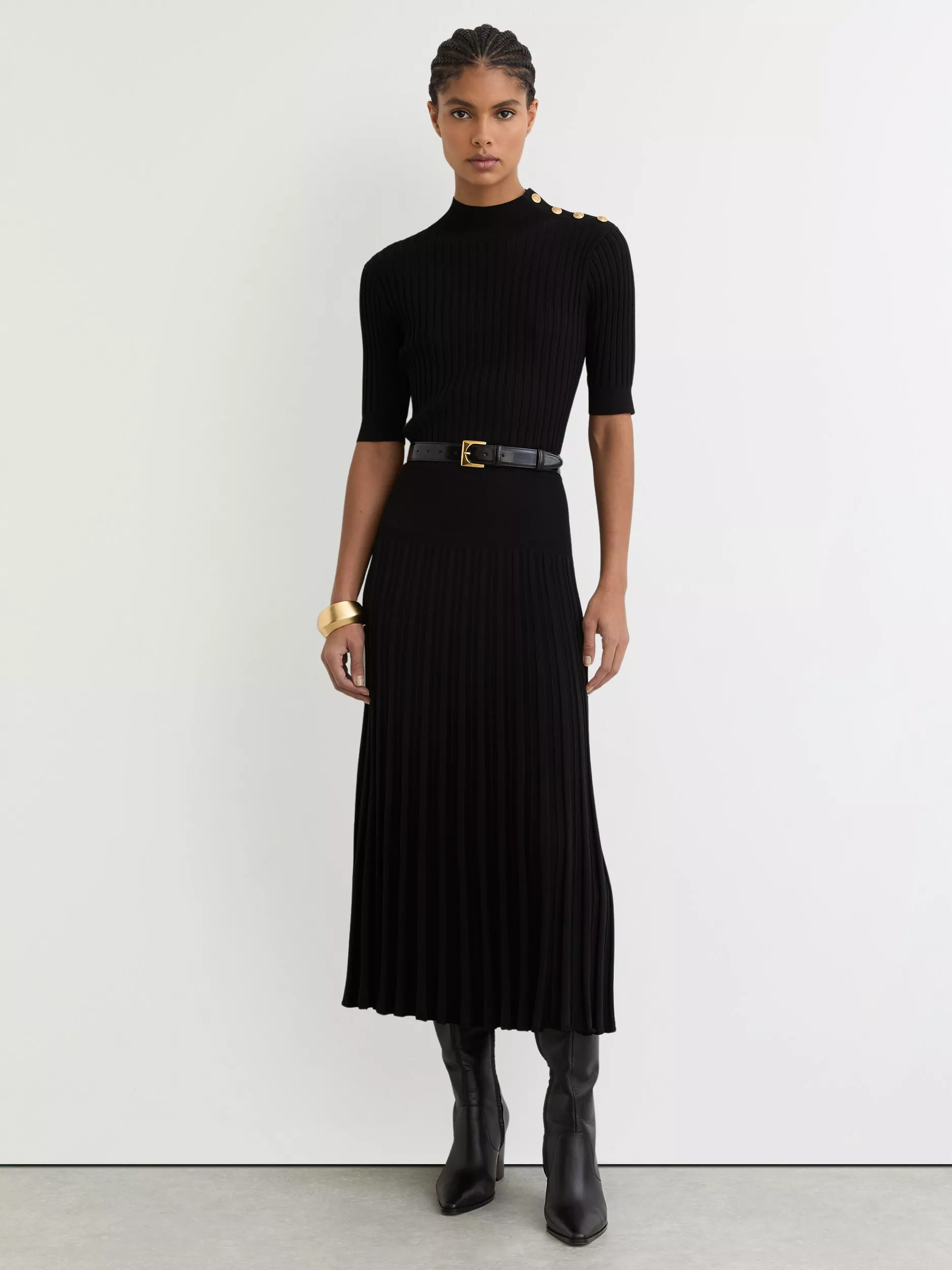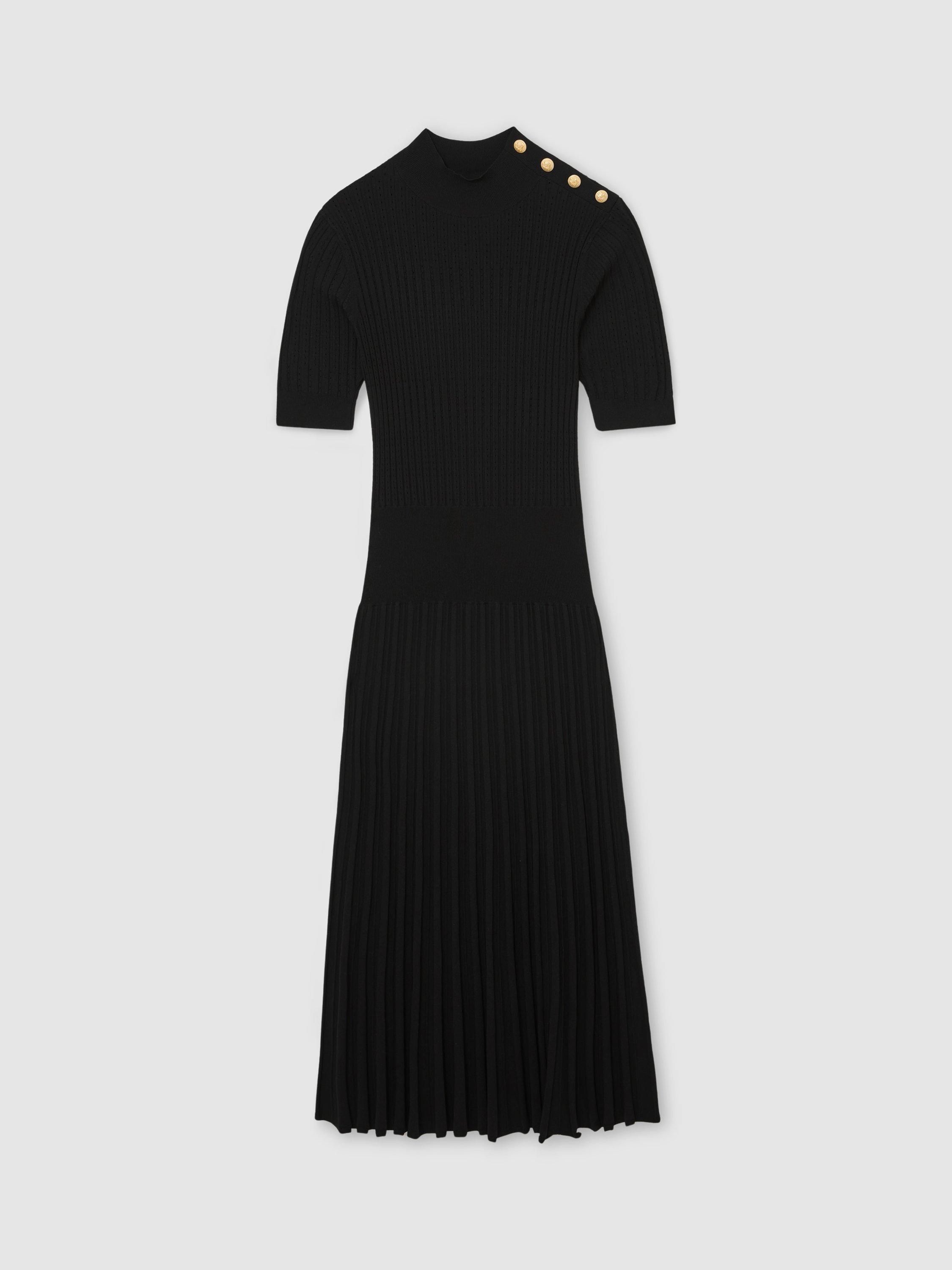 Because a fuss-free, A-line shape is always in style. This short sleeved, button shoulder midi dress by Reiss has a funnel neck and a lightly textured finish.