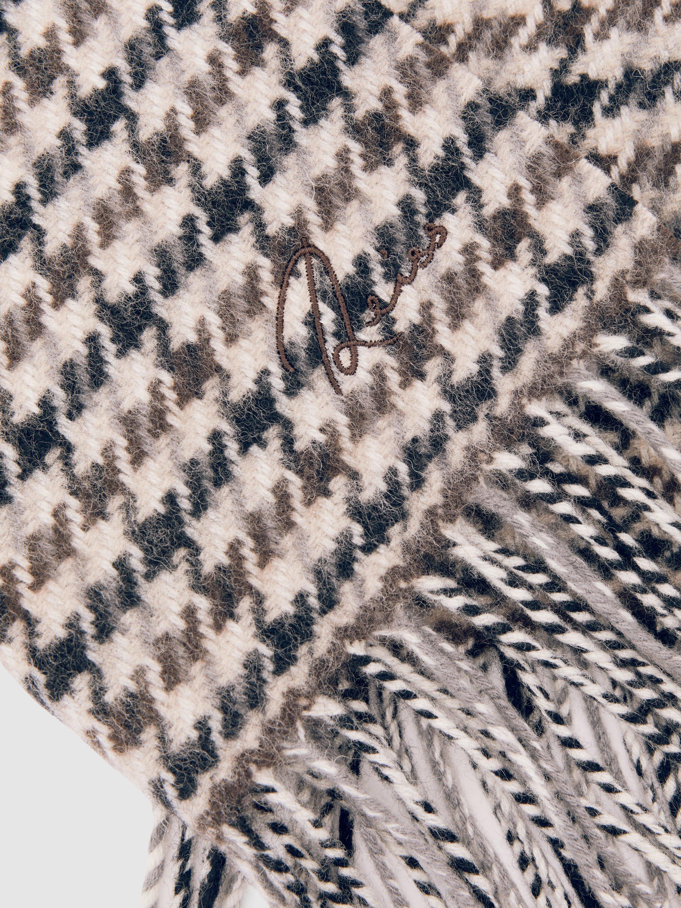 A houndstooth-patterned wool blend scarf with luxurious cashmere in the mix. Its soft touch keeps you comfortable, and its striking pattern adds sharp detail to your outfit.
