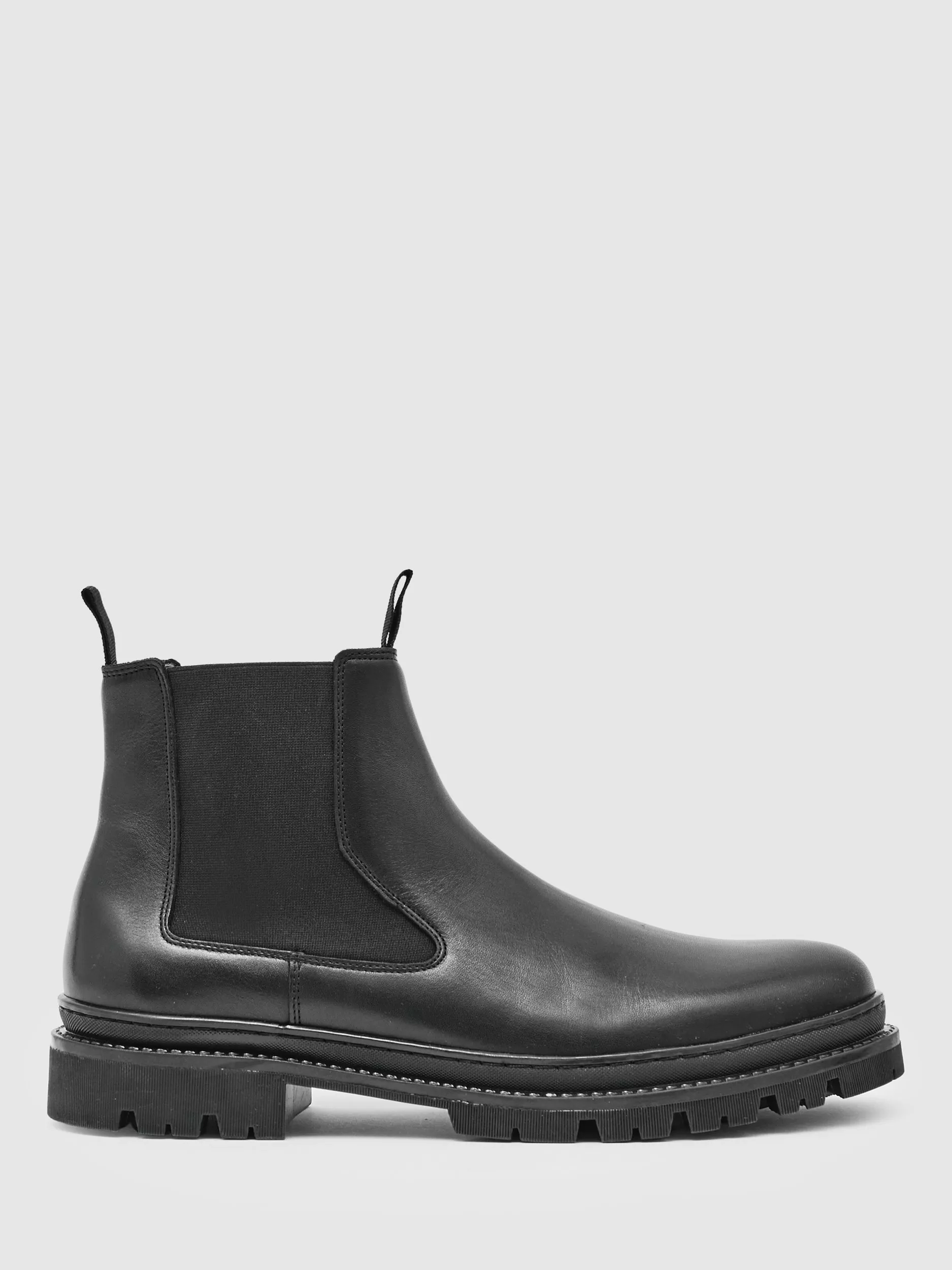 Reiss Chelsea boots, designed with soft leather and a round toe for everyday comfort. They slip on easily, blending style and practicality for your versatile, casual looks.