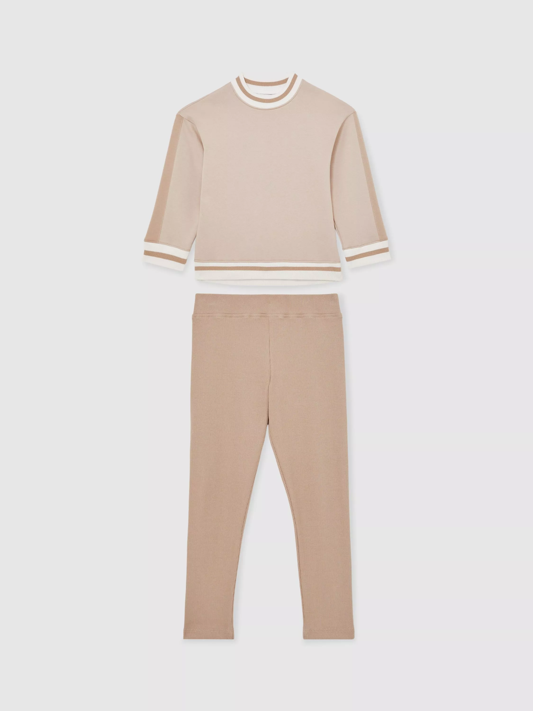 This tracksuit set brings versatility and effortless style to daily routines. With a striped tipped sweatshirt and matching ribbed leggings, it offers comfort and flexibility.