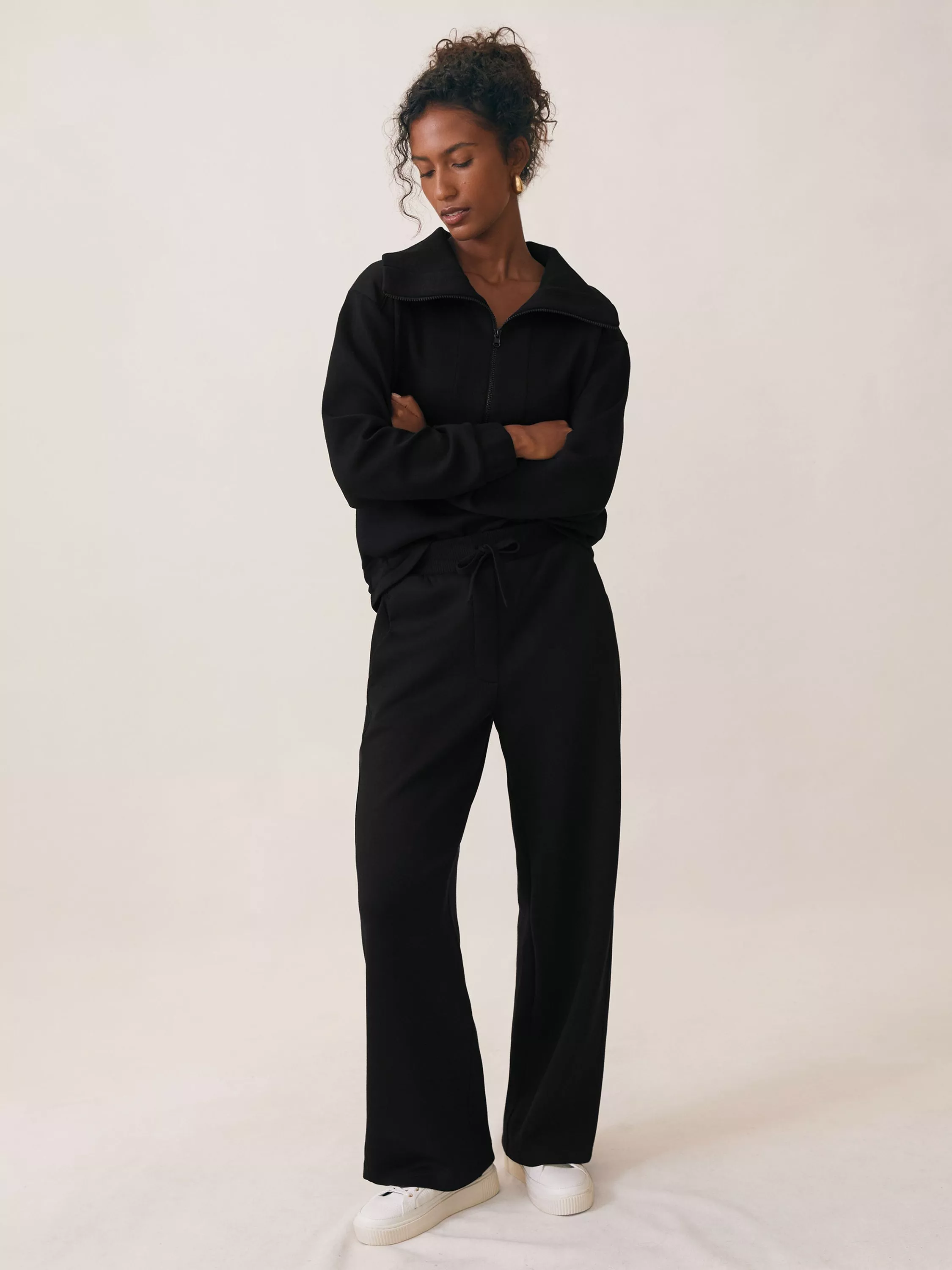 A pair of confident, exaggerated wide-leg joggers from Reiss. They sit mid rise with a drawstring at the waist and a regular length.