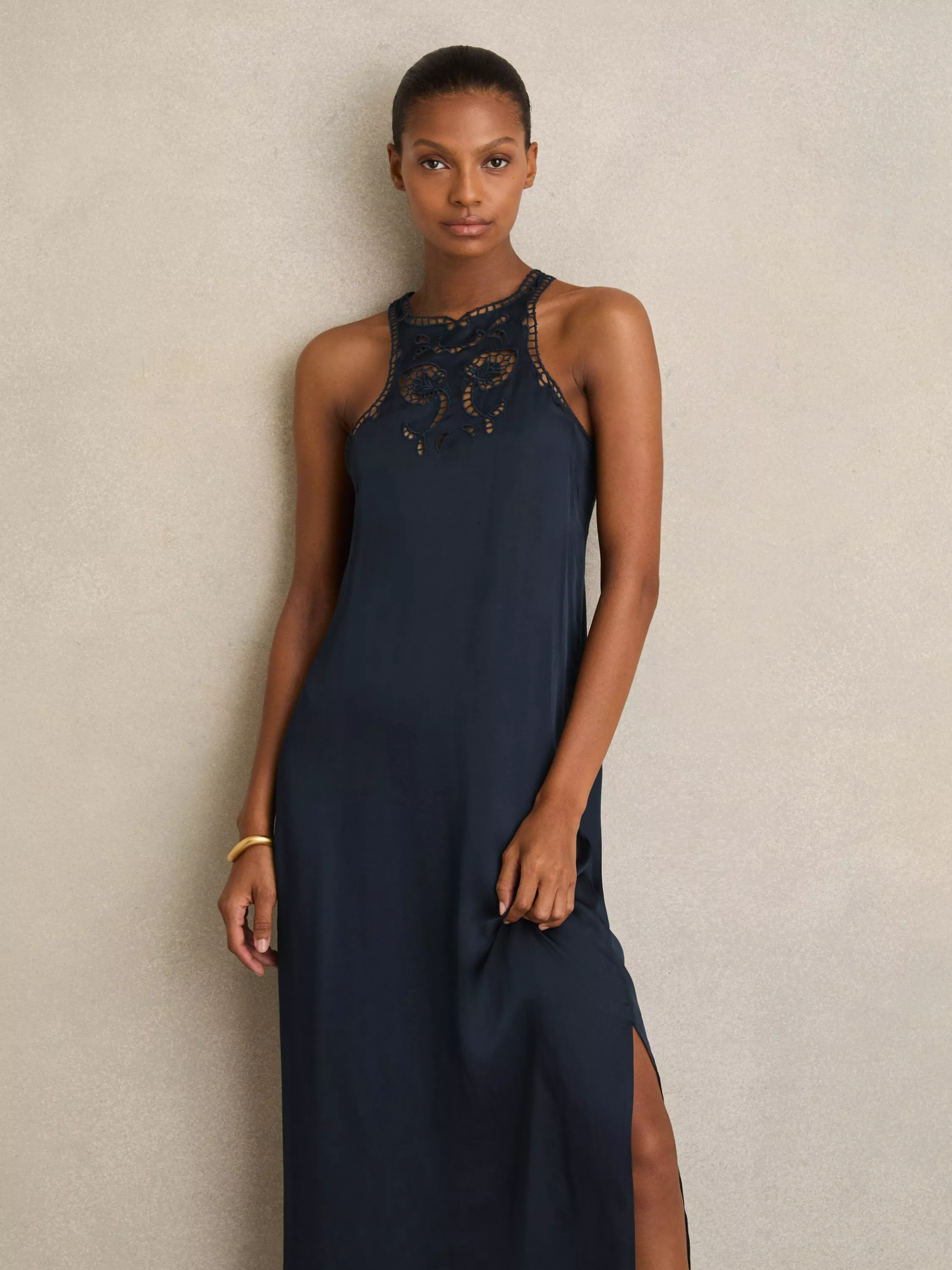 In a straight silhouette that skims the frame, this midi dress from Reiss is made from smooth viscose with a cutout embroidered round neck.