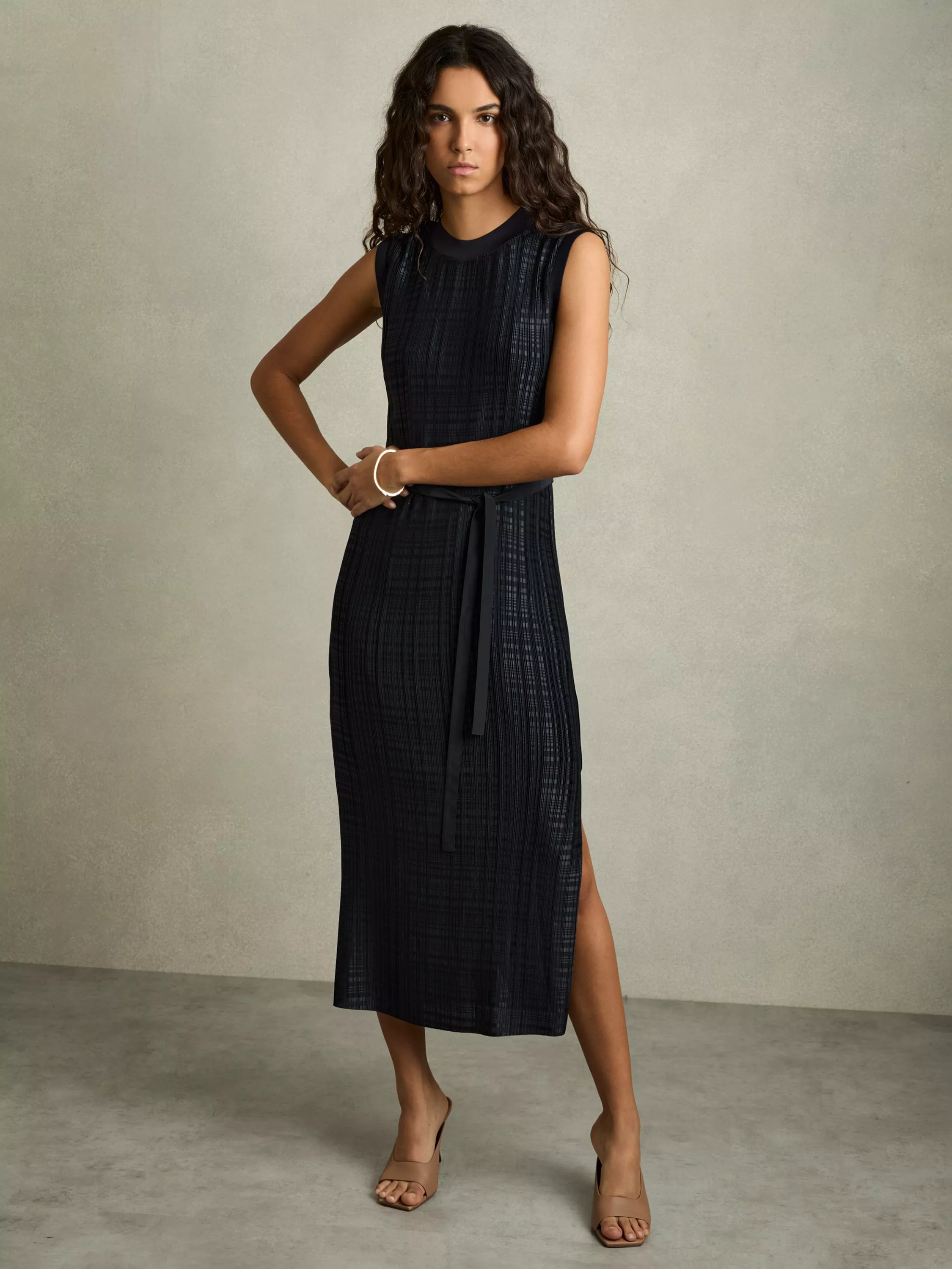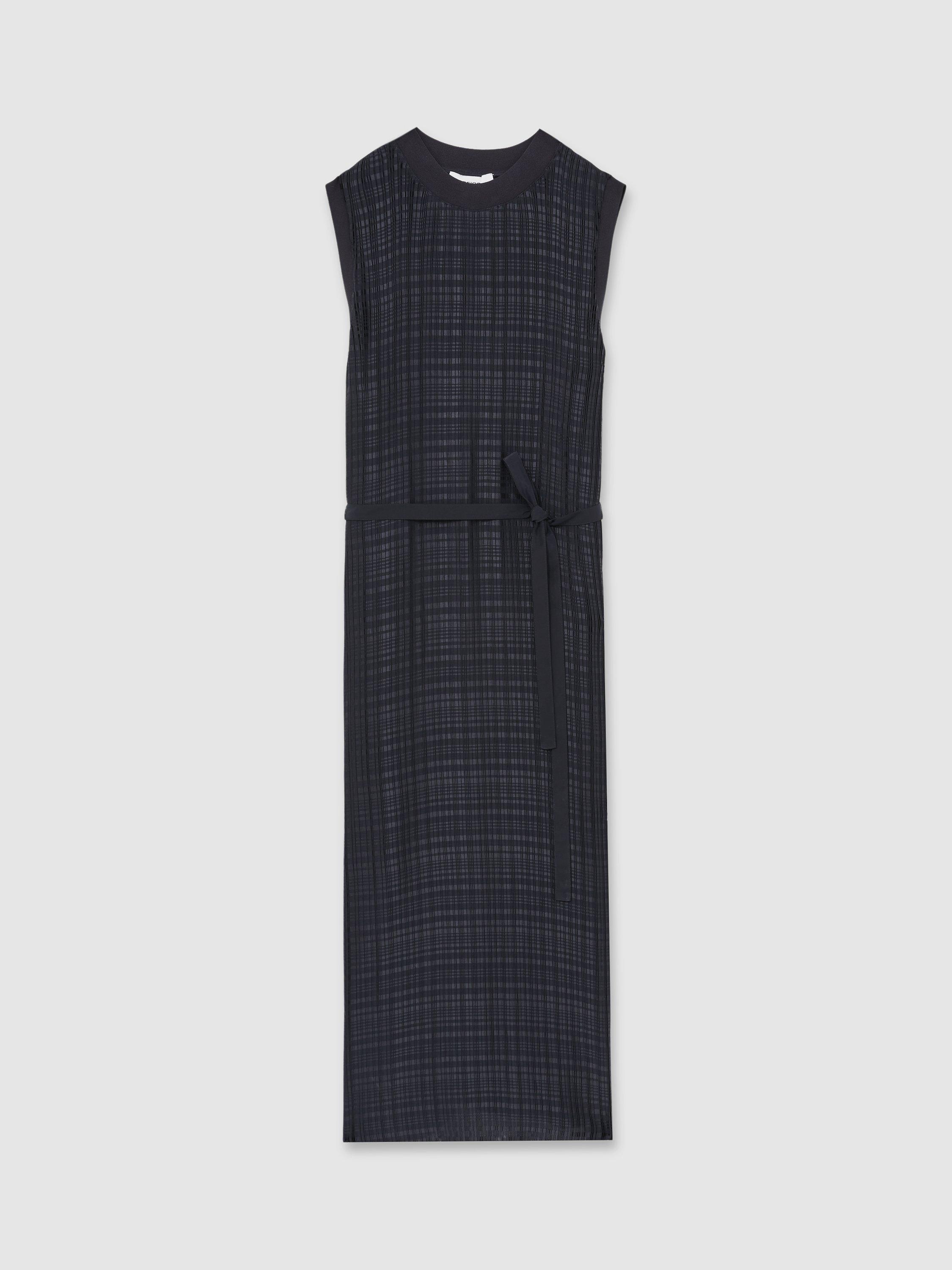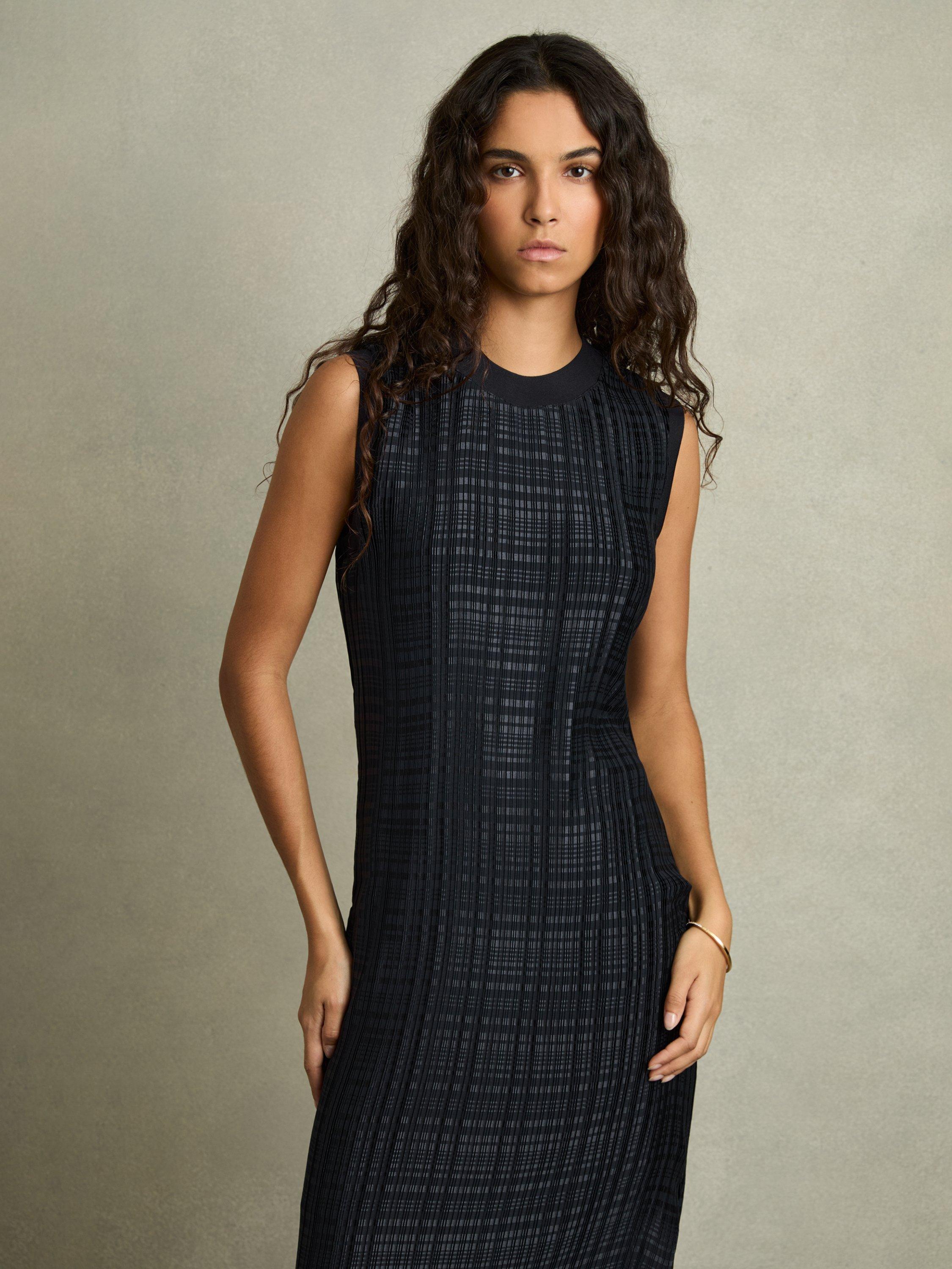 Offered in a elegant, straight shape with pretty pleating, this midi dress from Reiss is made from a softly knitted fabric. With a simple round neck, this sleeveless style comes in a neat check print with a skinny self-tie belt at the waist.