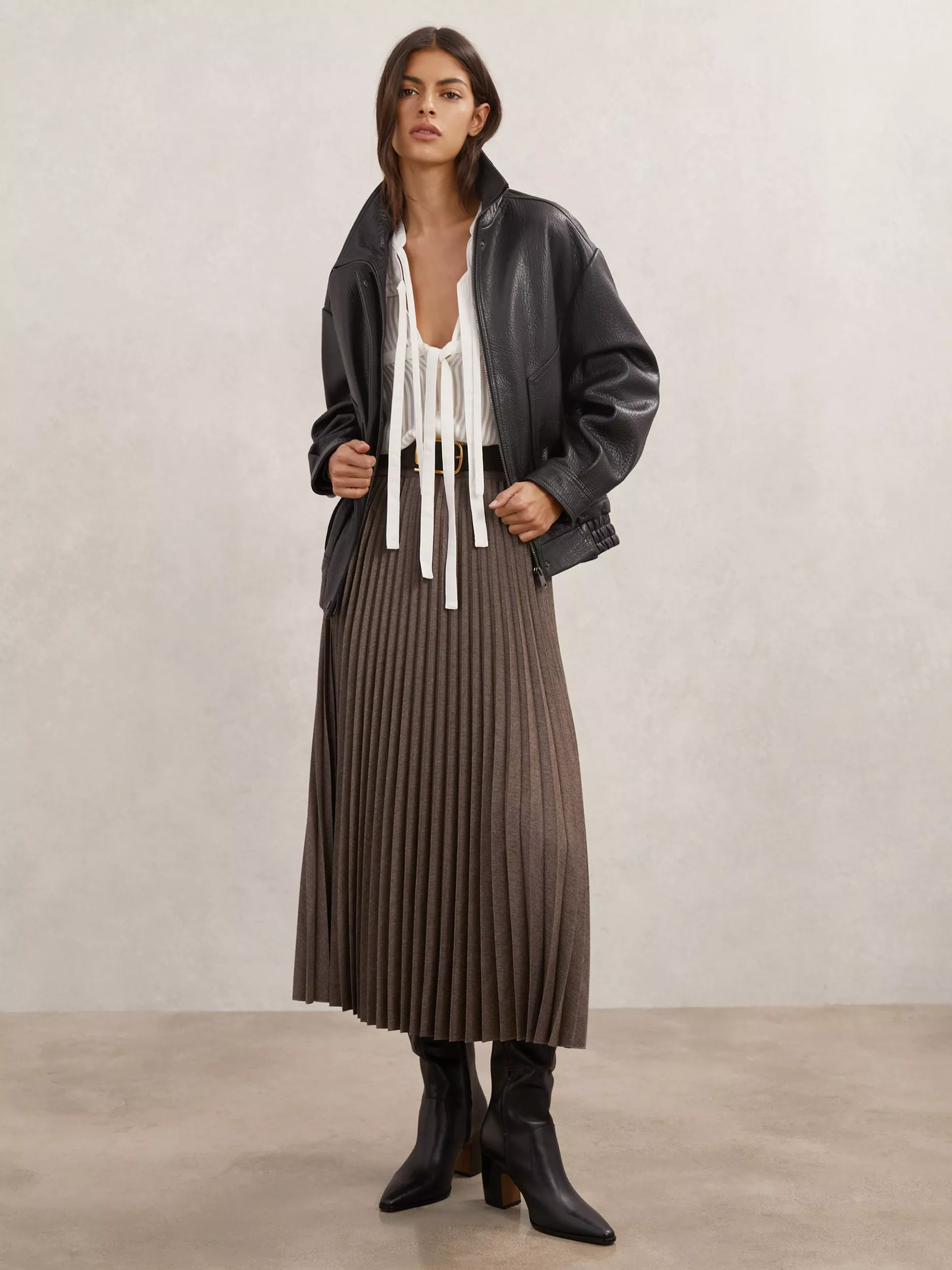Falling to a mid-length sweep, pull on this skirt by Reiss. A-line silhouette softened by pleats, it's finished with an elasticated mid rise waist.