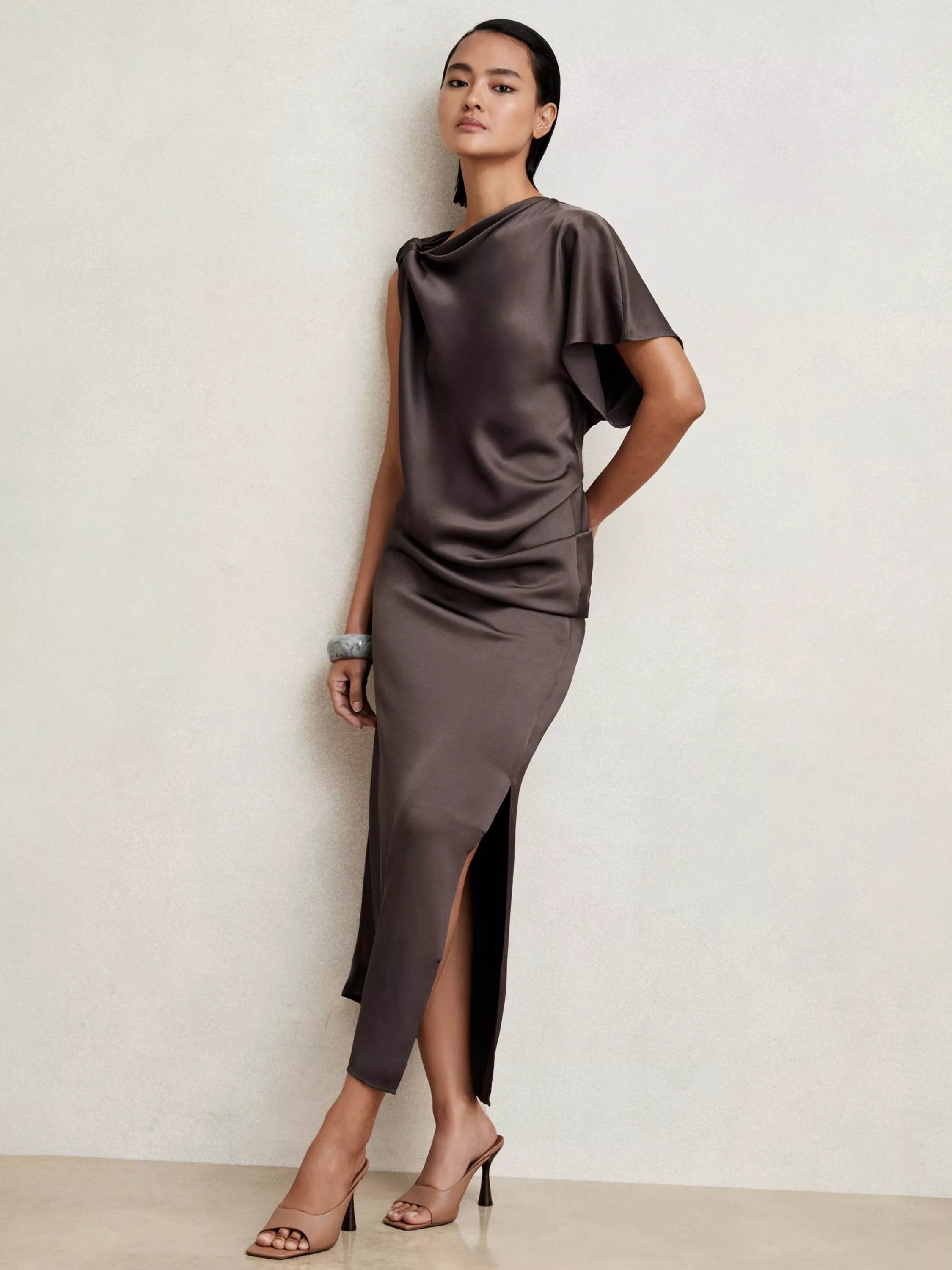 This Reiss midi dress is expertly draped with a modern cowl neck and short sleeves, designed to flatter and move with you. Effortlessly refined, it’s an ideal companion for evening plans that deserve a little extra spark.
