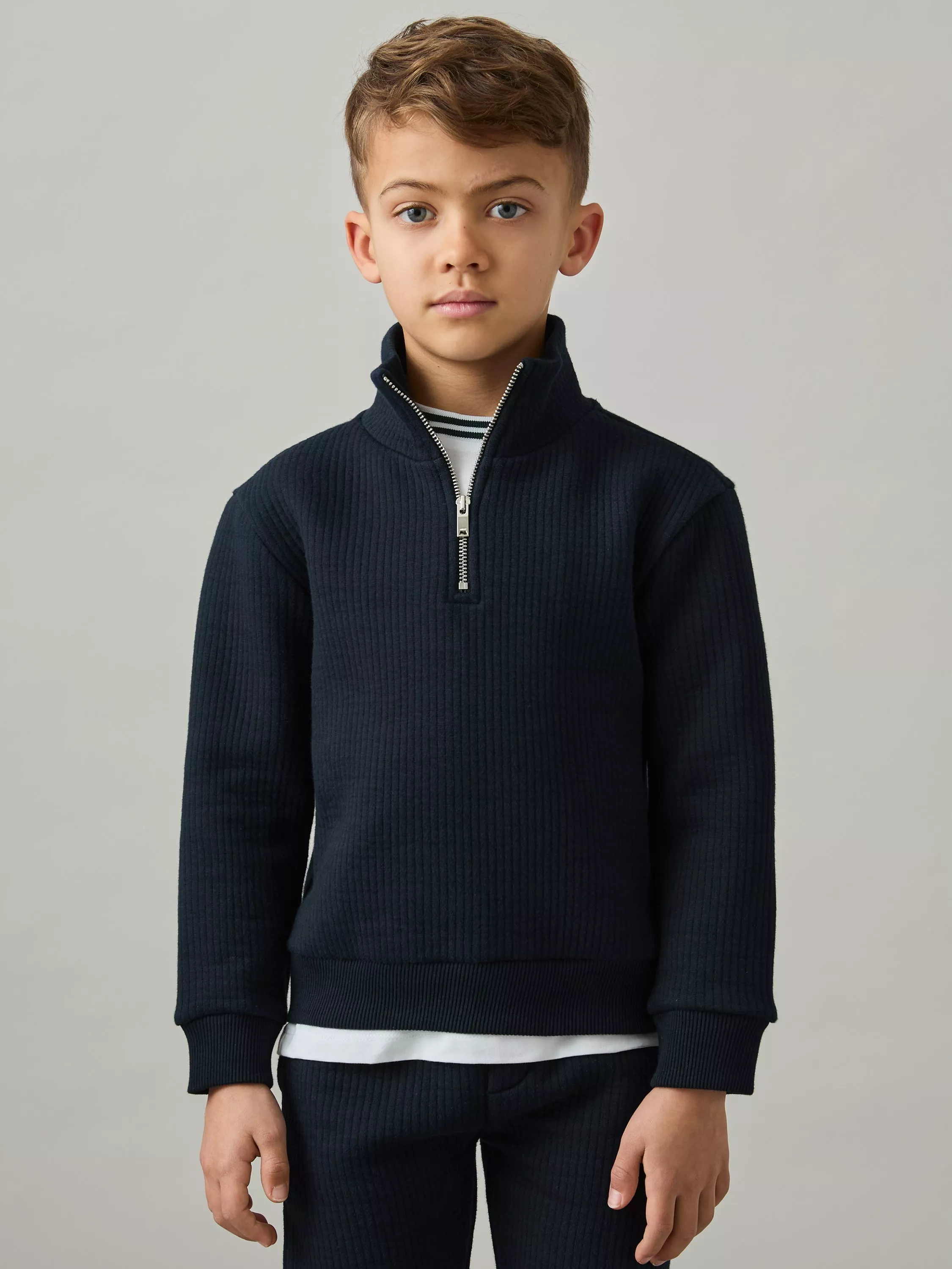 The Ashby jumper is a refined layering staple, crafted form a soft cotton blend with a rib-knit texture for subtle depth. Its funnel neck and half-zip design offer a sleek, versatile finish, whilst ribbed trims ensure a polished look.