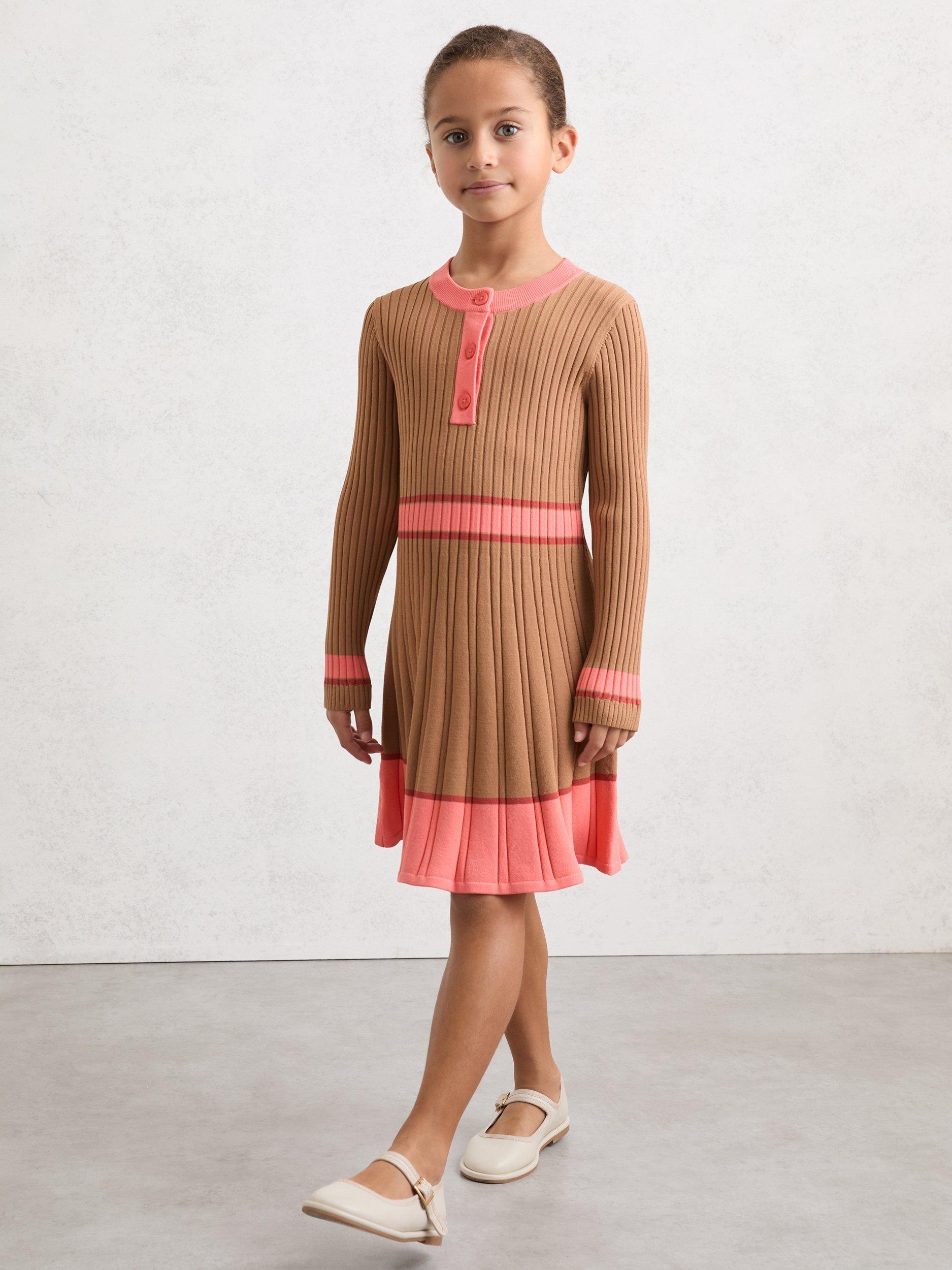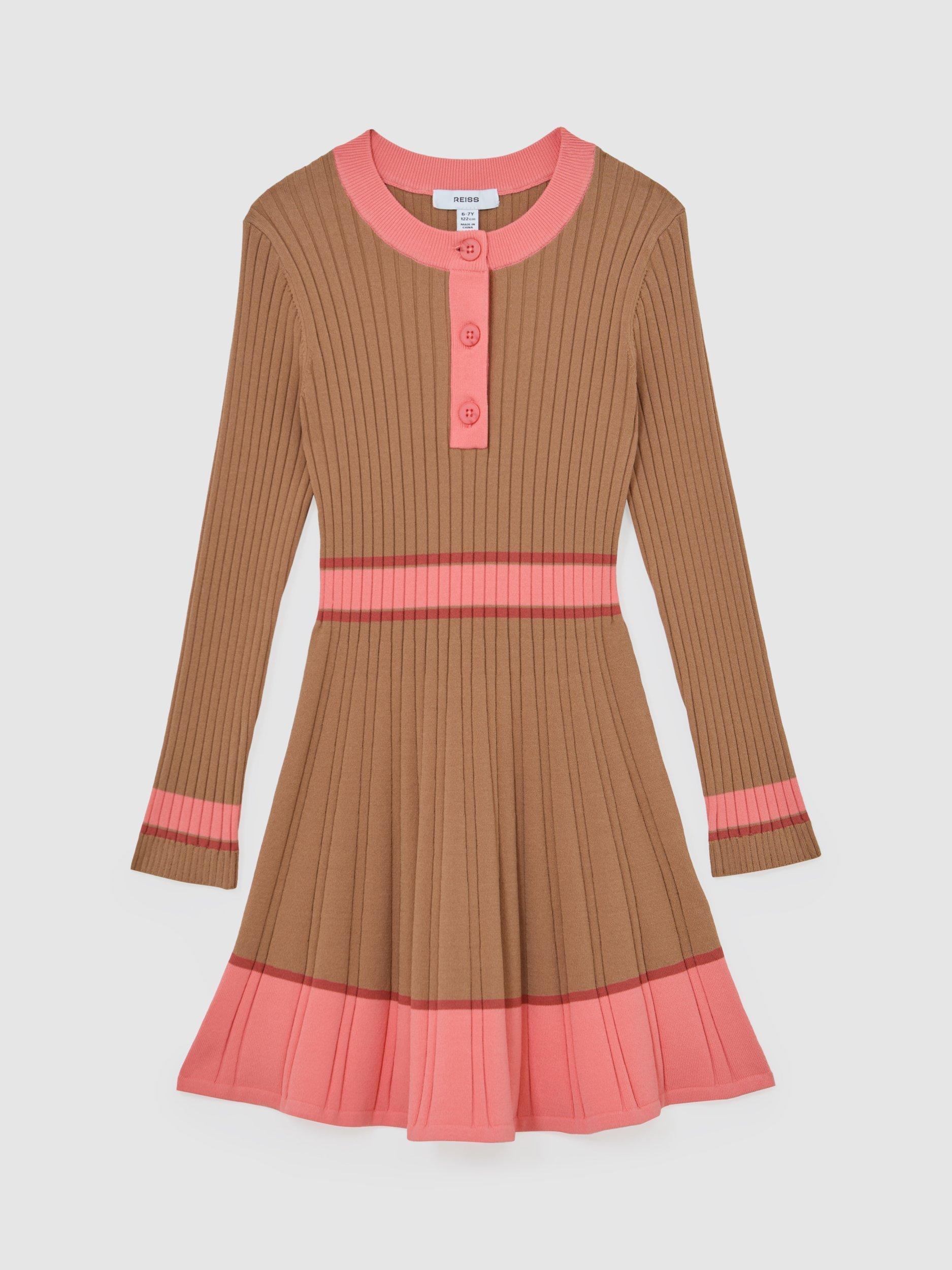 The Holly dress is defined by vibrant colour-blocking and a compact rib knit that widens towards the hem in a subtle flare. A high crew neckline, long sleeves and a short button-front placket refine the skater silhouette.
