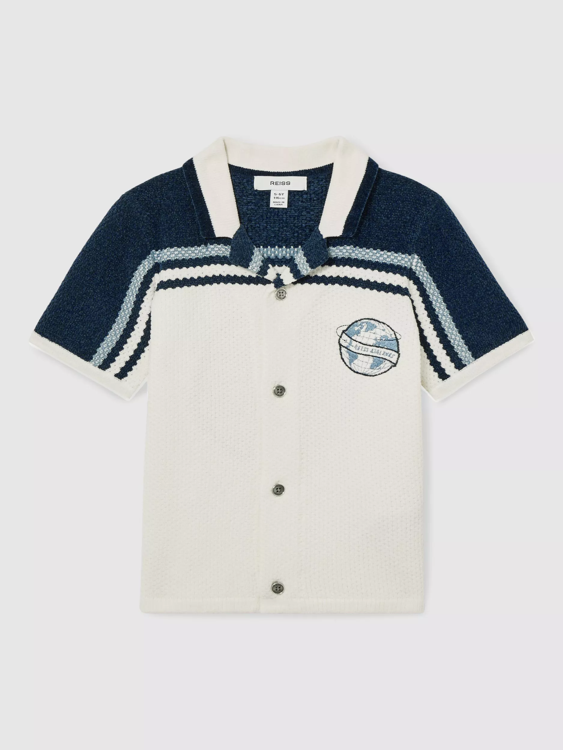 One for the mini jetsetters, this chenille, Cuban-style shirt comes with a global badge detailing.