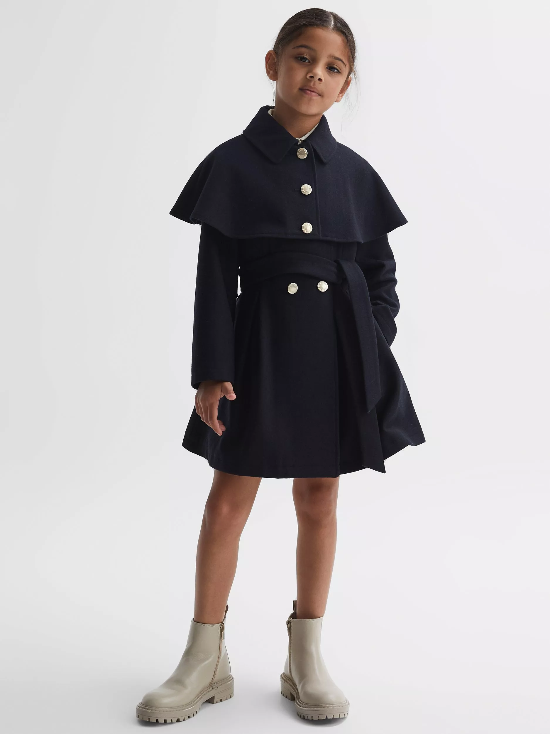 The rose coat in navy is inspired by a military aesthetic, as evidenced through its shoulder cape element and gold-tone hardware. Crafted from a wool blend, this timeless option will keep her warm and stylish throughout the cooler months to come. Secure with the waist belt and style as part of her everyday agenda.