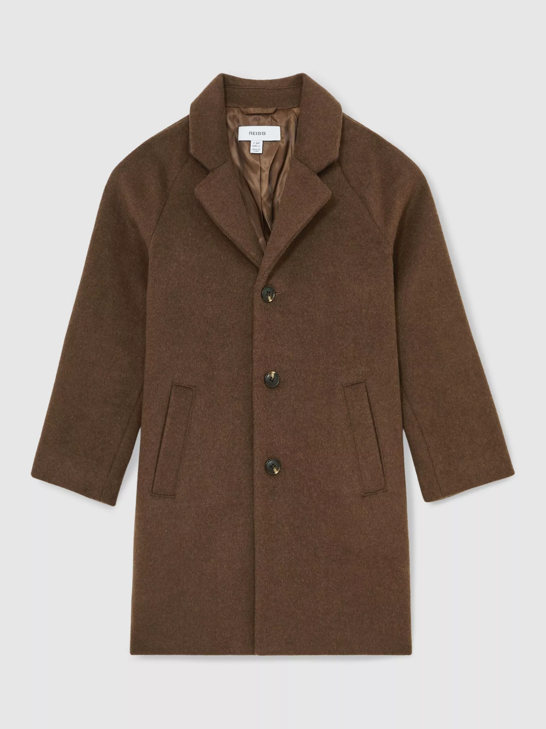 The light brown Wallace overcoat is softly tailored for a relaxed look. Raglan sleeves add to its sporty mood, while its wool-blend fabric and lining ensure that it’s a warm top layer.