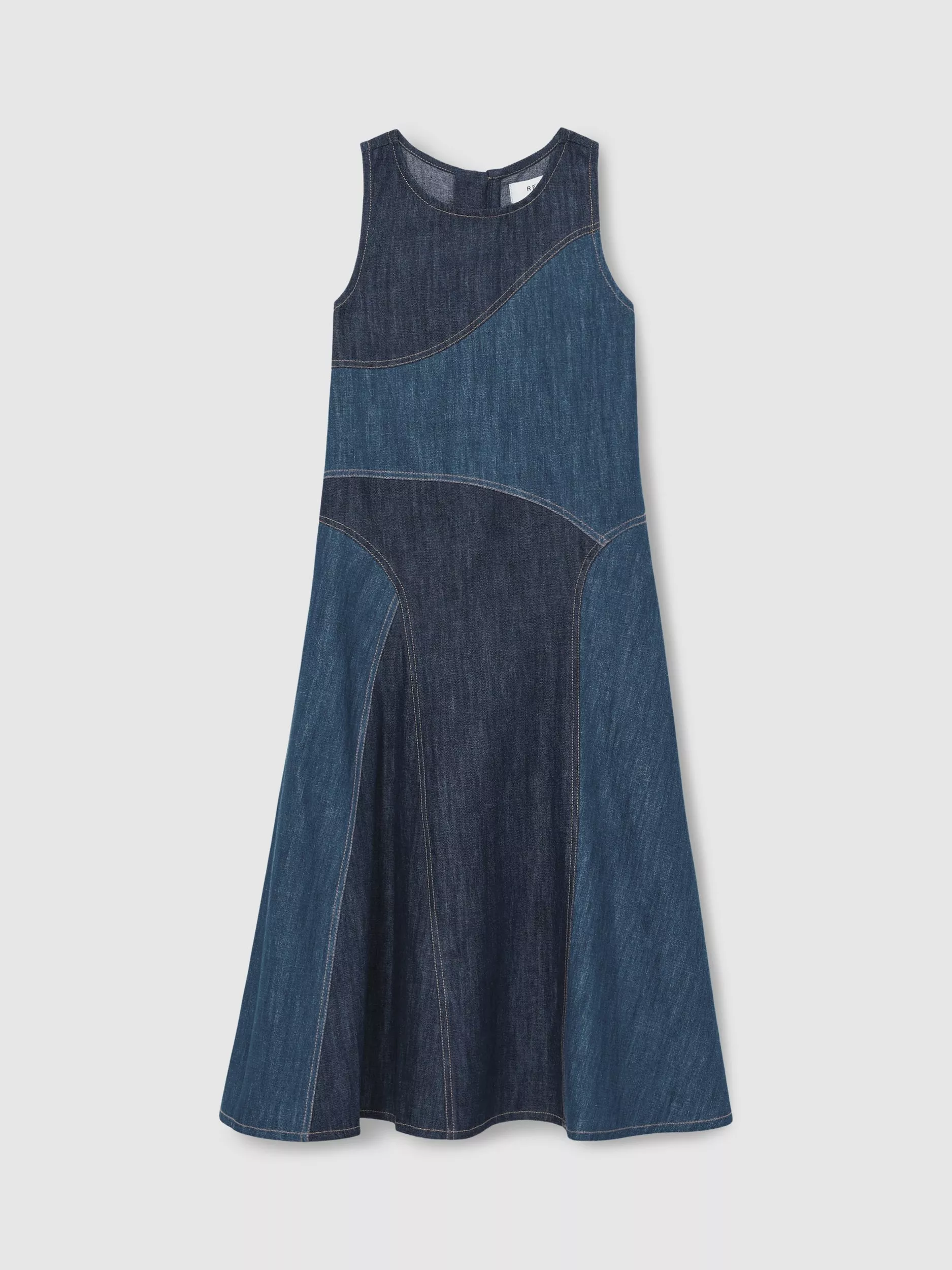 Building their basics, this sleeveless flared dress from Reiss is made from trendy patchwork washed denim for a durable, year-round choice.