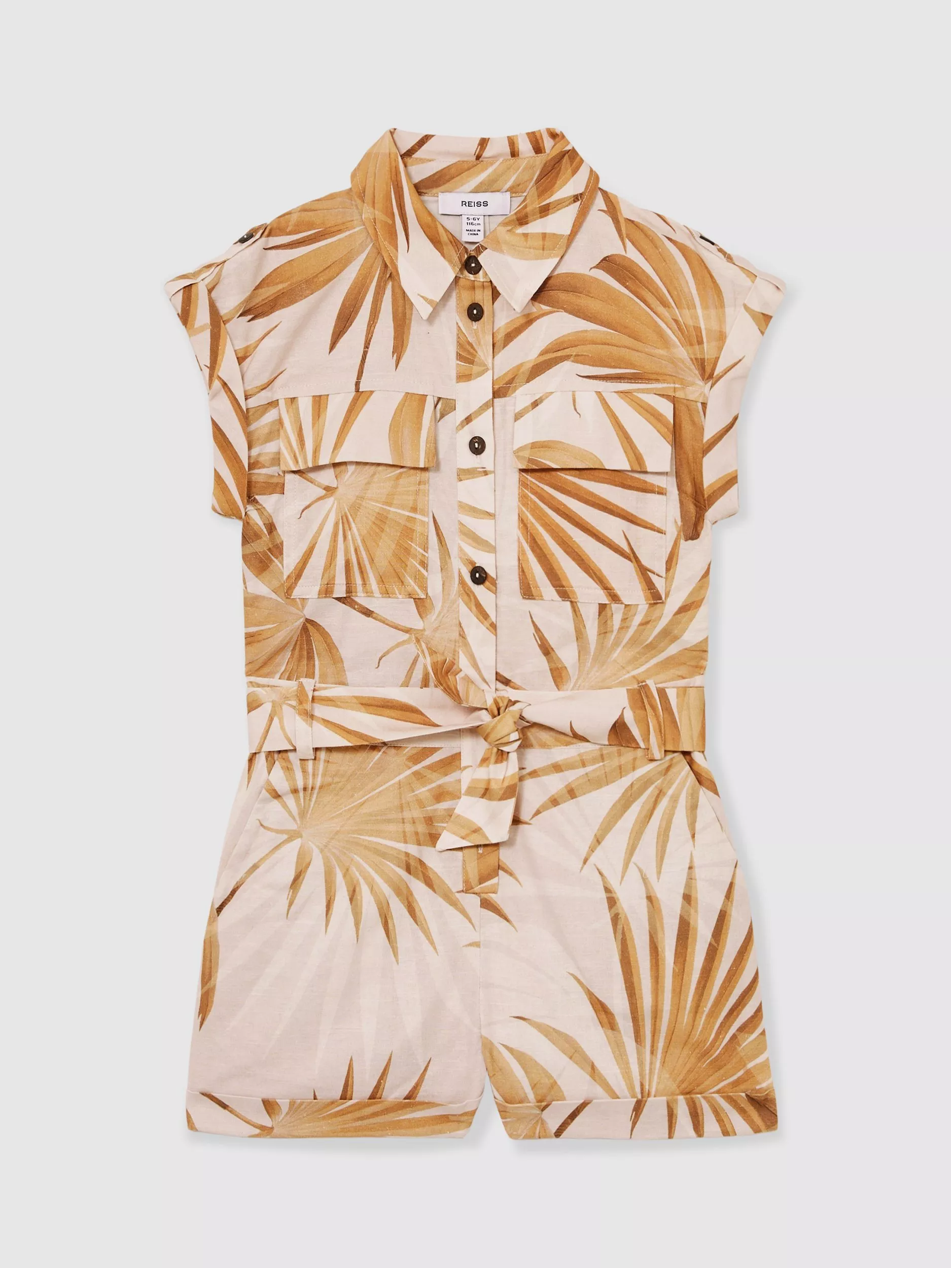 Perfect for the summer thanks to a cotton-linen blend, this belted playsuit comes with an all-over palm print design.