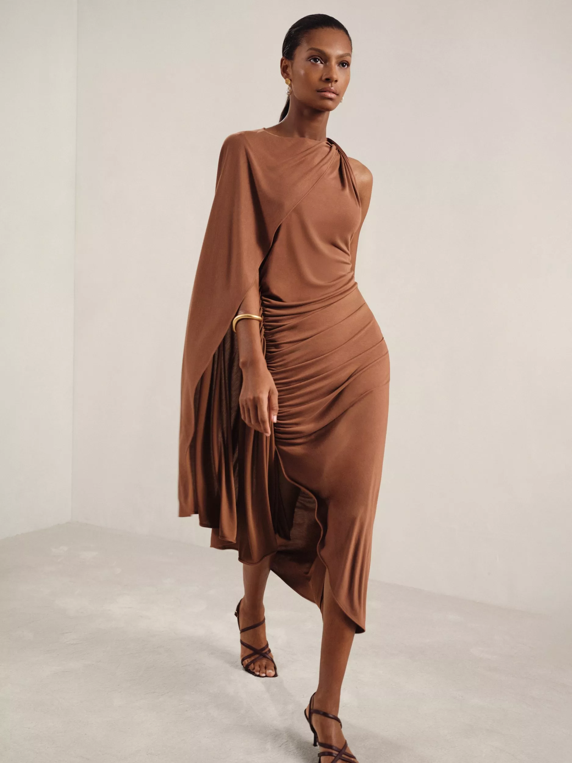 Defined by dramatic draping and ruching detailing through the body, this mid-length dress from Reiss features a twist detail round neckline and an asymmetric cape that flows over one side.